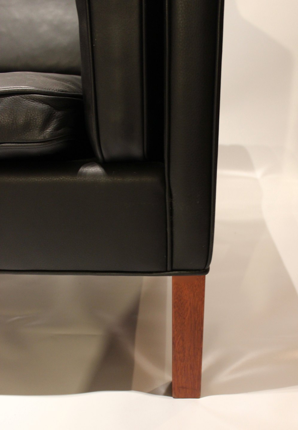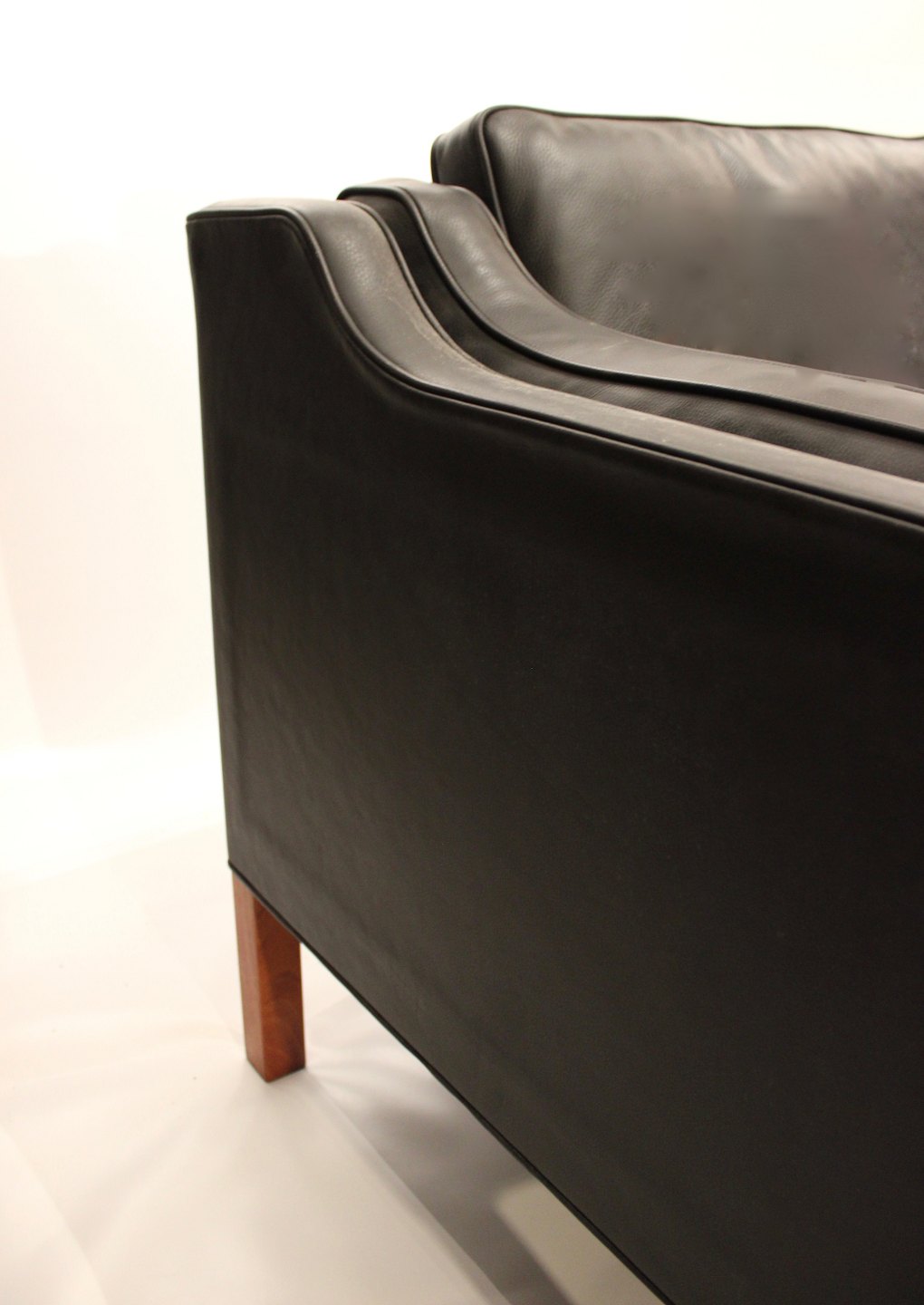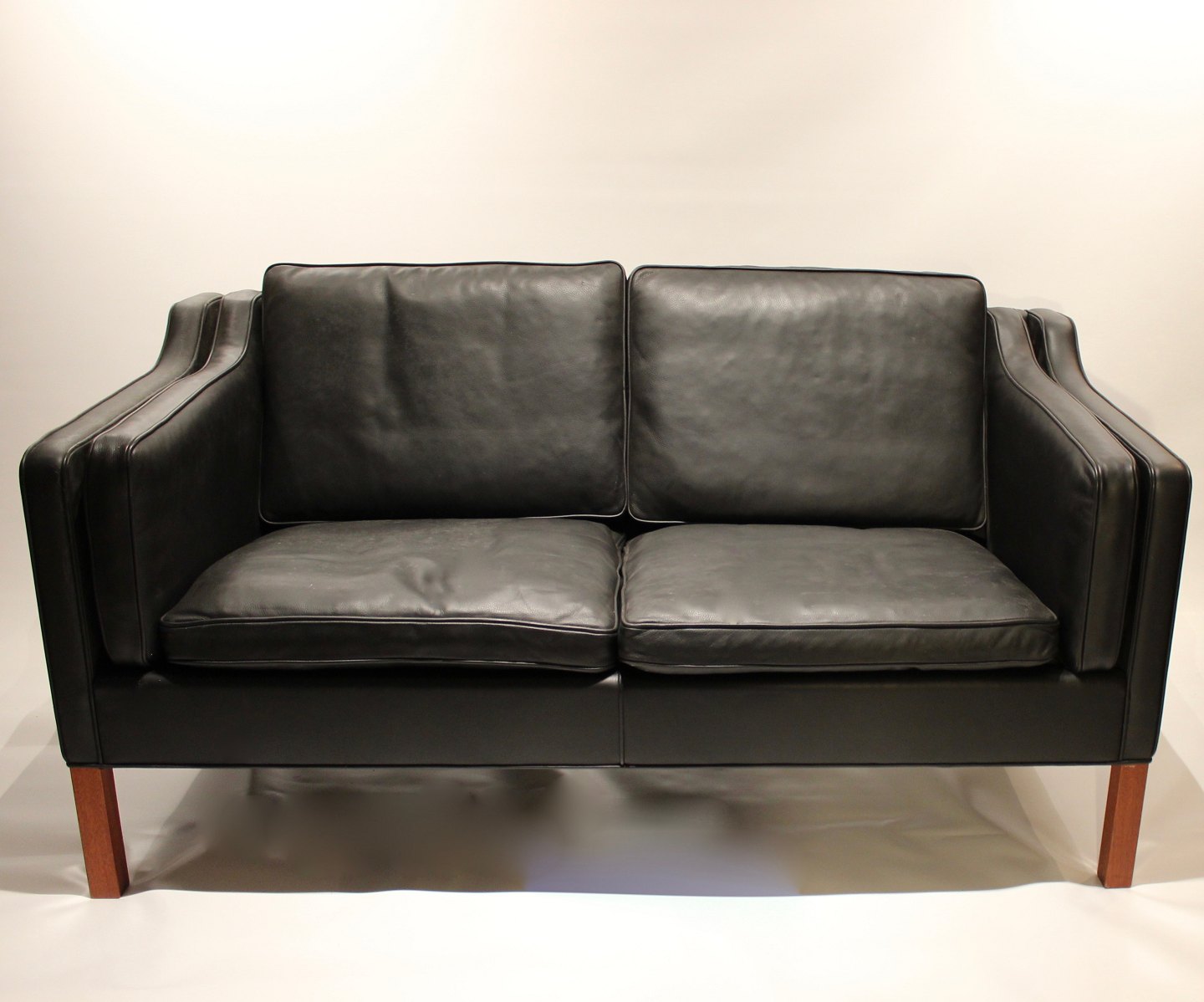 Sort læder 2 personers sofa med ben af mahogni, model 2212, designet af Børge Mogensen i 1962 og fremstillet af Fredericia Furniture i 1980erne. Vi har 2 stk. på lager.