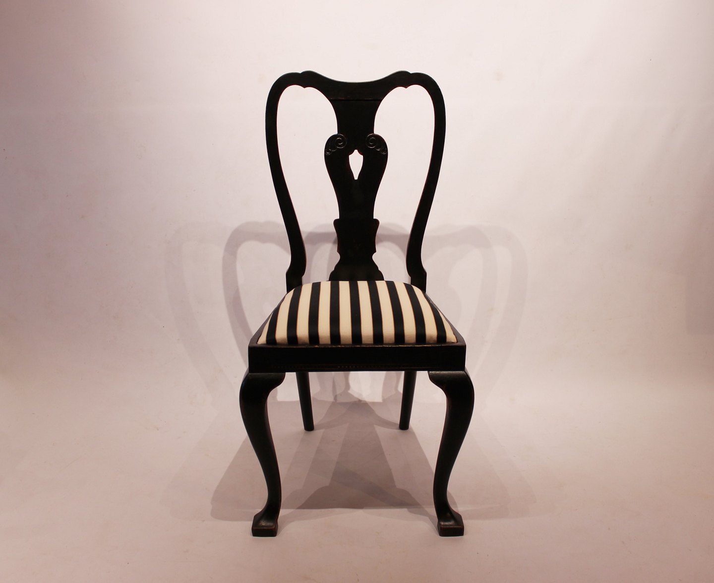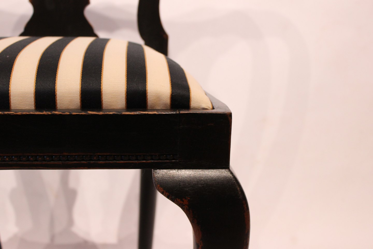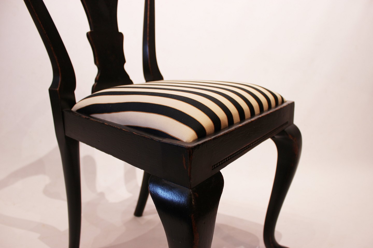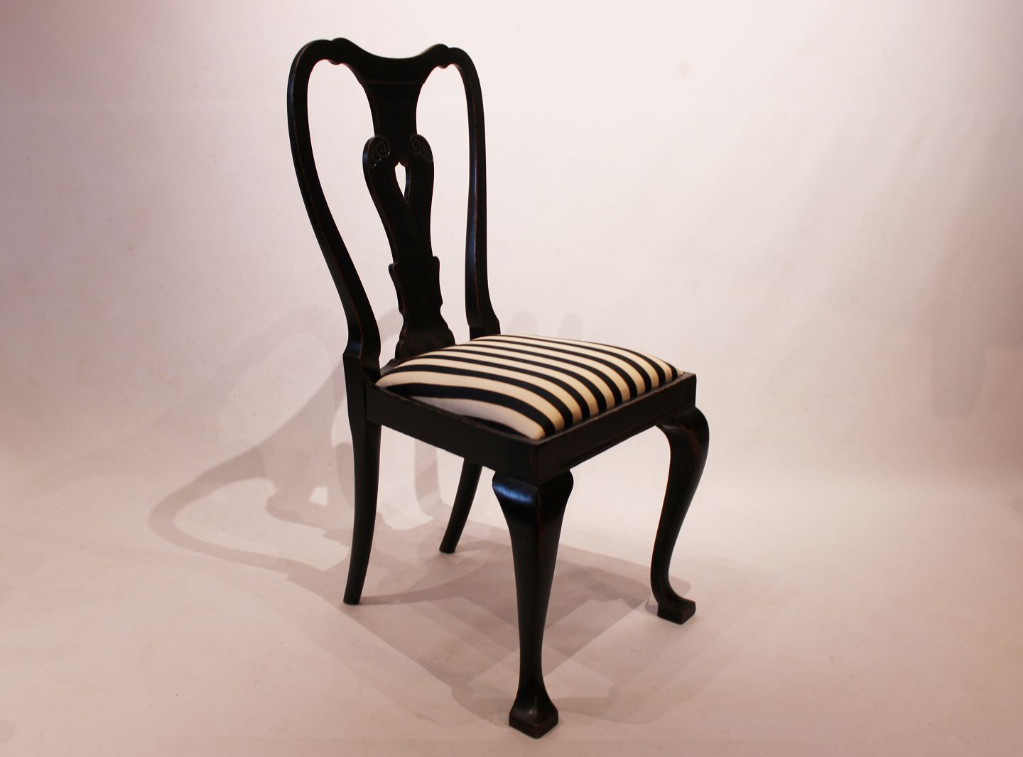 Sort malet spisestuestol i stilen Rokoko fra 1860erne. Stolen er i flot brugt stand og med stribet polstring.
