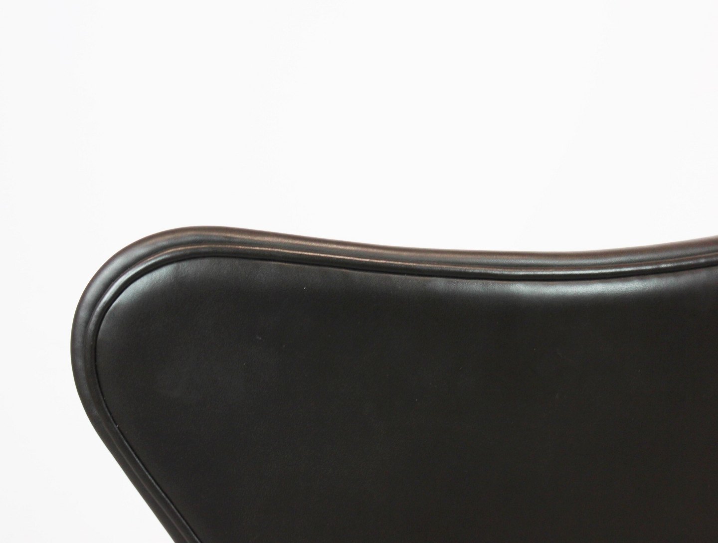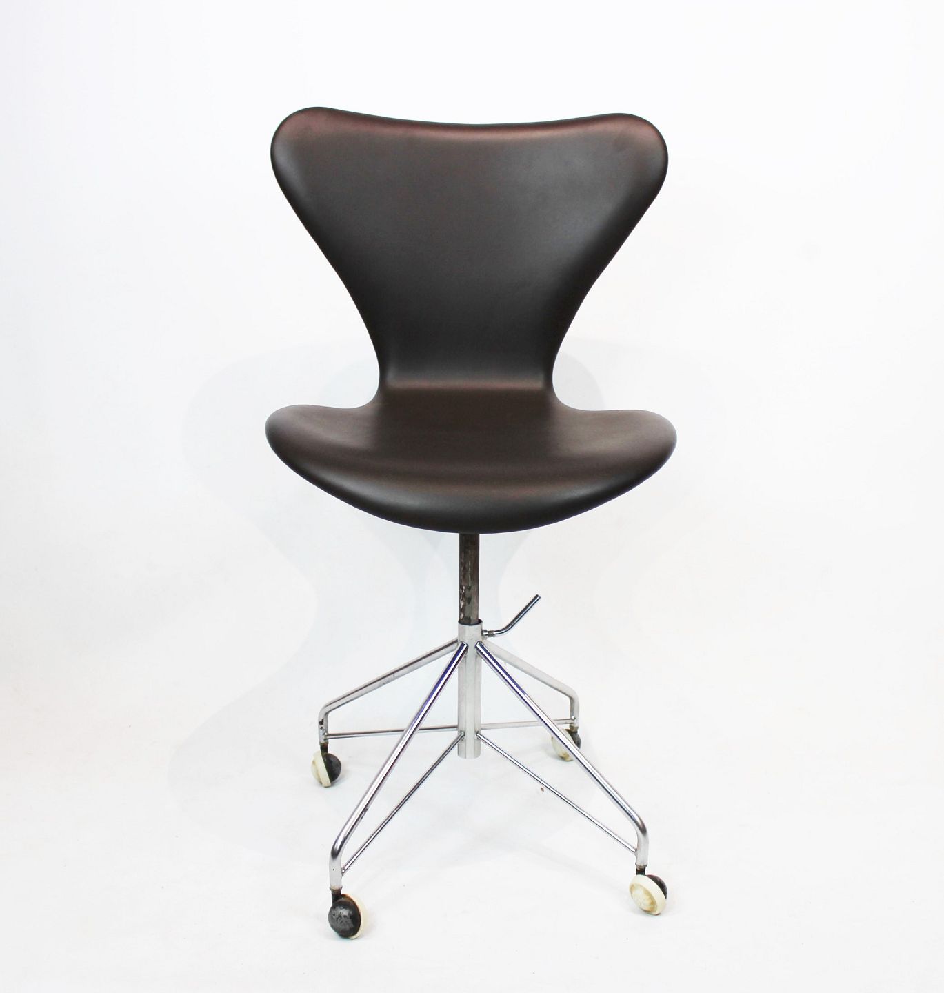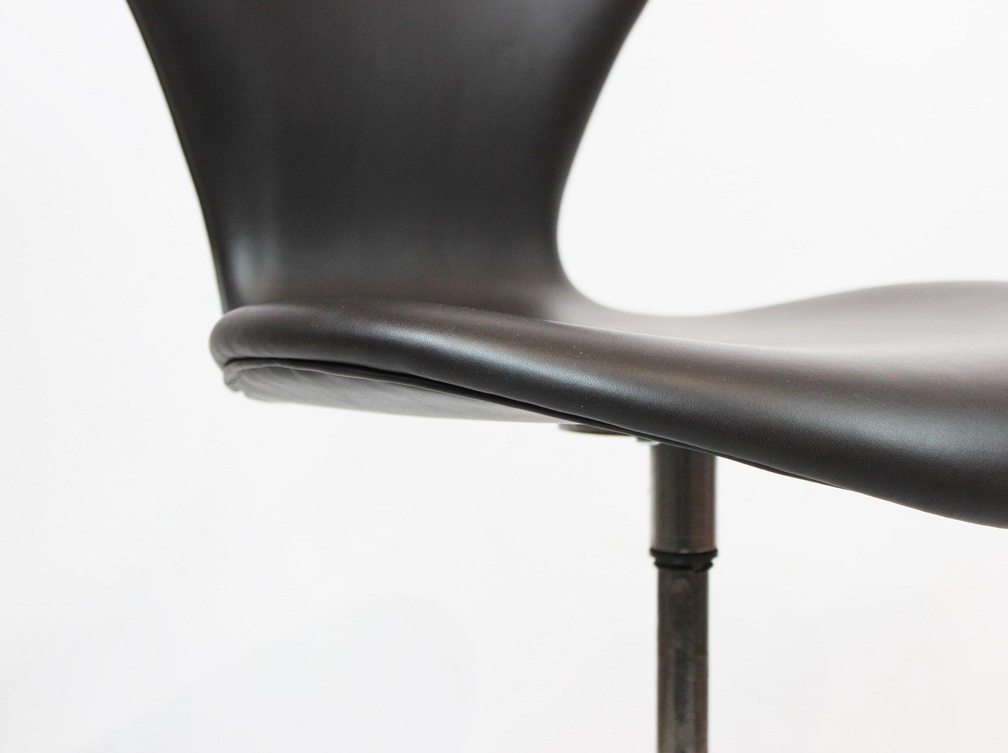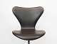 Syver kontorstol, model 3117, uden armlæn og drejefunktion designet af Arne Jacobsen og fremstillet af Fritz Hansen i 1950erne. Stolen er nypolstret med mørkebrunt savanne læder.