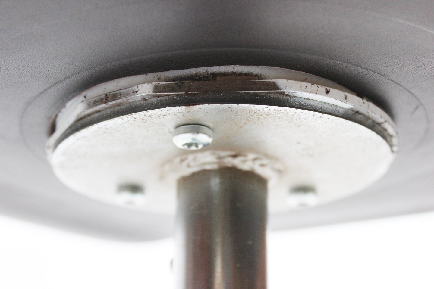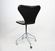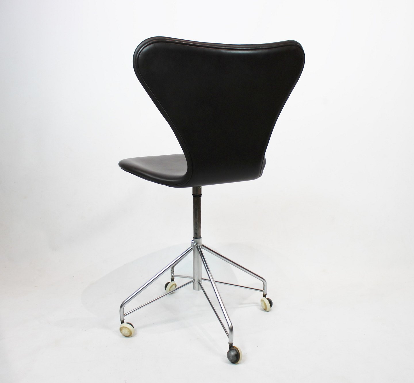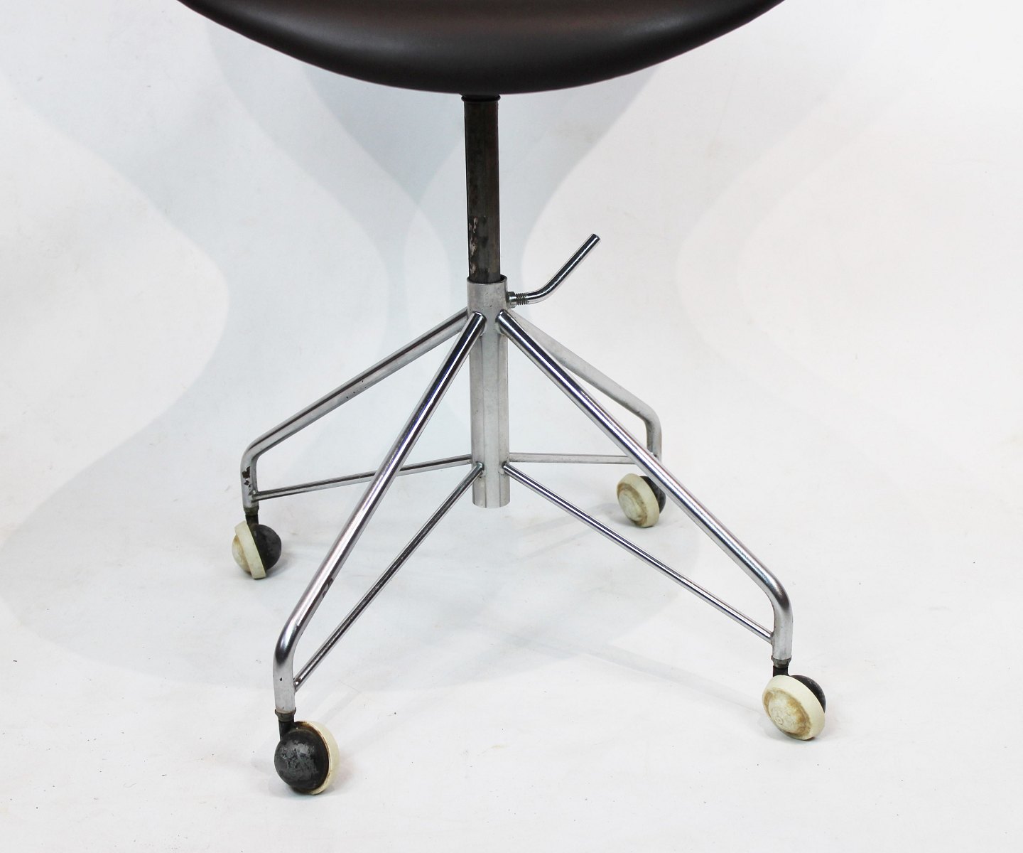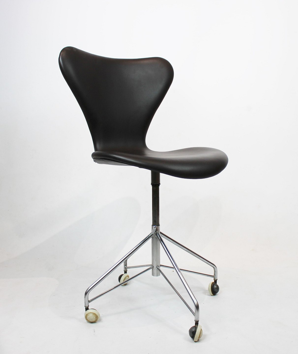 Syver kontorstol, model 3117, uden armlæn og drejefunktion designet af Arne Jacobsen og fremstillet af Fritz Hansen i 1950erne. Stolen er nypolstret med mørkebrunt savanne læder.