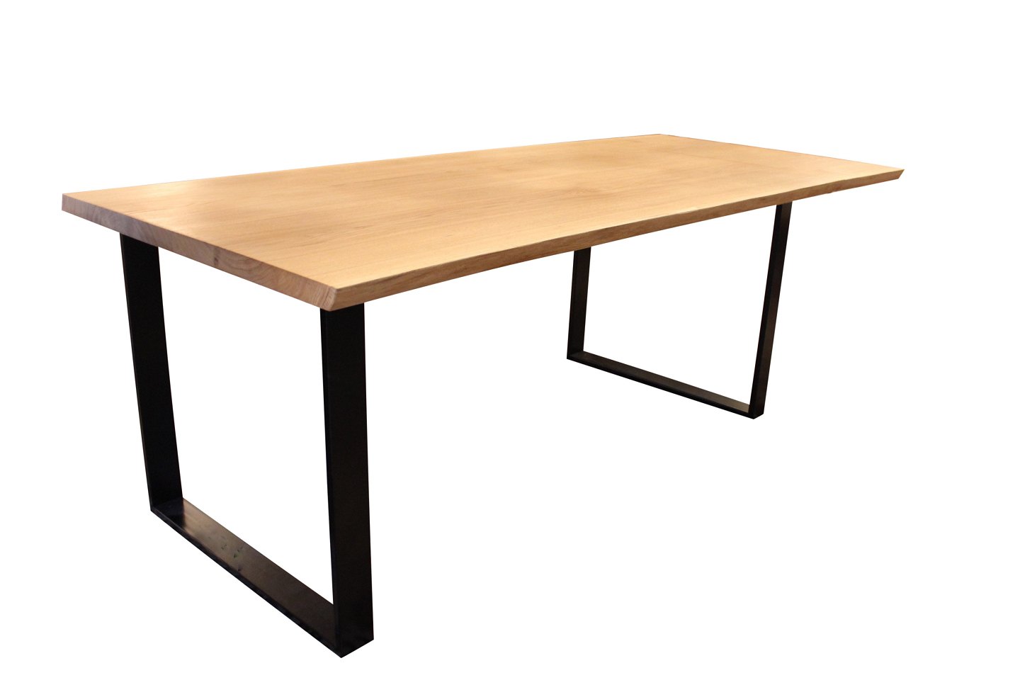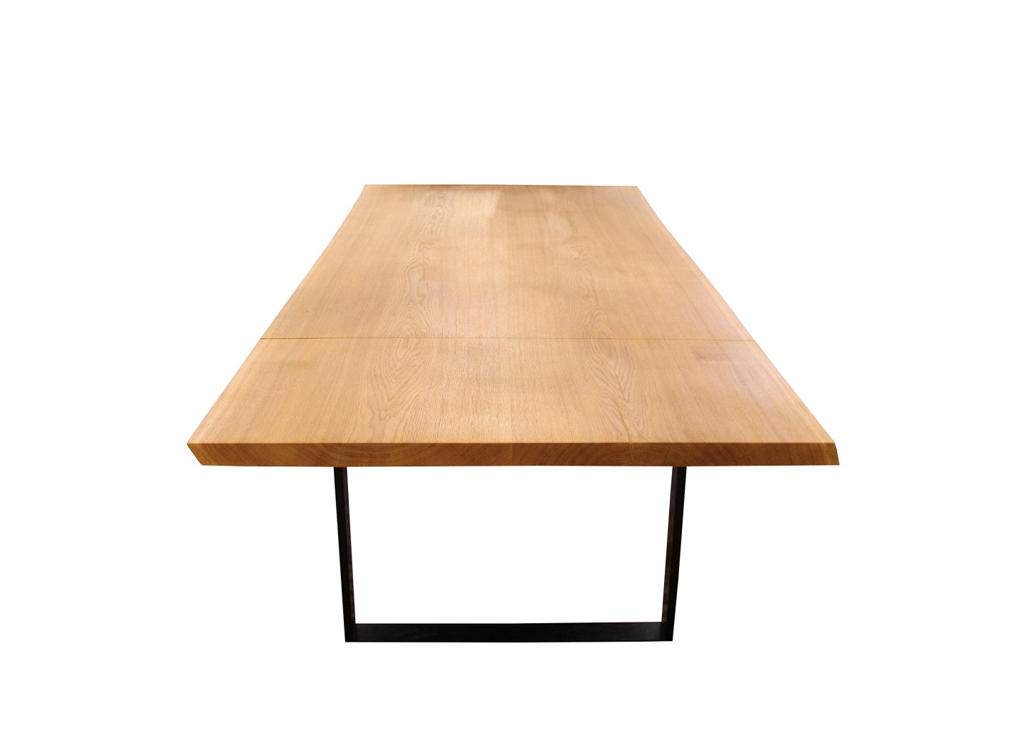 Kontakt os vedrørende prisPlankebord af eg og rammestel af sort metal, af 2 massive planker med naturkanter. Bordet er af eget design og ny fremstillet med to udtræksplader (á 50 cm).
