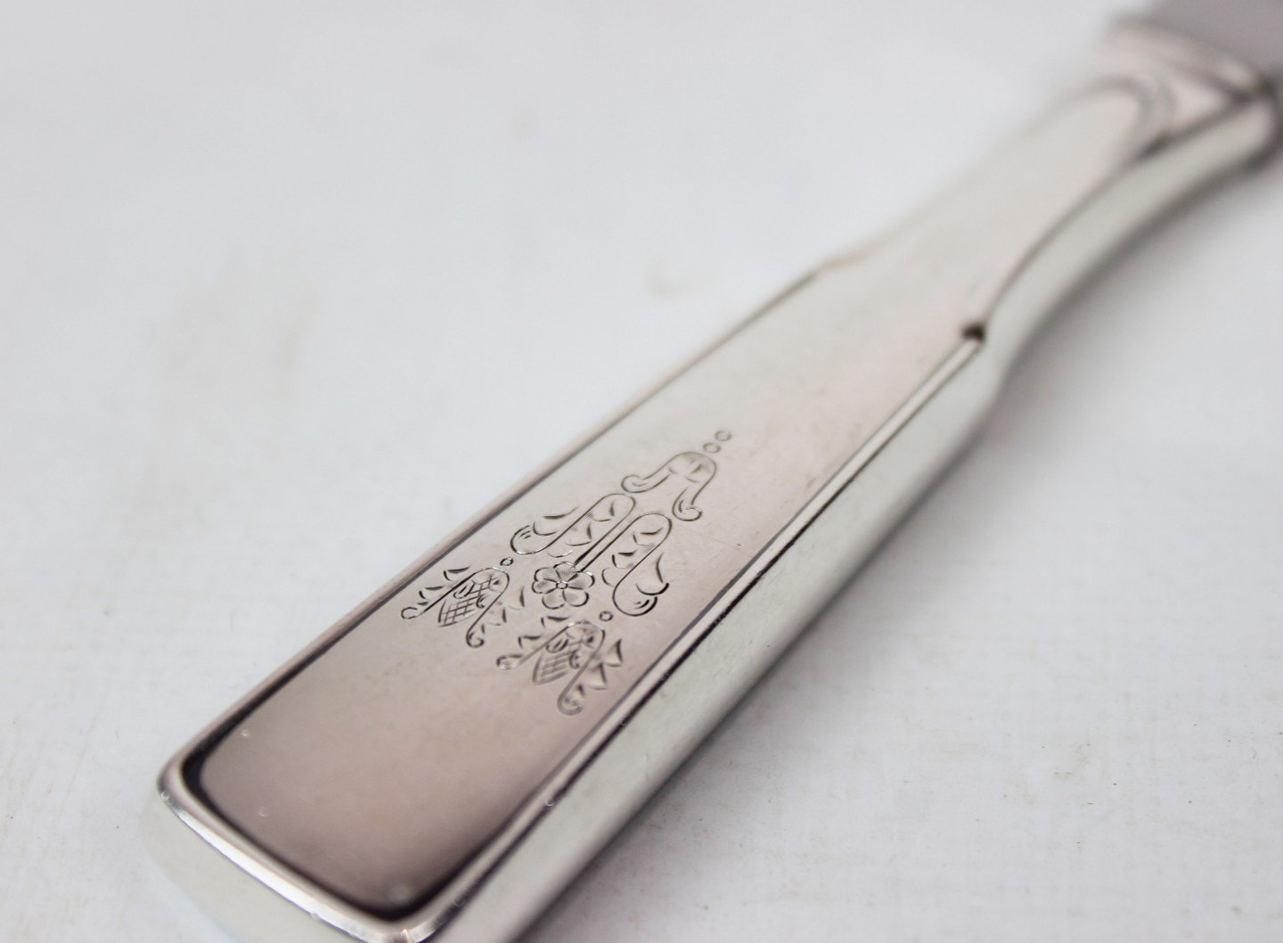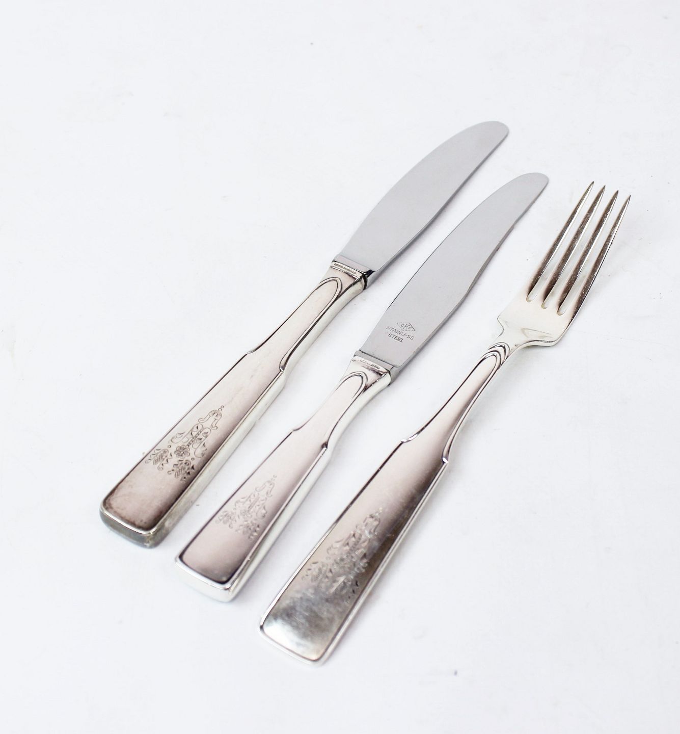 Se prisen i varebeskrivelsenMiddagskniv, frokostkniv og middagsgaffel i arvesølv nr. 2 af Hans Hansen. Spørg for antal på lager.