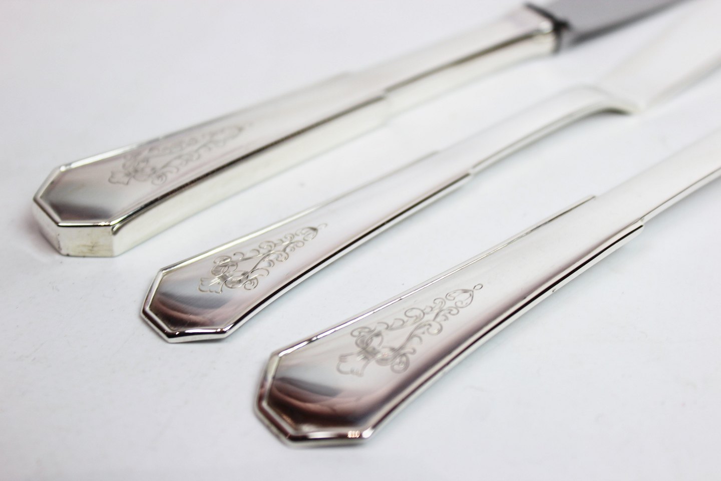 Middagskniv, fiskekniv og frokostgaffel i Arvesølv nr. 2 af Hans Hansen. Spørg for antal på lager.