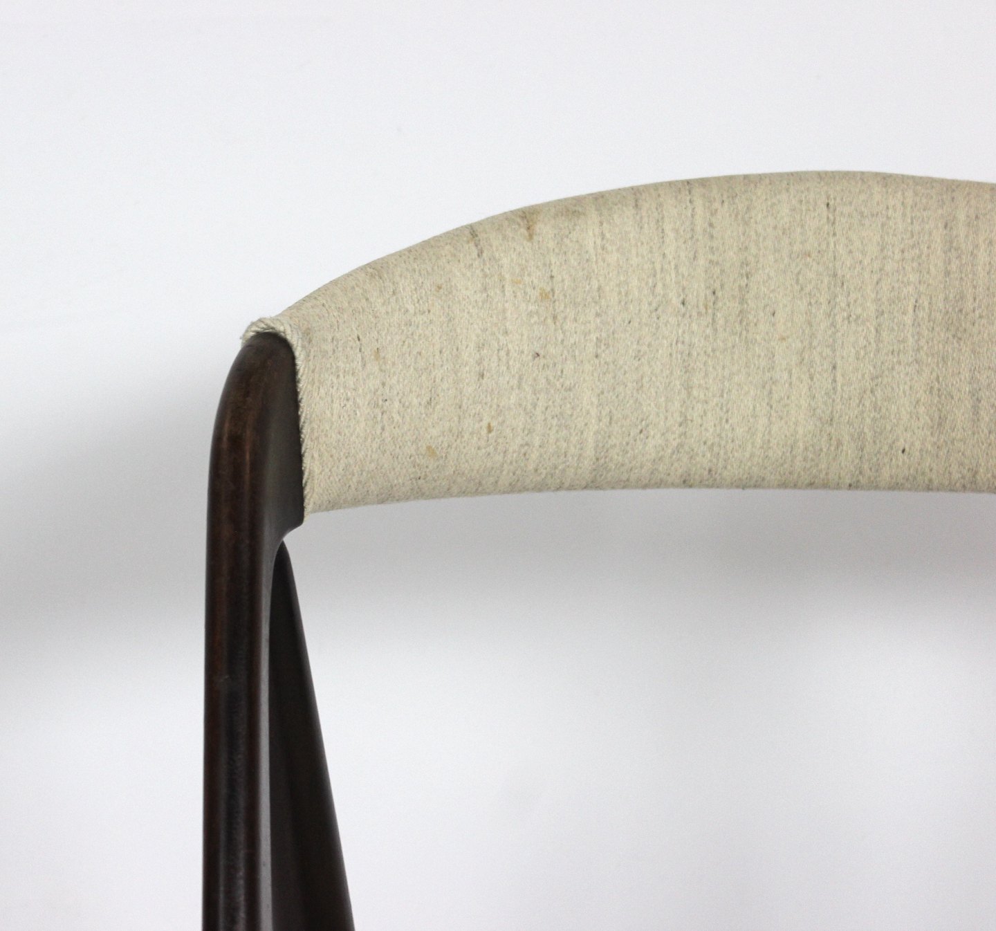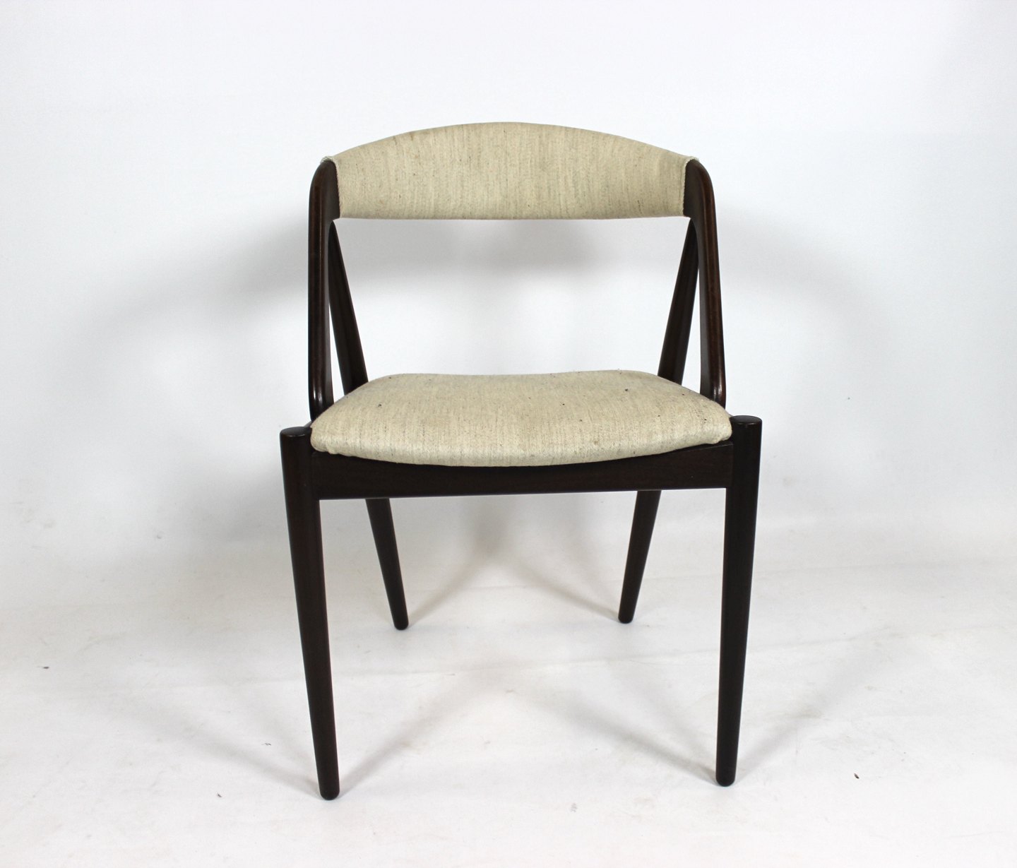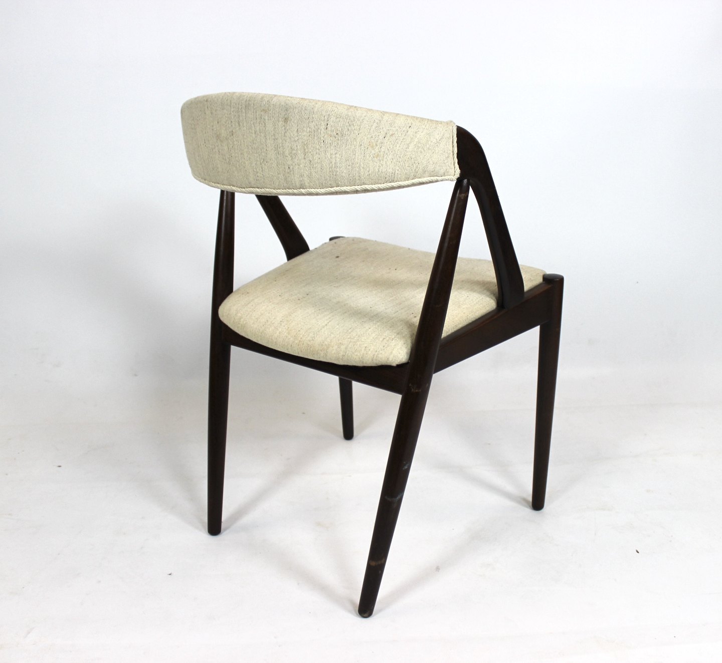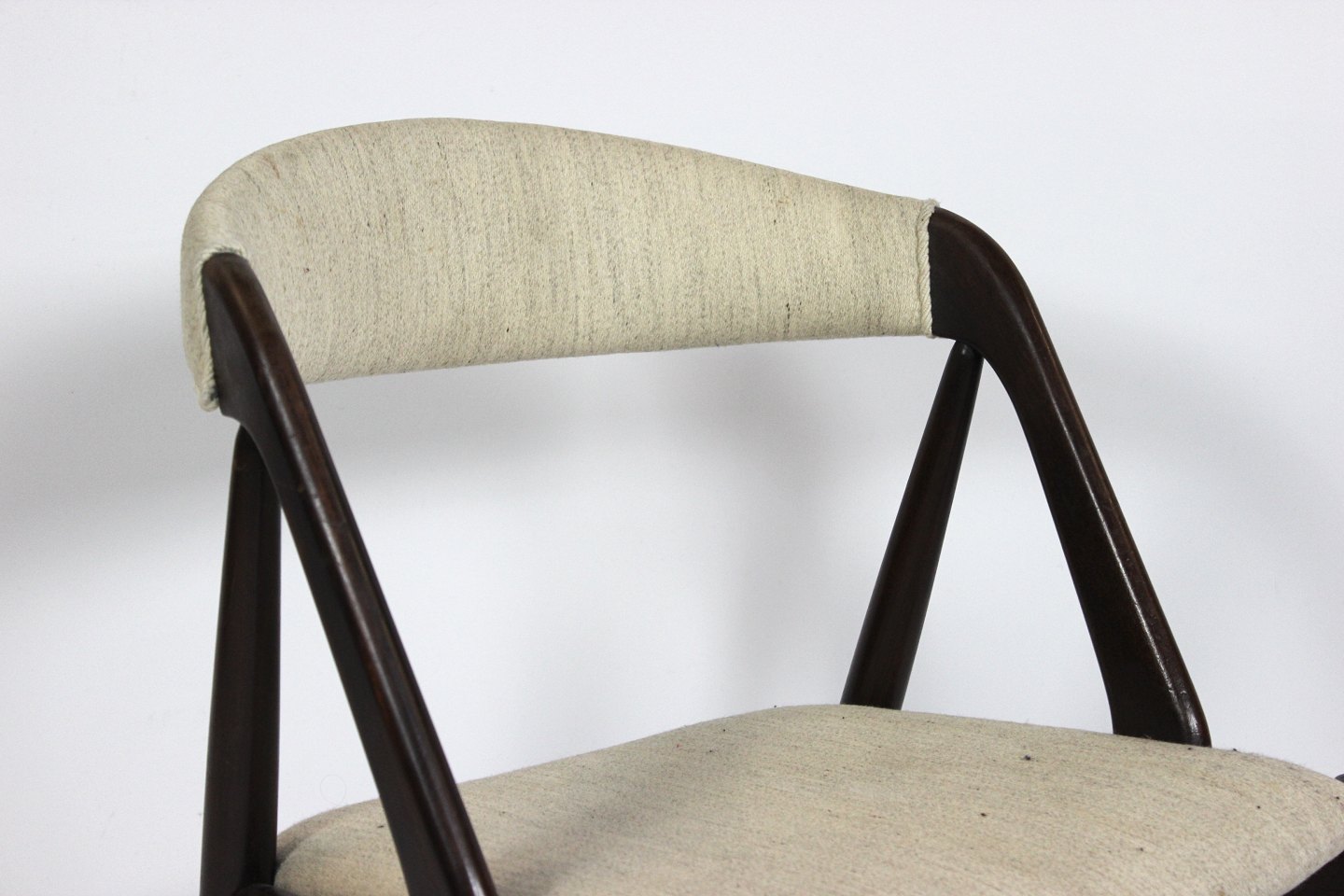 SolgtEt sæt af seks spisestuestole, model 31, designet af Kai Kristiansen i 1956 og fremstillet hos Schou Andersen i 1960erne. Stolene er i teak og polstret i lyst stof.