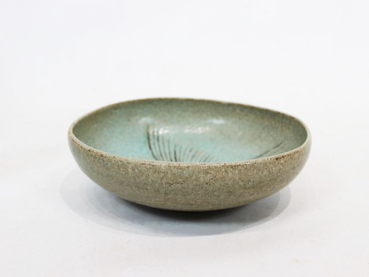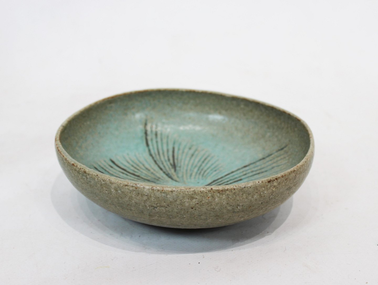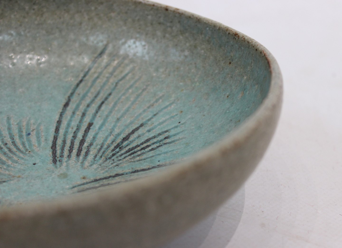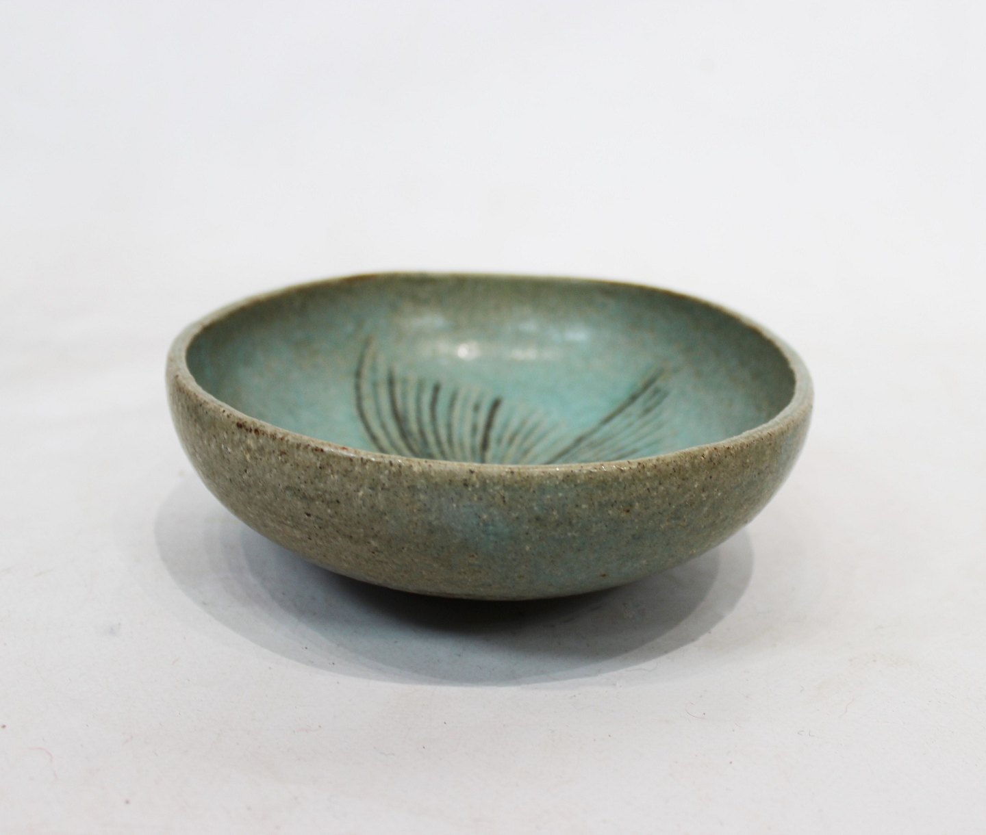 Keramisk skål i turkise farver, nummer 262, af Eva Stæhr Nielsen for Saxbo.