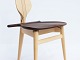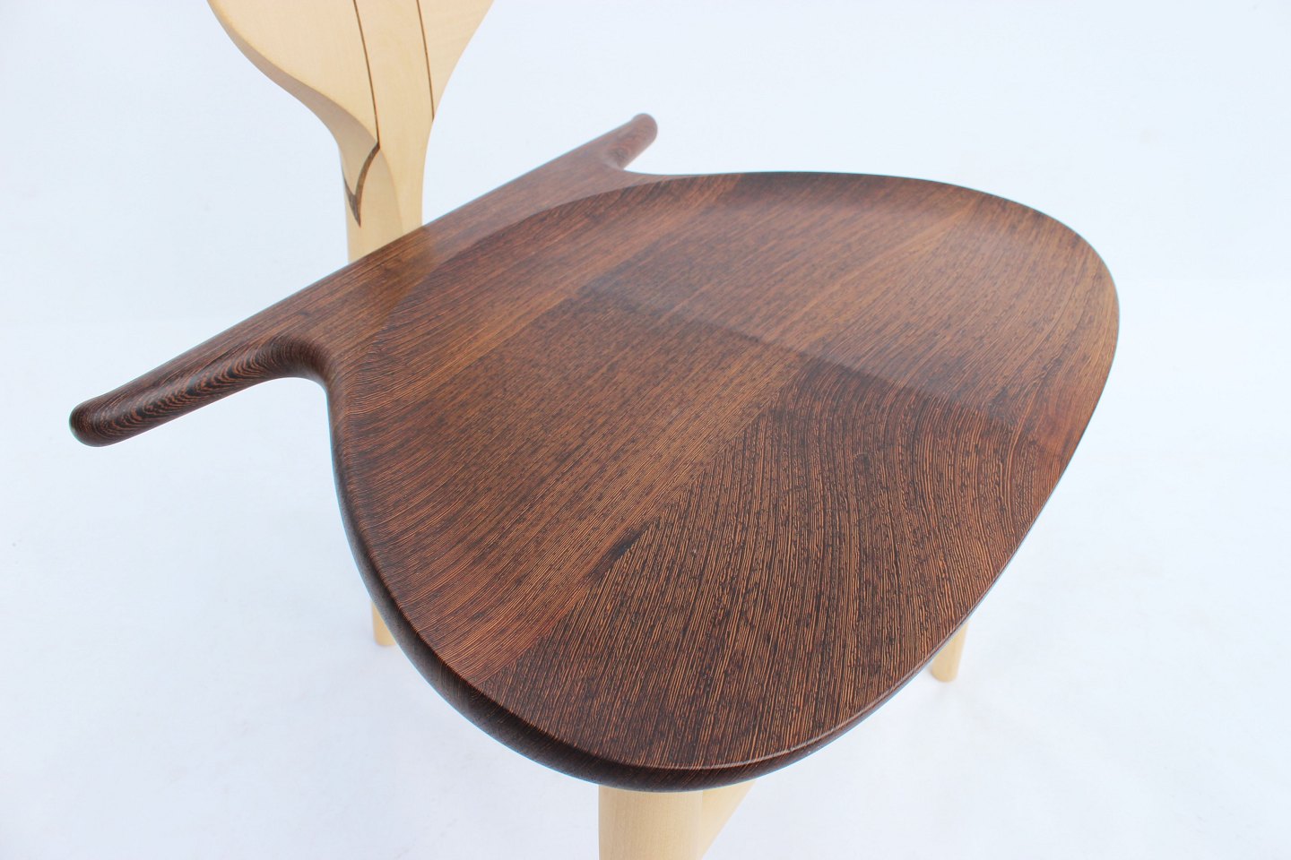 Stolen er konstrueret af ahorn og wengé, to træsorter, der komplementerer hinanden smukt. Ahorntræets lyse, glatte finish står i kontrast til wengétræets mørke og rige farve, hvilket skaber en visuelt tiltalende effekt. Denne kombination af materialer fremhæver stolens elegante linjer og fine håndværk.
