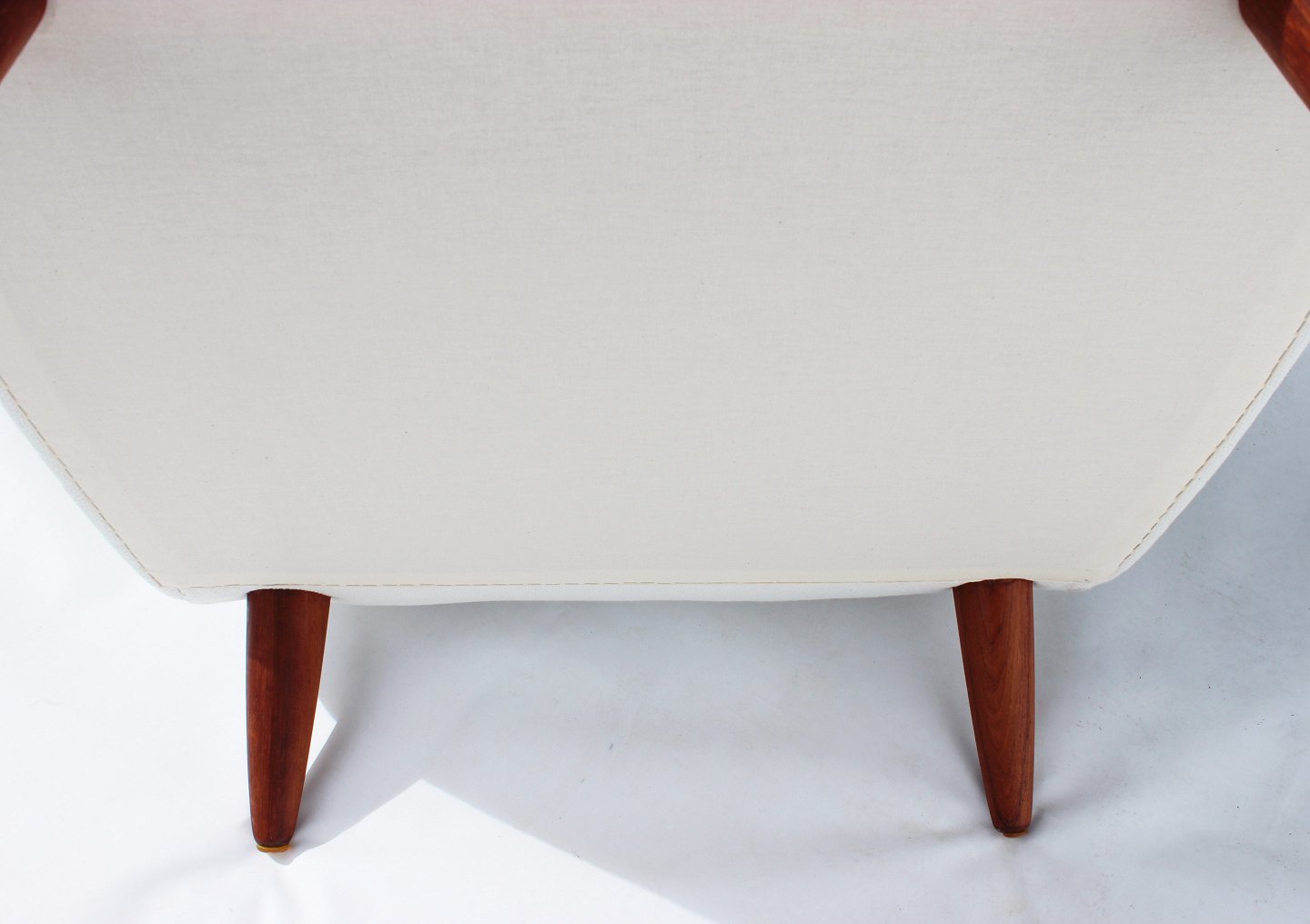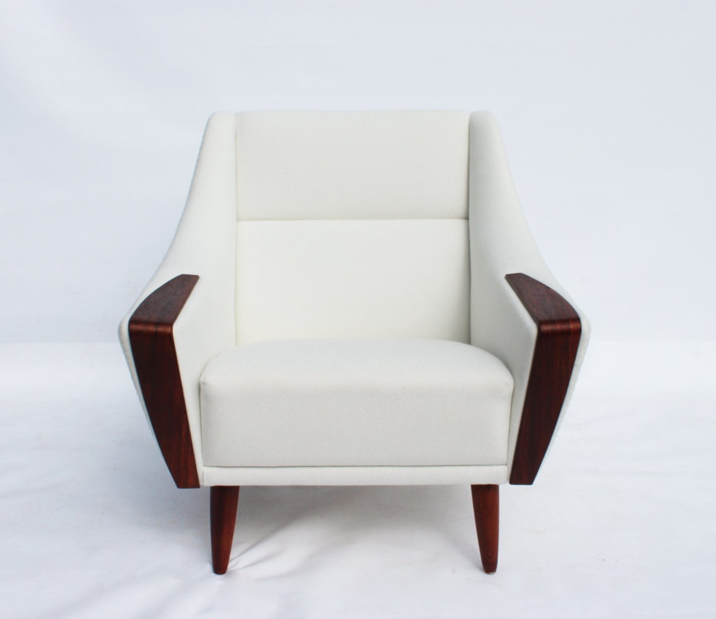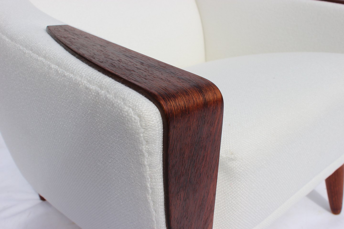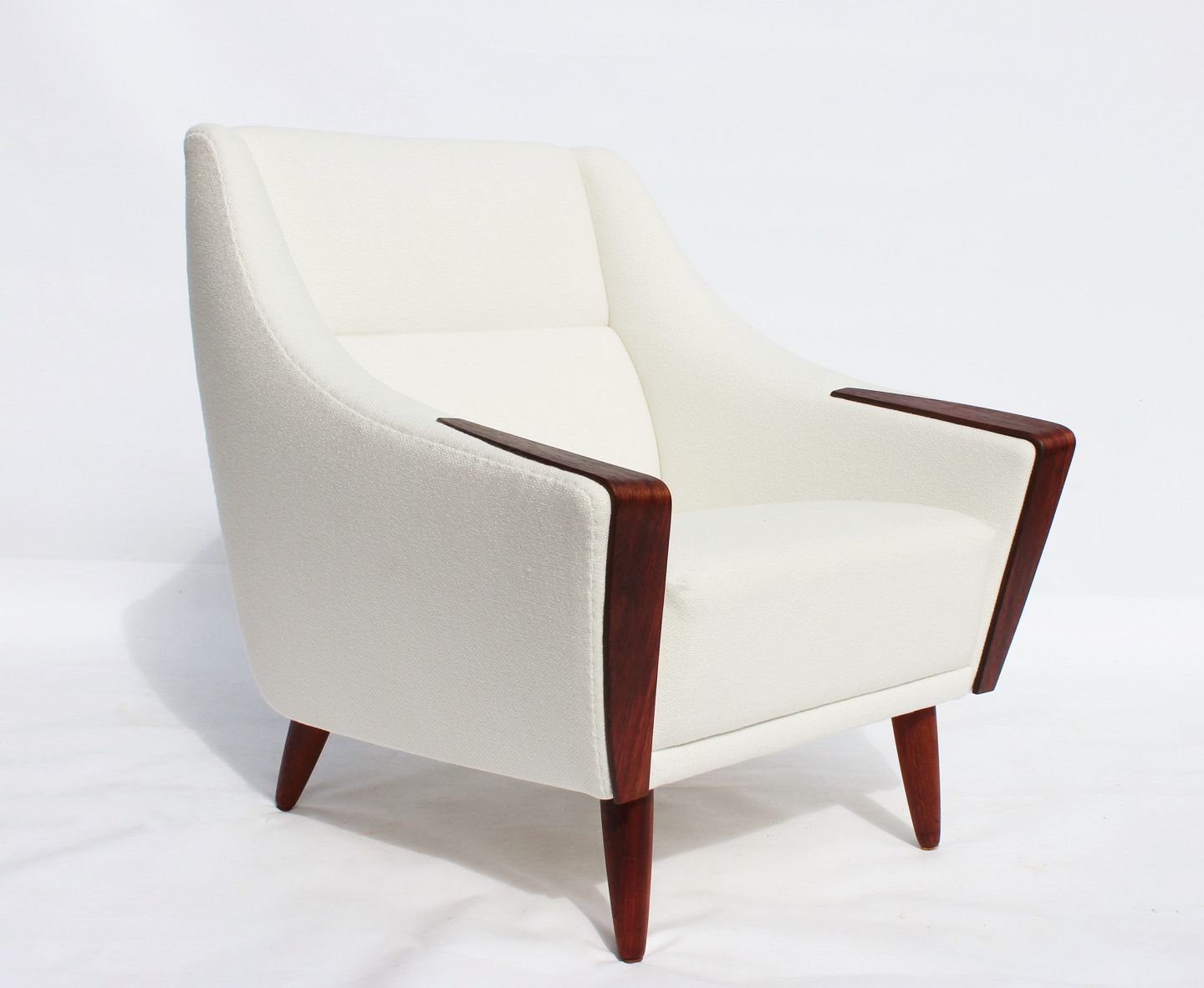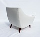 Lænestolen med lav ryg, betrukket med et elegant hvidt stof og hvilende på smukt polerede palisanderben, er et mesterværk af dansk design fra 1960'erne. Dens rene linjer og organiske form afspejler den tidstypiske æstetik inden for skandinavisk møbeldesign.