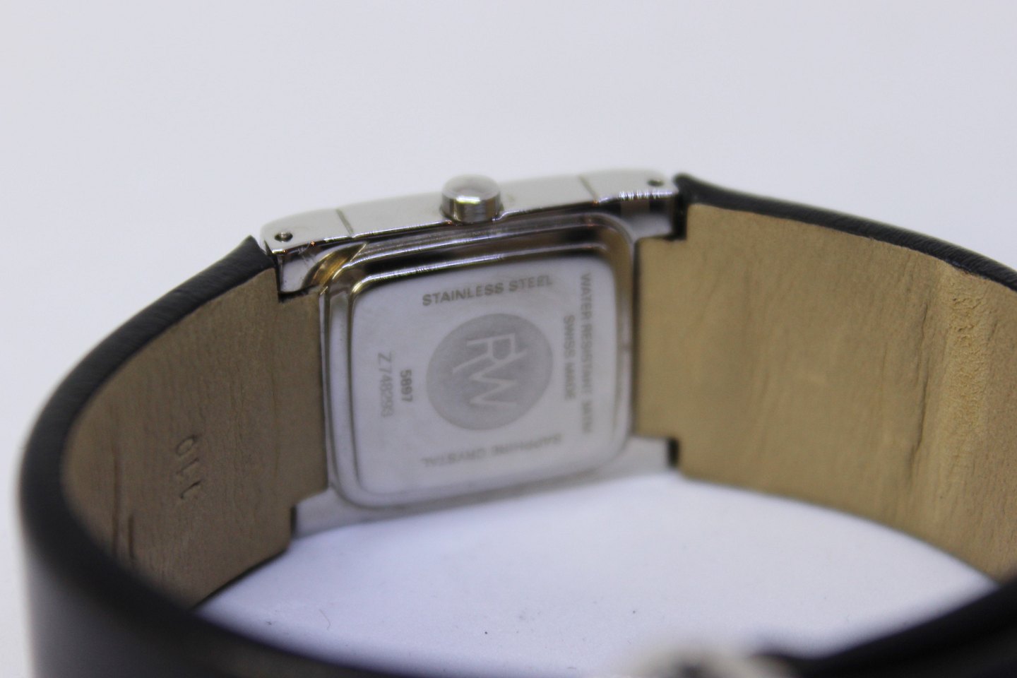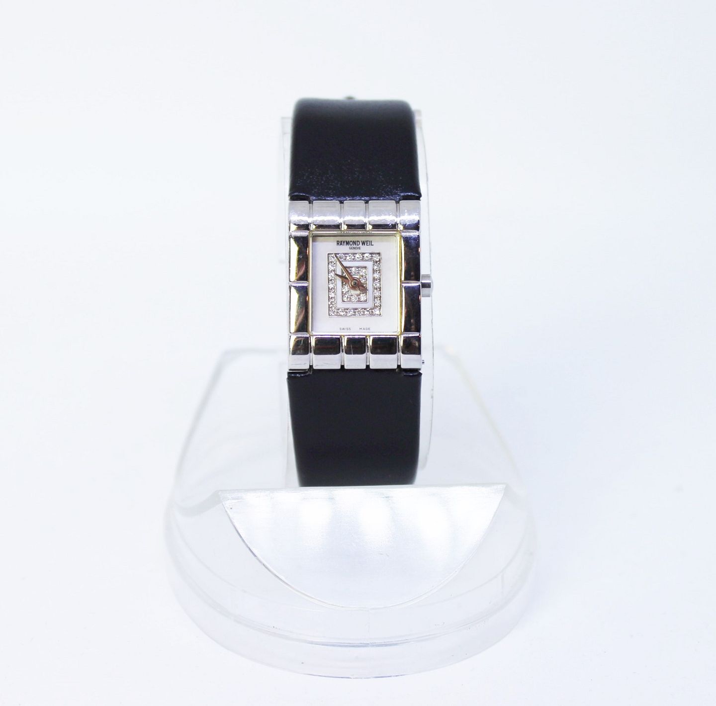 Raymond Weil dameur af rustfrit stål med Safir krystal glas, samt dekoreret med zirkoner. Uret er vandtæt 3ATM, med schweizisk quartz urværk. Model nummer: 5897.
