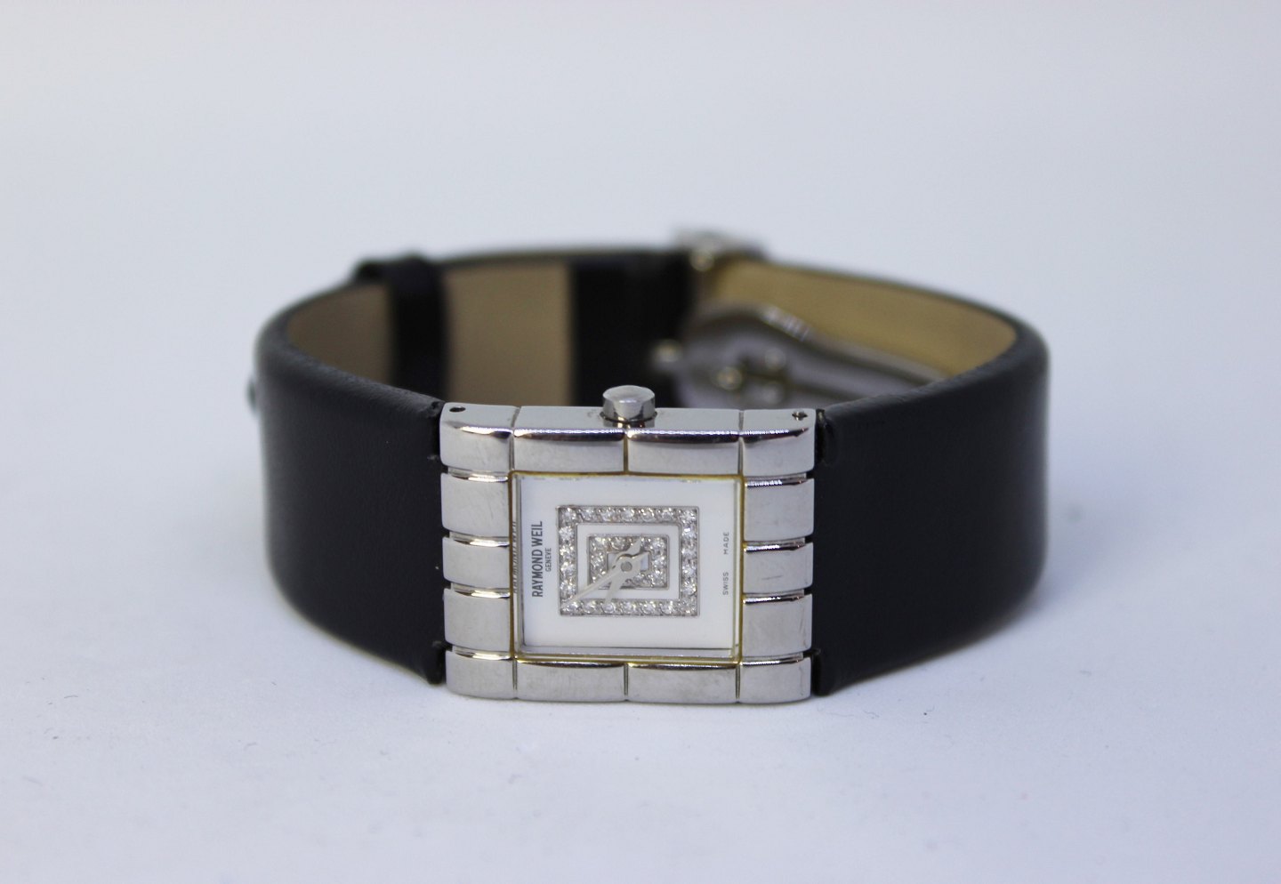 Raymond Weil dameur af rustfrit stål med Safir krystal glas, samt dekoreret med zirkoner.