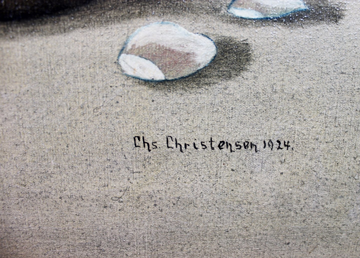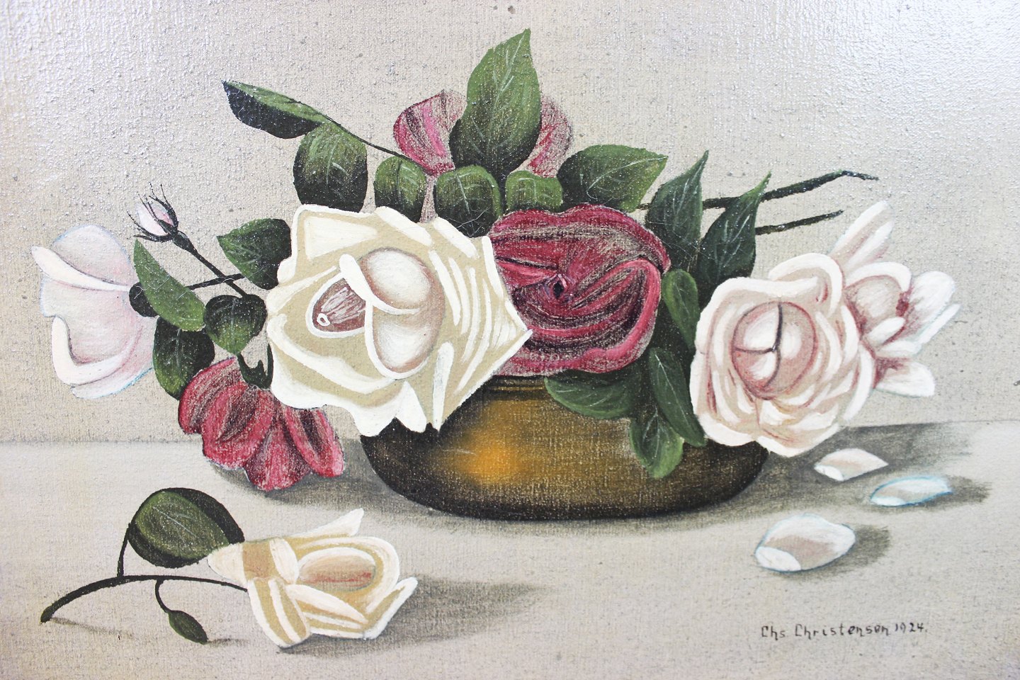 Oliemaleri med motiv af en buket roser signeret Chs. Christensen i 1924.