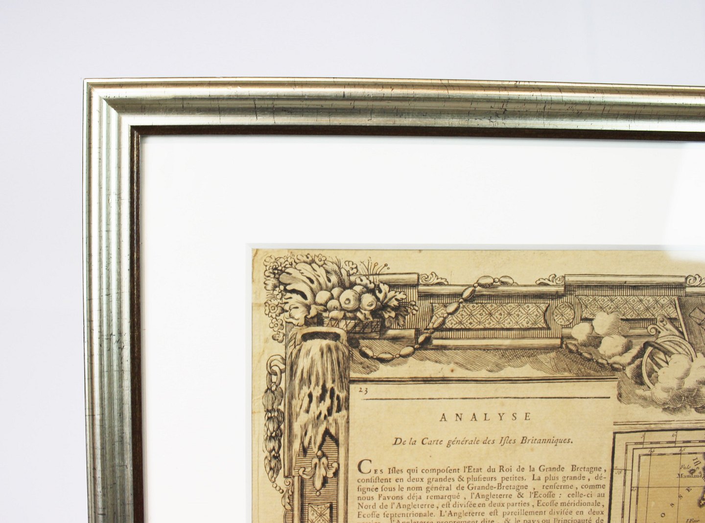 Fransk kort over de britiske øer i ny glasramme med sølv farvet kant.