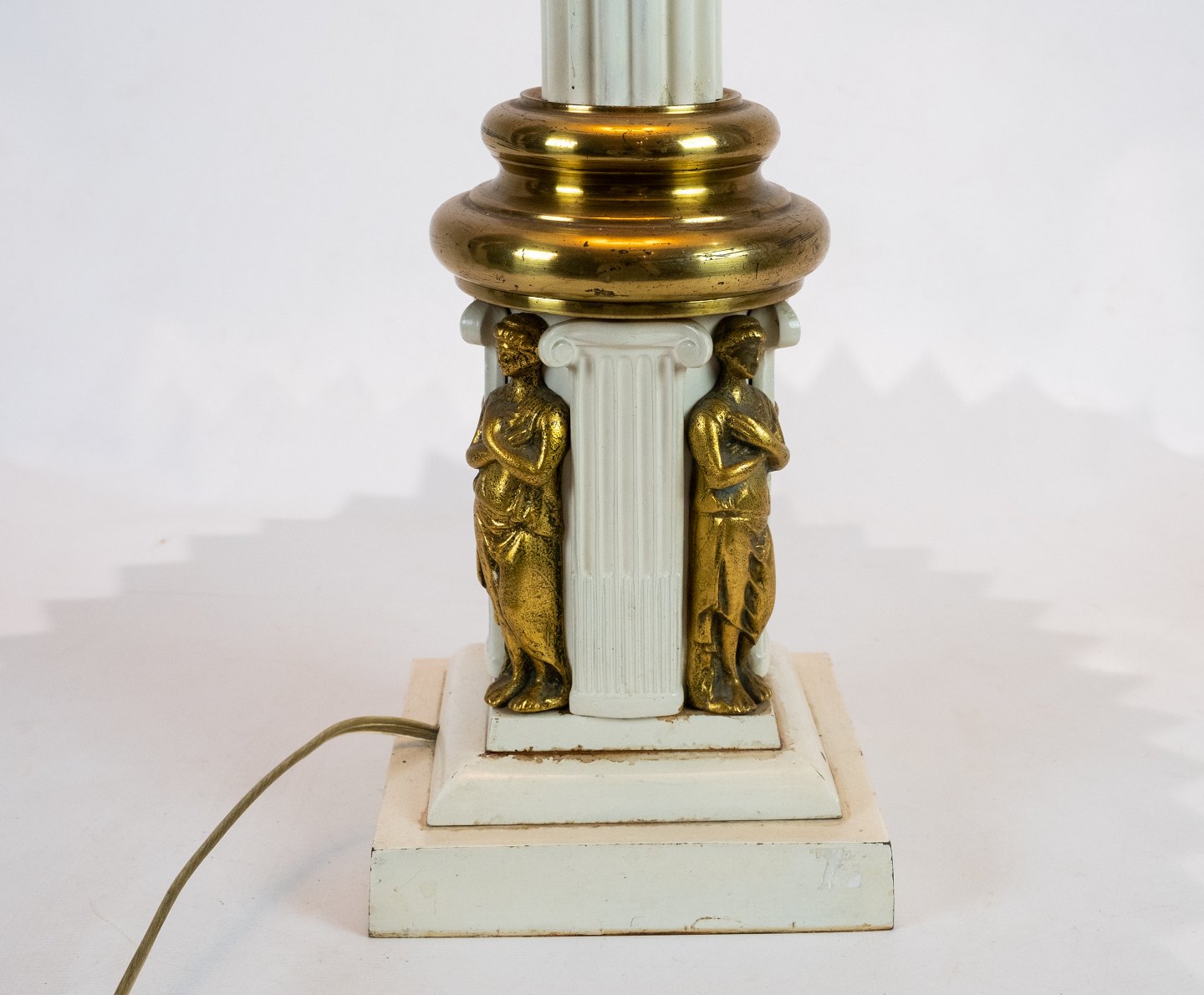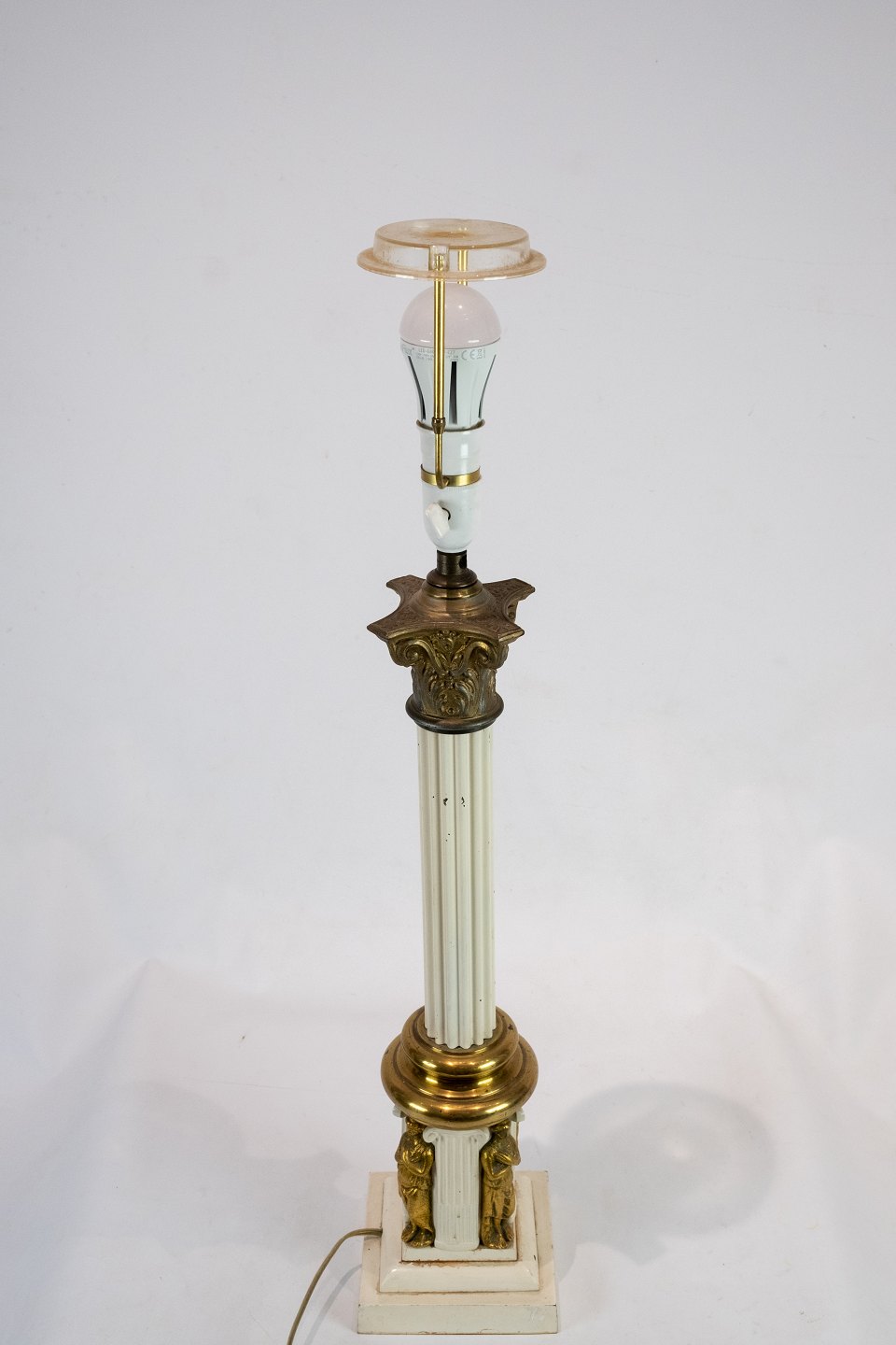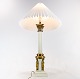 Gammel fransk bordlampe i messing dekoreret med forskellige figurer fra 1920erne.