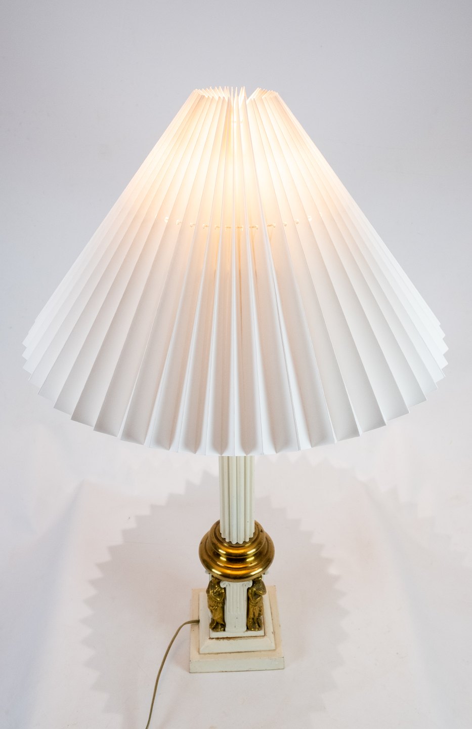 Gammel fransk bordlampe i messing dekoreret med forskellige figurer fra 1920erne. Skærmen er håndmalet og håndfoldet i papir.