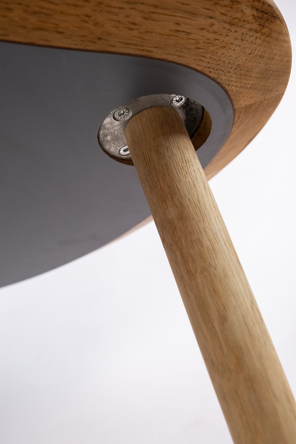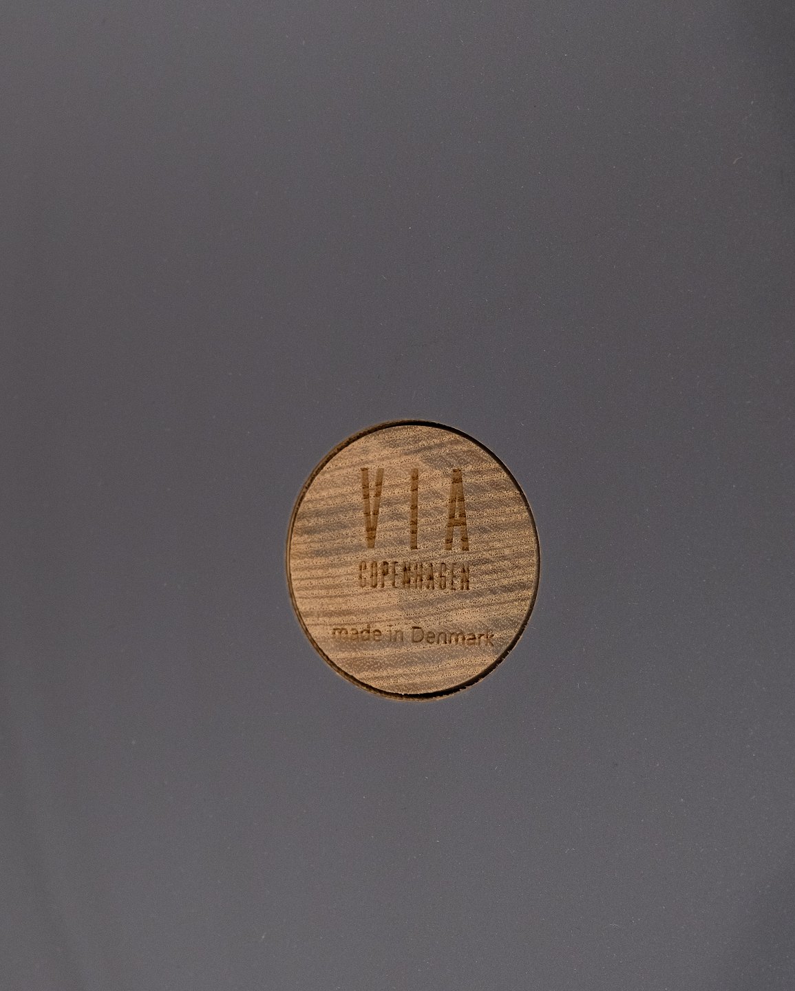 Sofabord med brun laminat top og ben i egetræ af Via Copenhagen. Bordet er i flot stand.