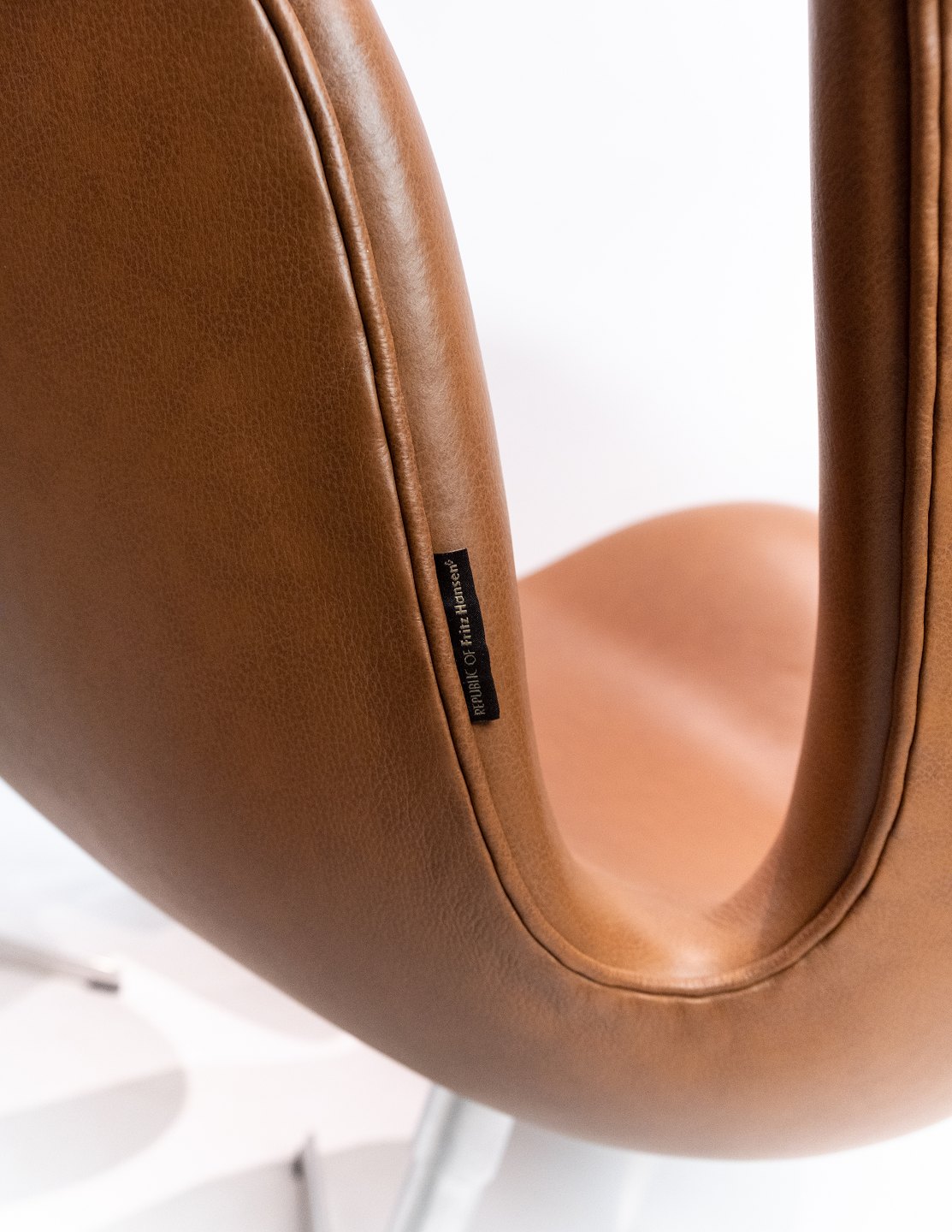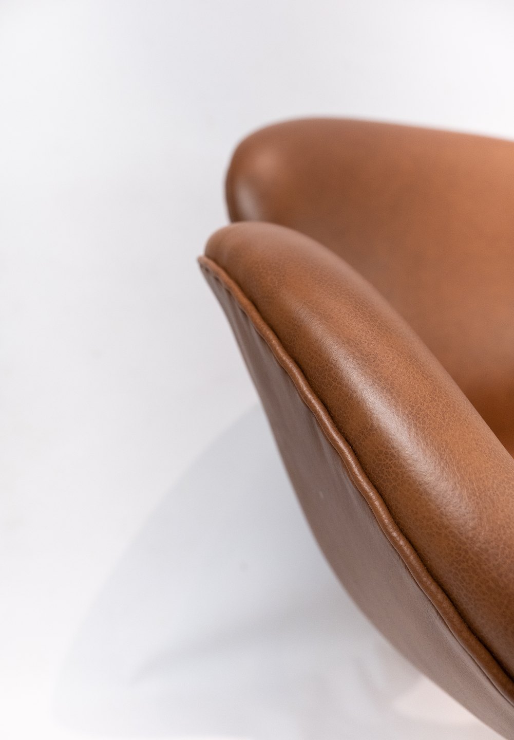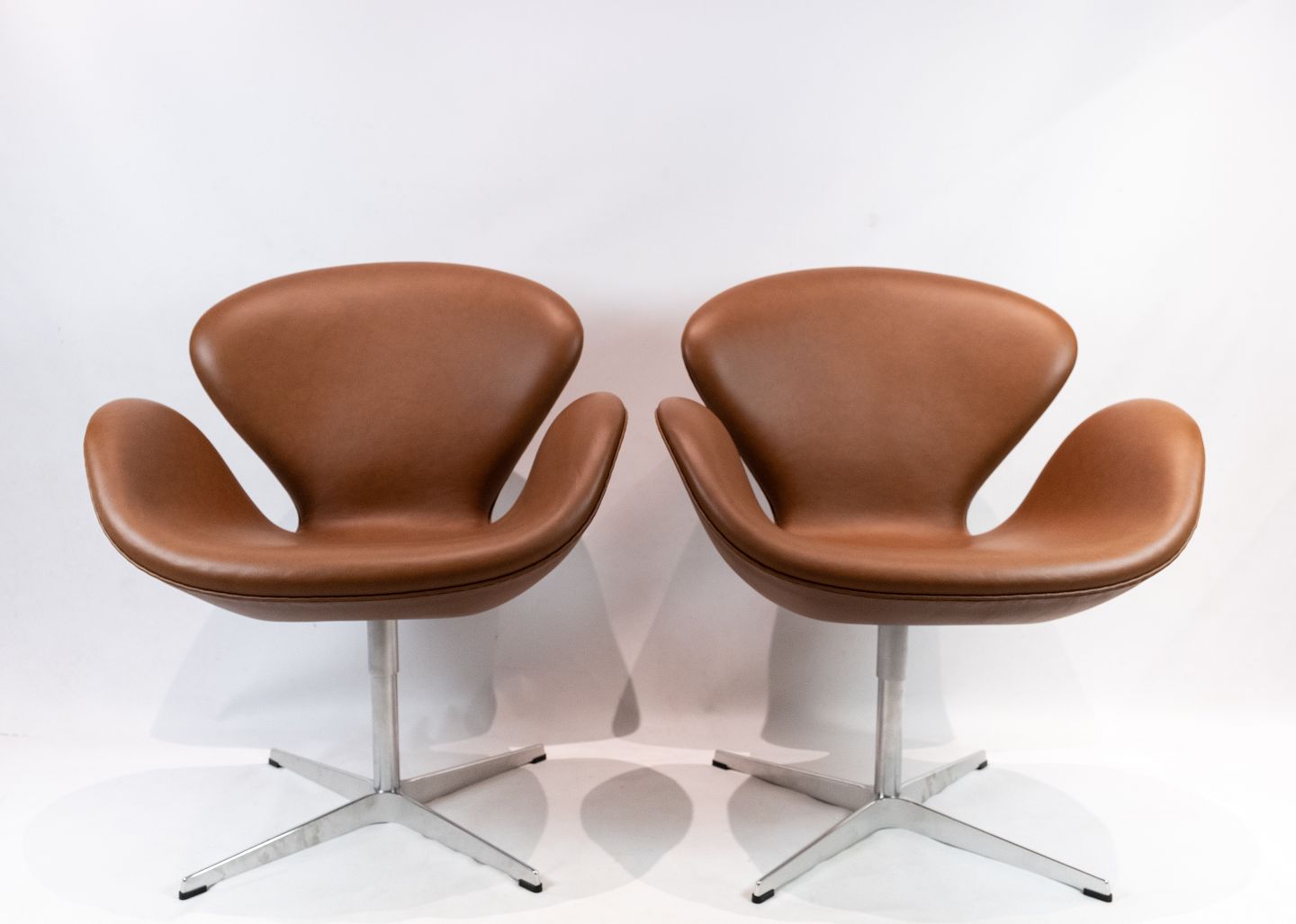 SoldSwan chair, model 3320, designed by Arne Jacobsen in 1958 and manufactured by Fritz Hansen. The chairs are with original upholstery in light brown leather.