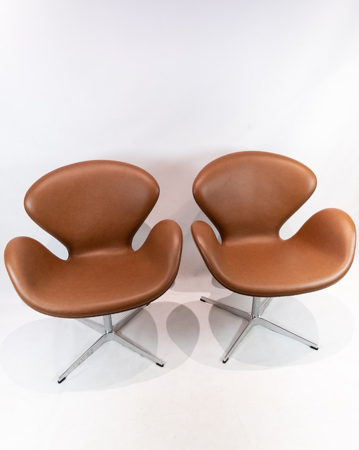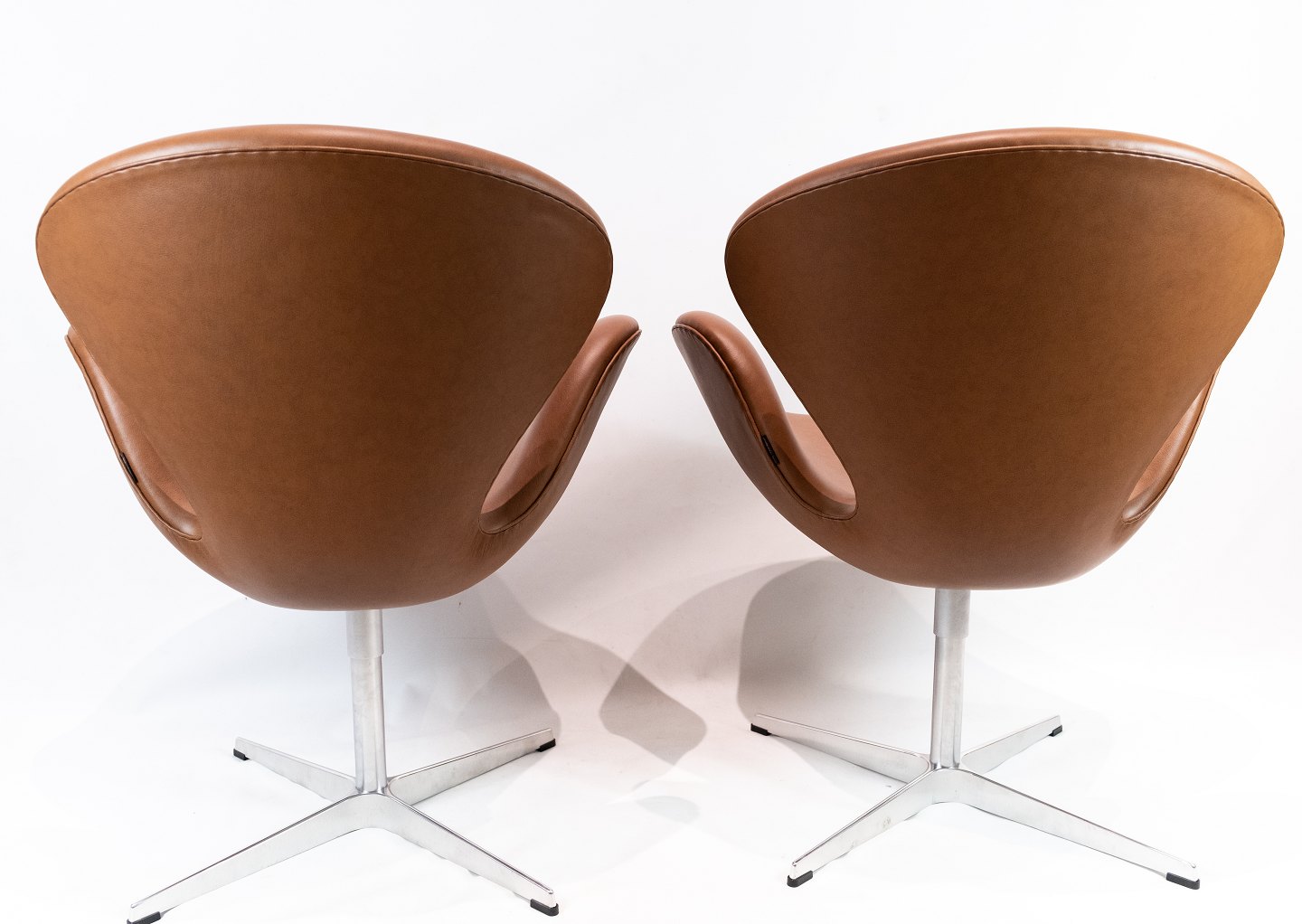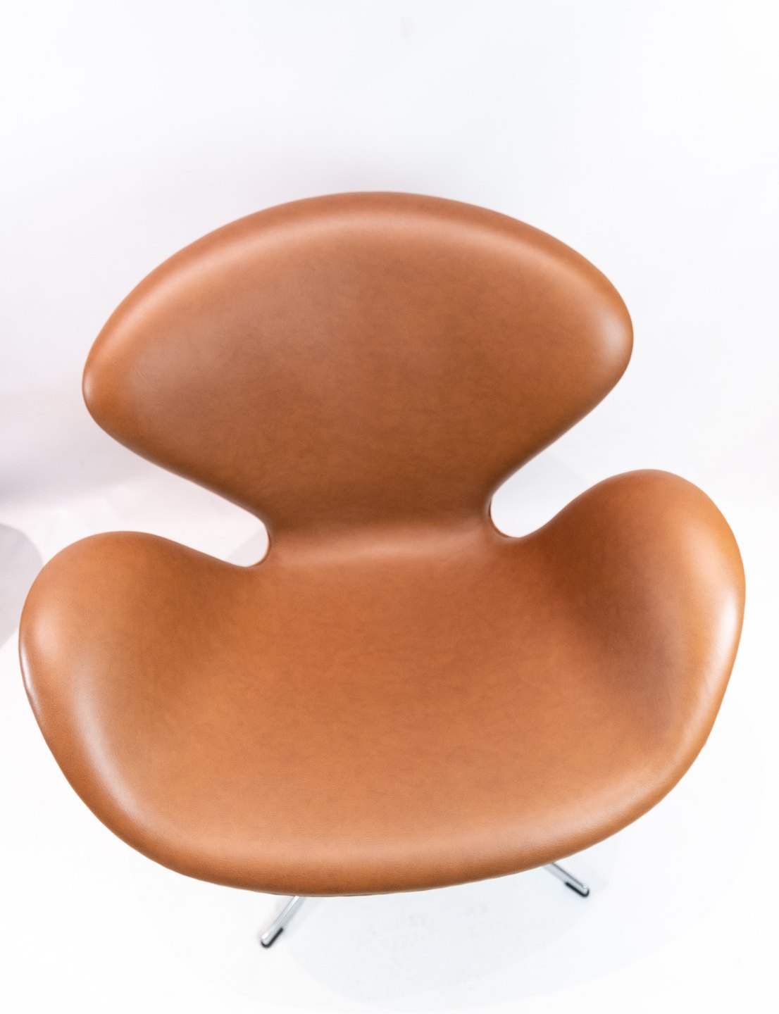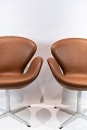 SoldSwan chair, model 3320, designed by Arne Jacobsen in 1958 and manufactured by Fritz Hansen. The chairs are with original upholstery in light brown leather.