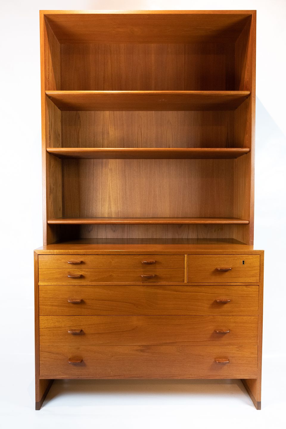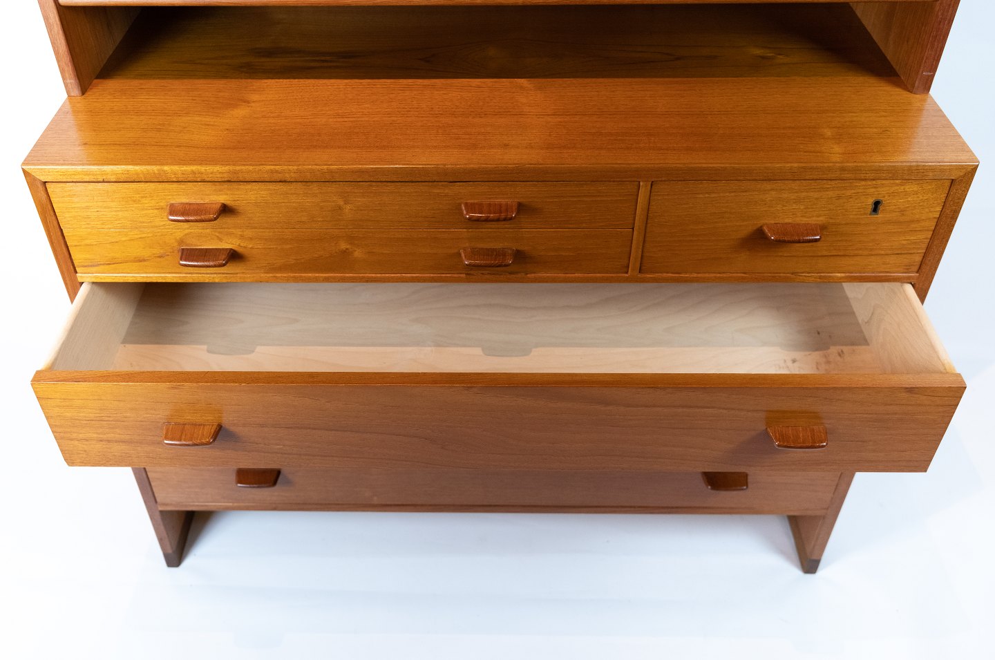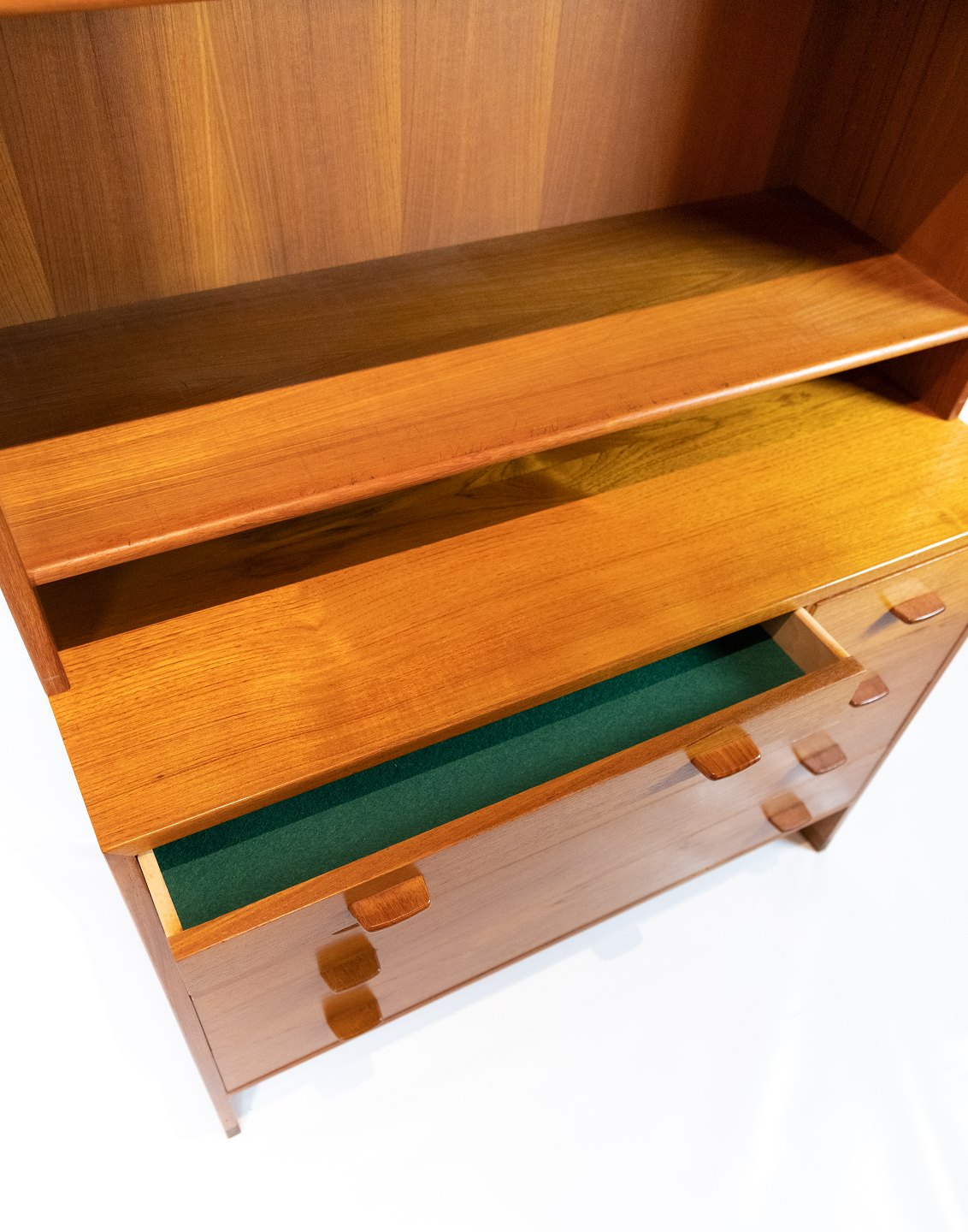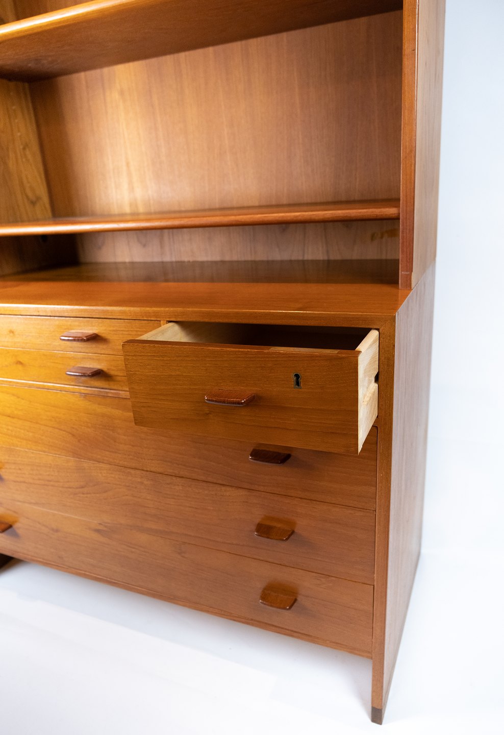 Denne bogreol, designet af den anerkendte danske arkitekt Hans J. Wegner i 1960, er et tidløst mesterværk af teaktræshåndværk. Med tre store hylder og to mindre skuffer giver den rigelig opbevaringsplads til dine bøger og personlige ejendele. Wegners unikke design og fokus på funktionalitet og æstetik sikrer, at denne bogreol ikke kun er praktisk, men også smukt integreres i ethvert rum.