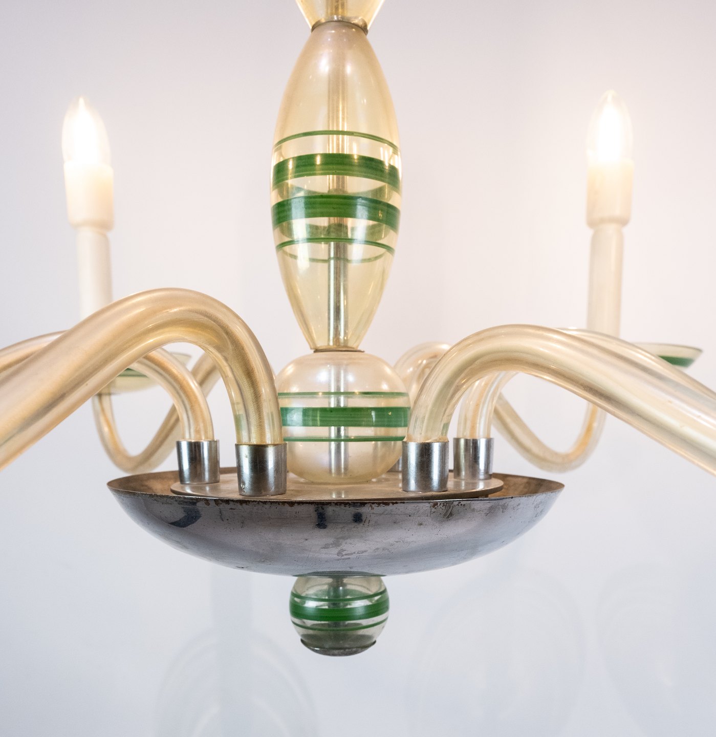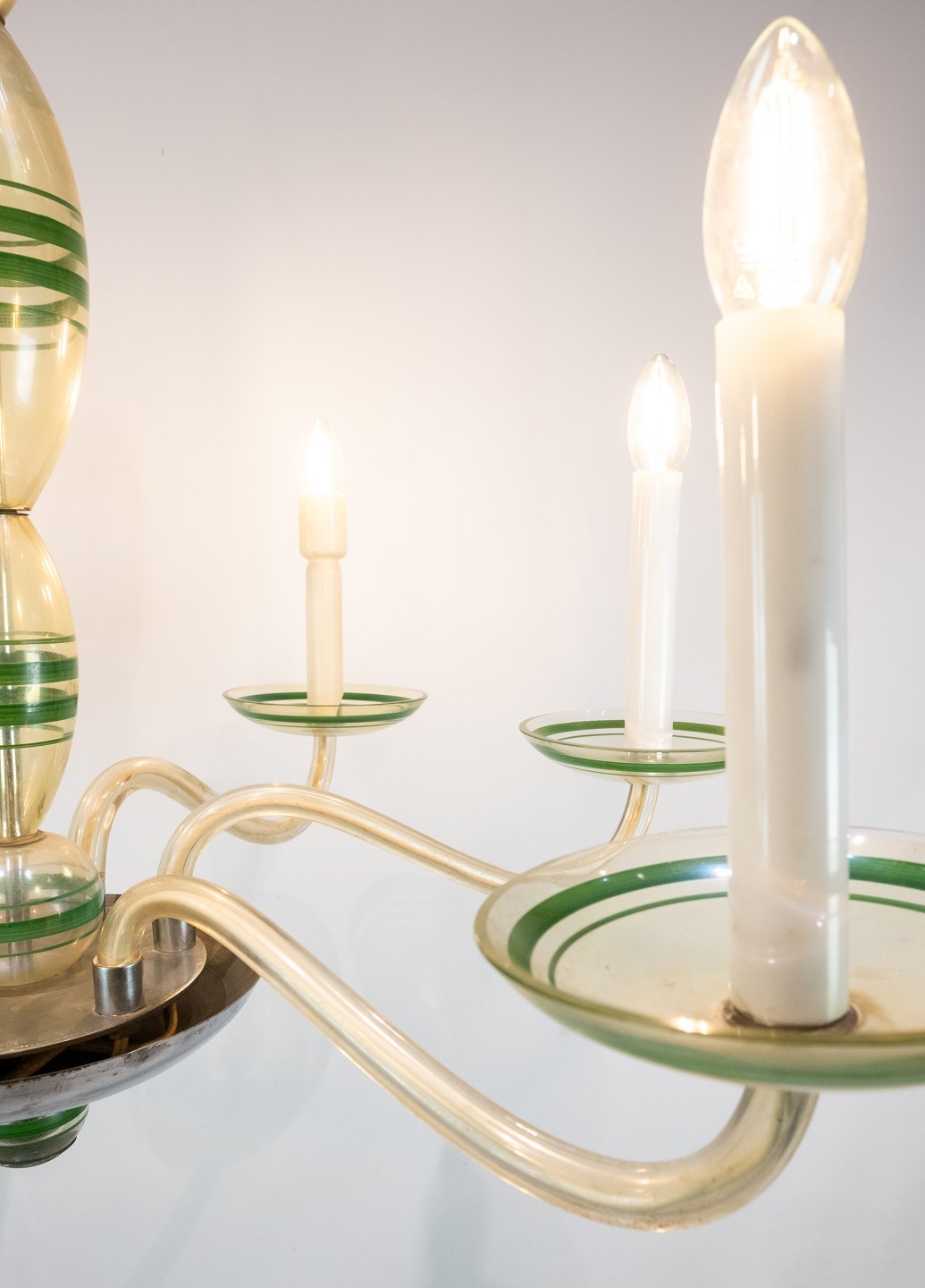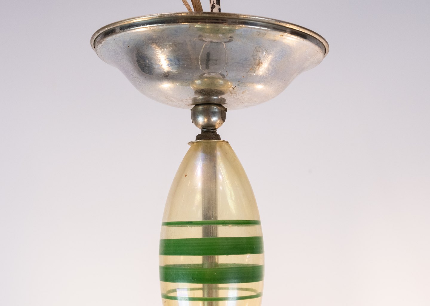 Lysekrone af opal glas dekoreret med grøn farve. Kronen er i flot stand.