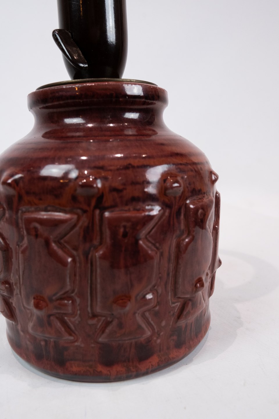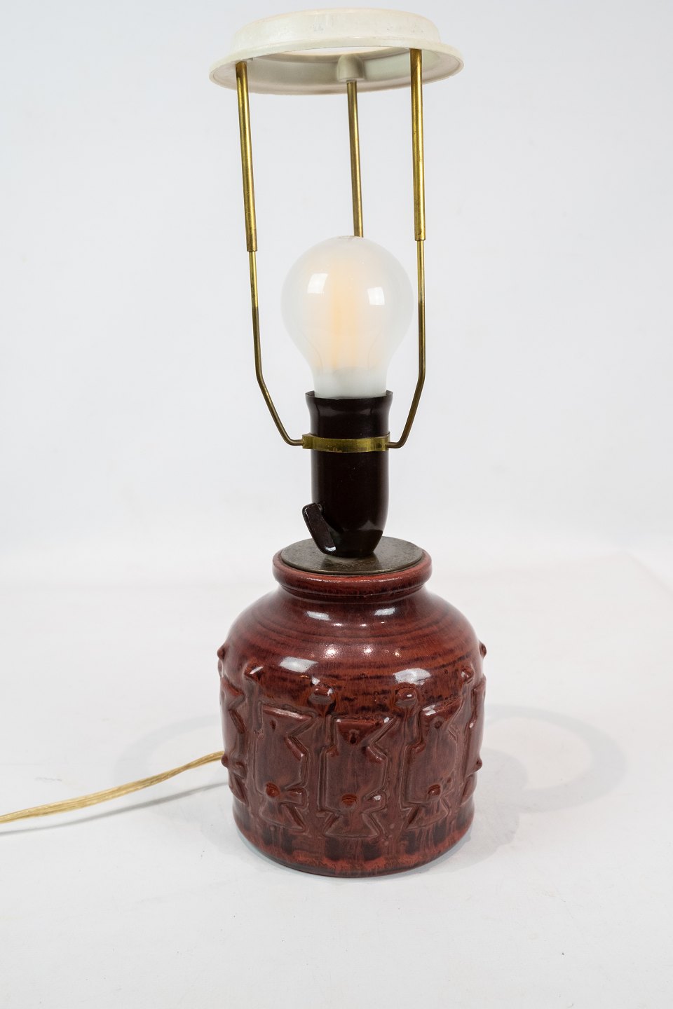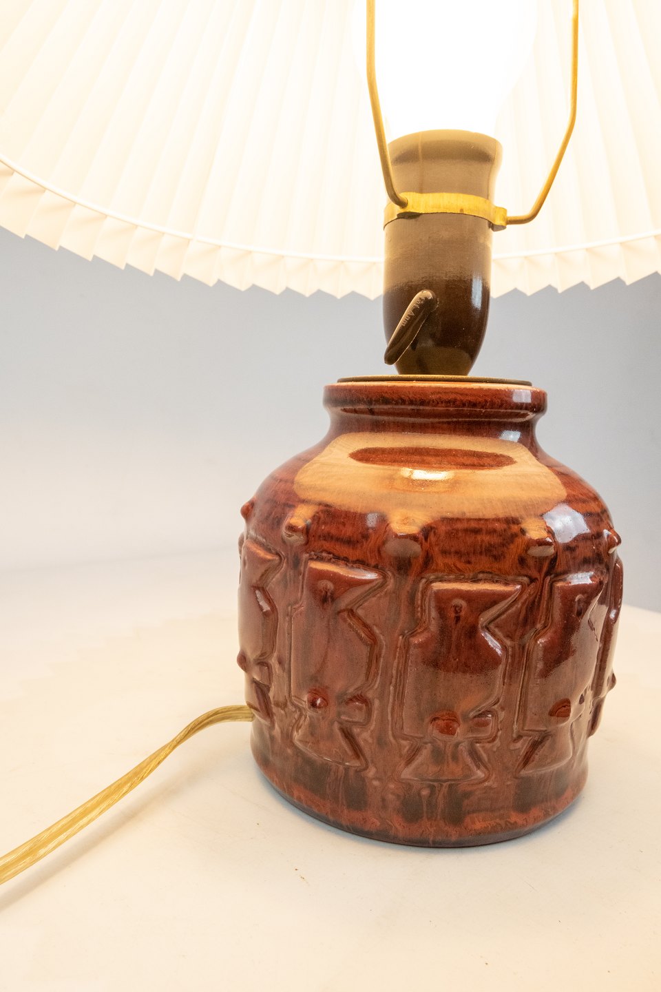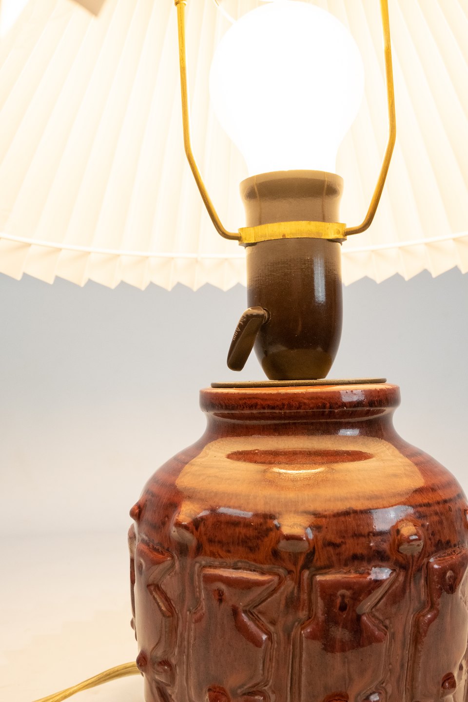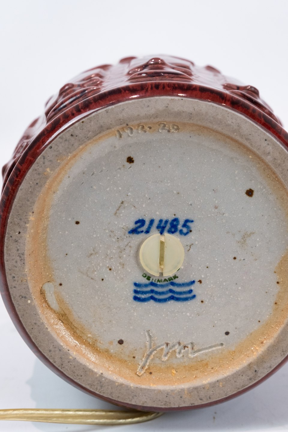 Bordlampe af kongeligt stentøj med dekorationsnummer 21485 af Jørgen Mogensen. Skærmen er håndfoldet og håndmalet i papir.