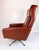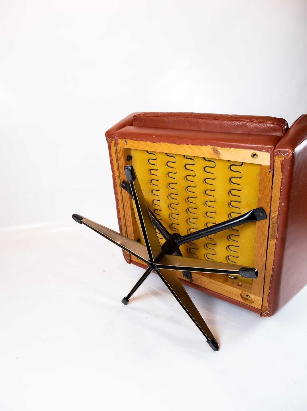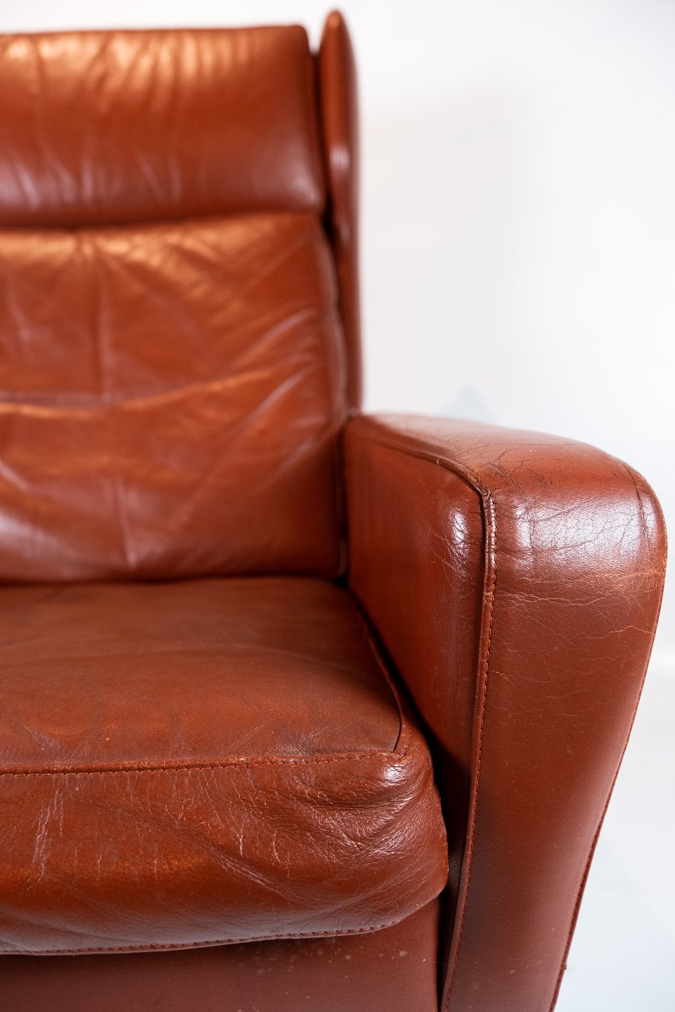 En lænestol polstret med rødbrunt Elegance læder, et tidløst symbol på dansk design fra 1970'erne.