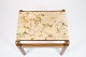 Et par skamler i lyst poleret træ og polstret med lyst blomstret stof fra 1960erne.