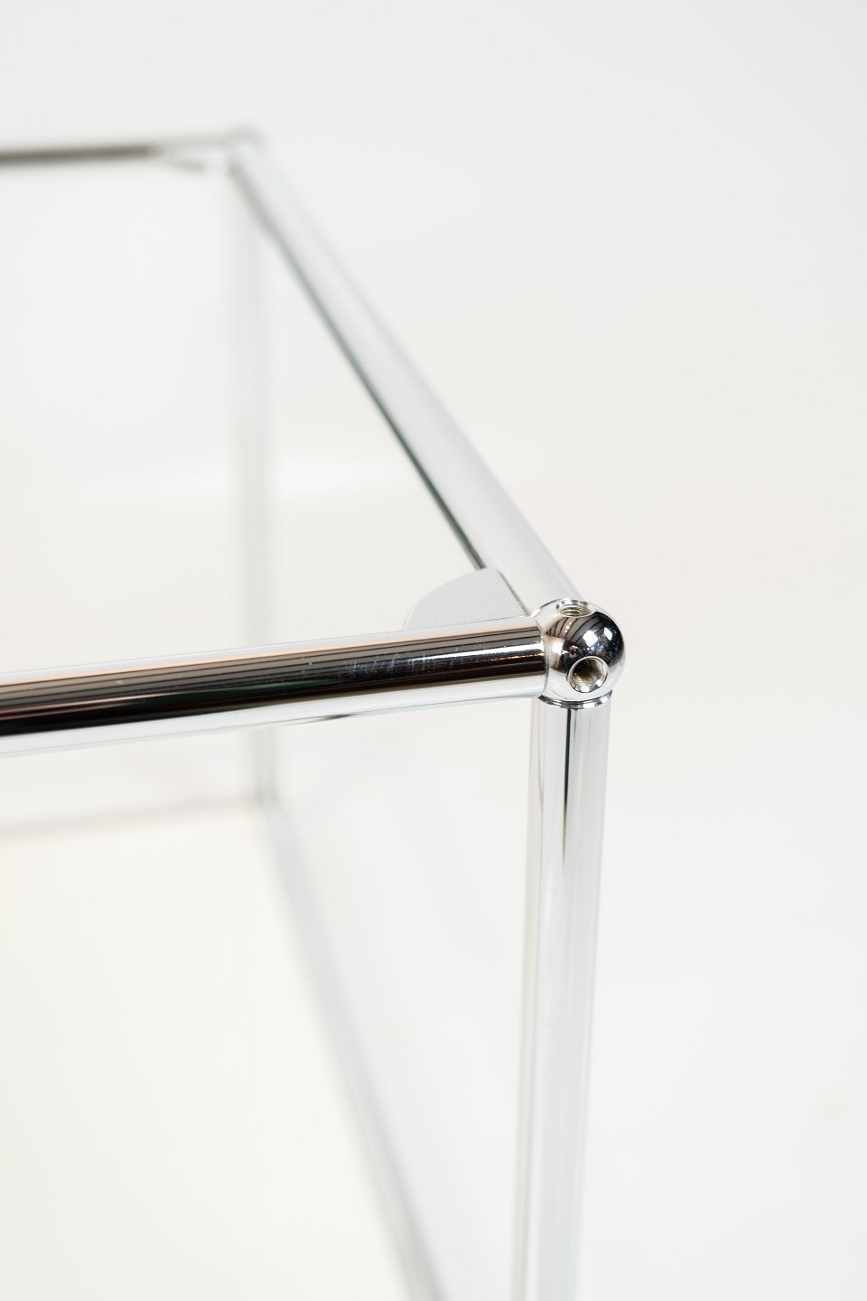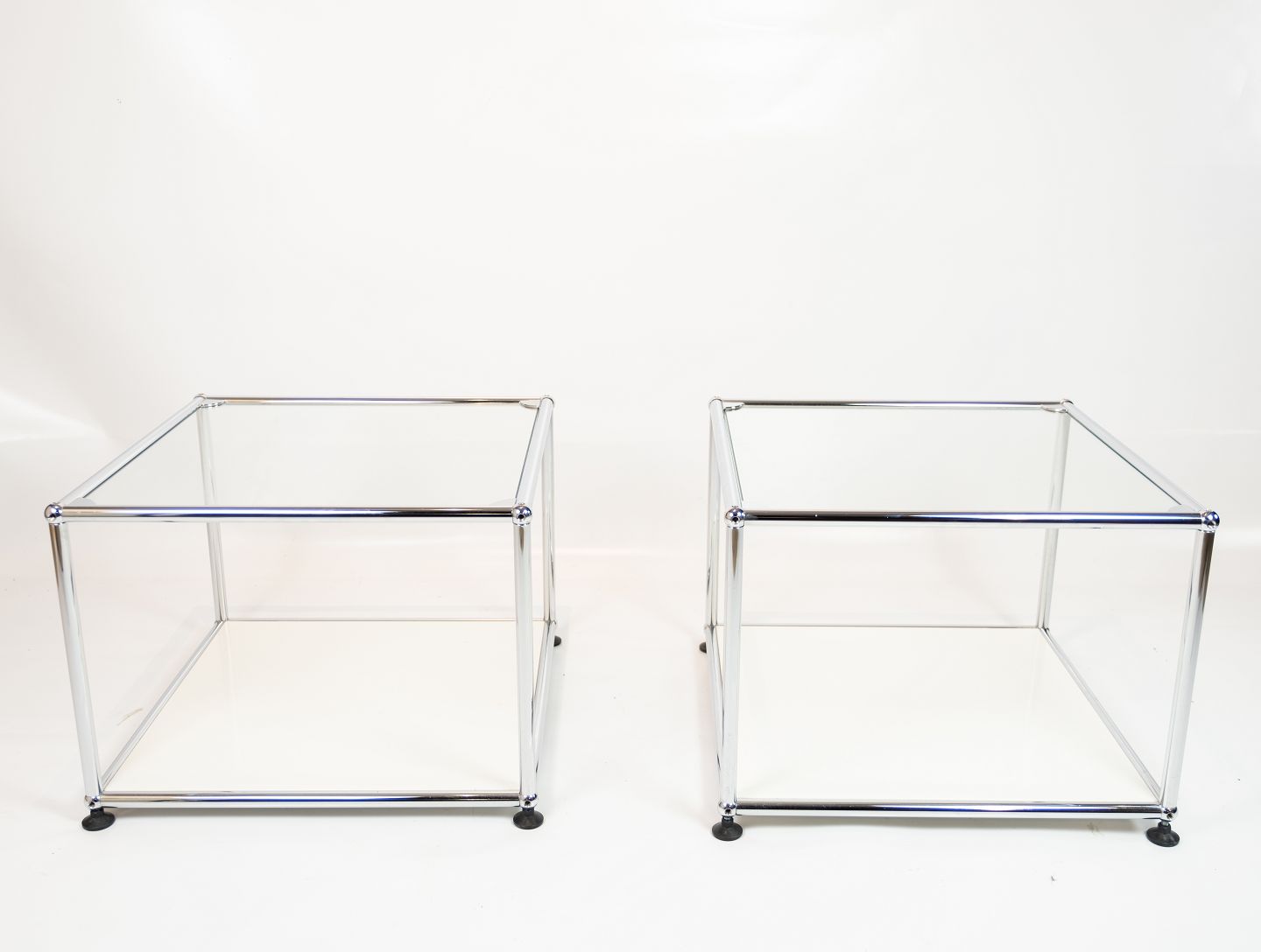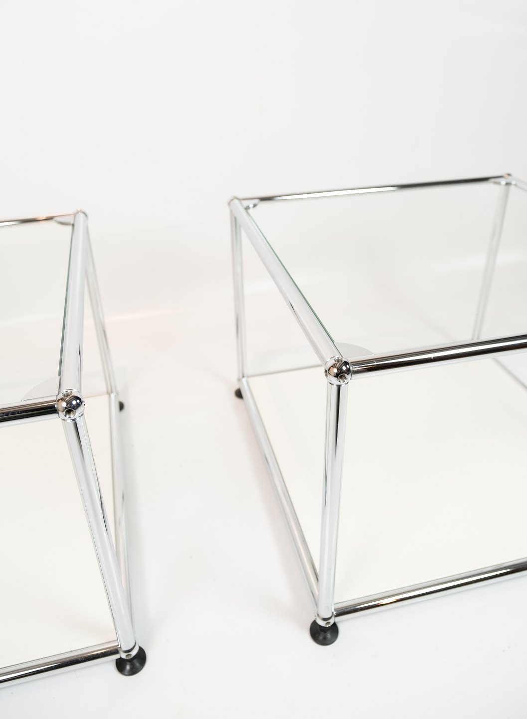 Et sæt italienske sideborde i glas og krom stel, i flot brugt stand.