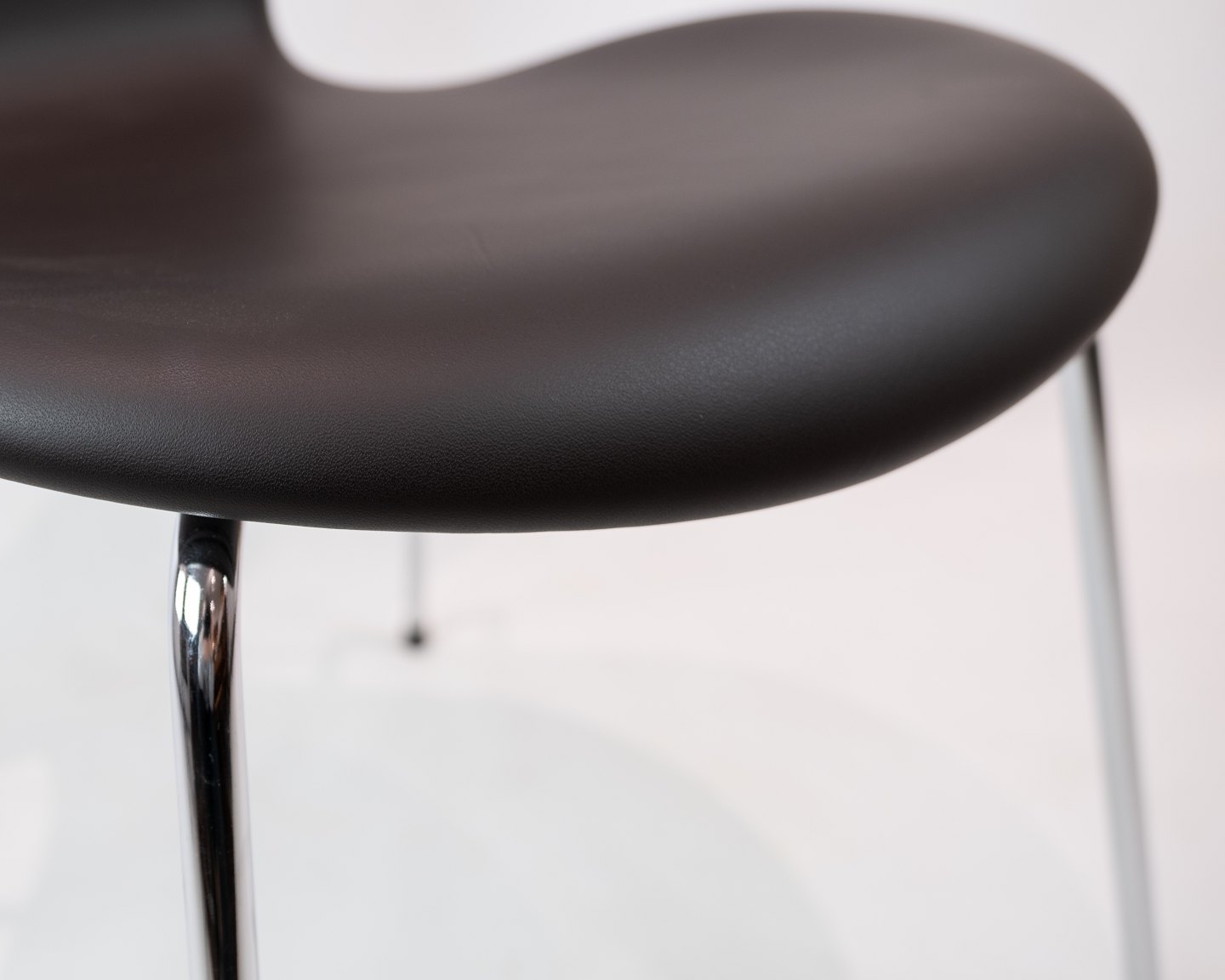 Syver-stolen, også kendt som model 3107, designet af den legendariske Arne Jacobsen og fremstillet hos Fritz Hansen. Disse ikoniske stole er blevet nypolstret i brun mokka Elegance læder, hvilket giver dem et tidløst og luksuriøst udseende.