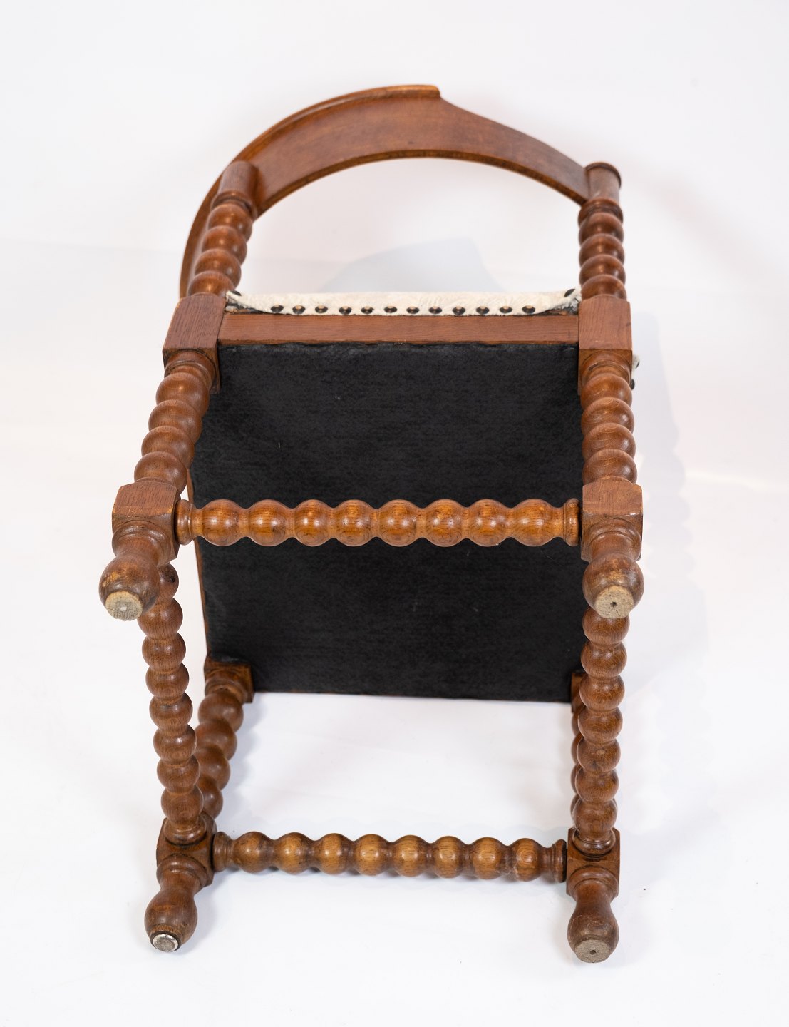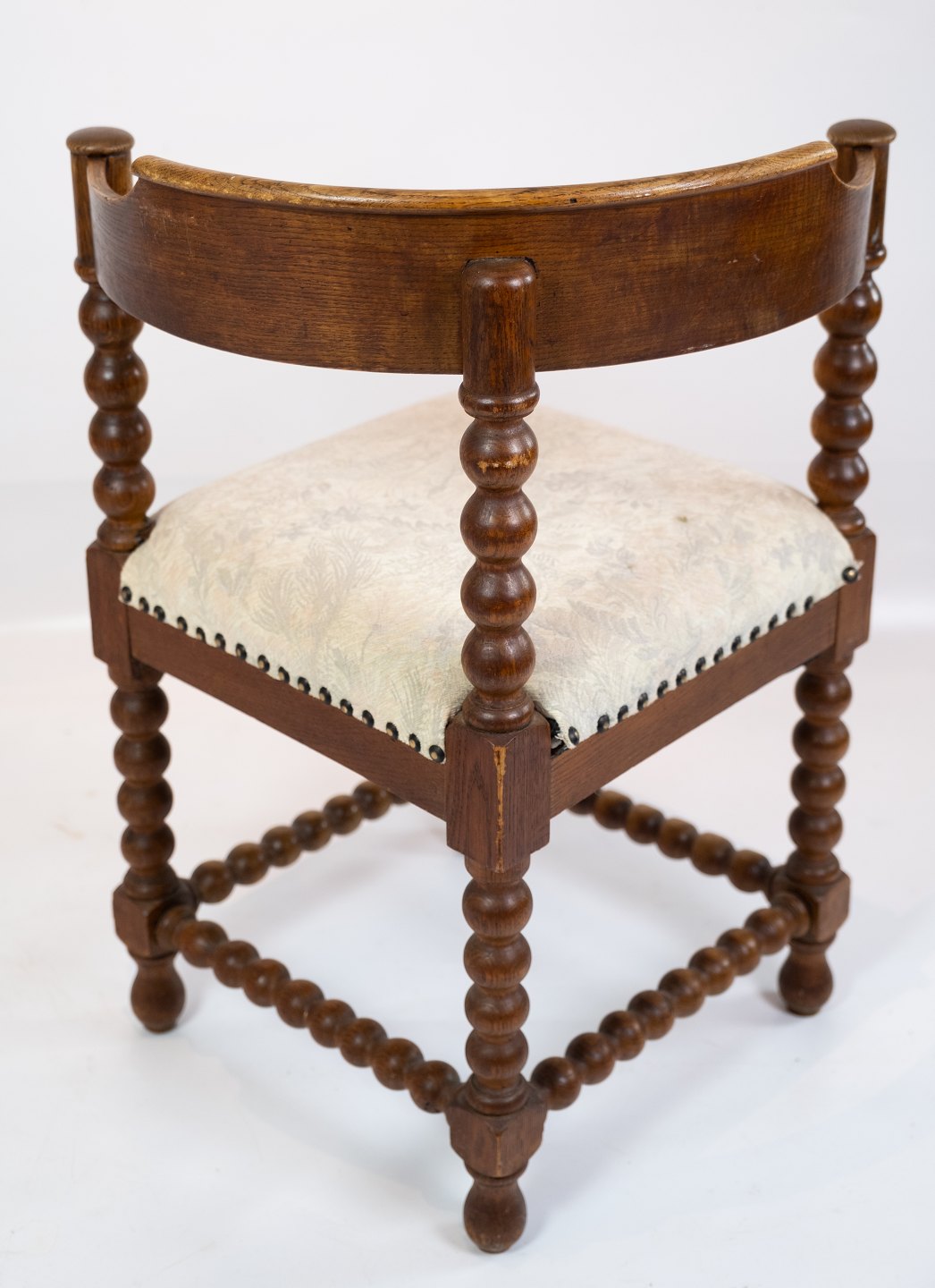 Antik stol med udskæringer af eg og polstret med lyst stof fra 1920erne. Stolen er i flot antik stand.