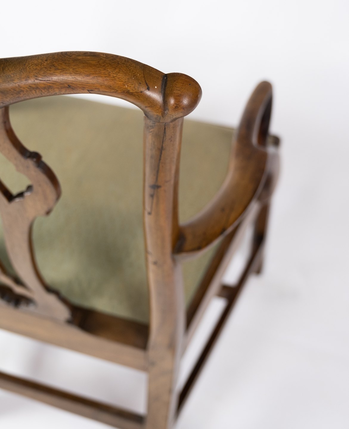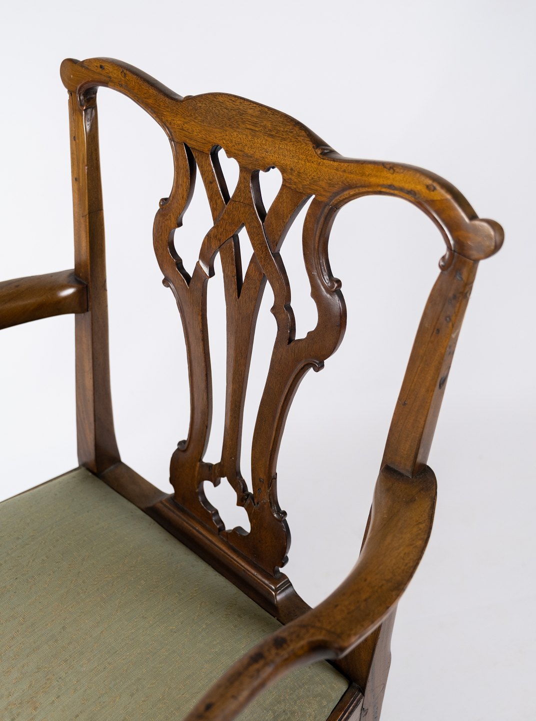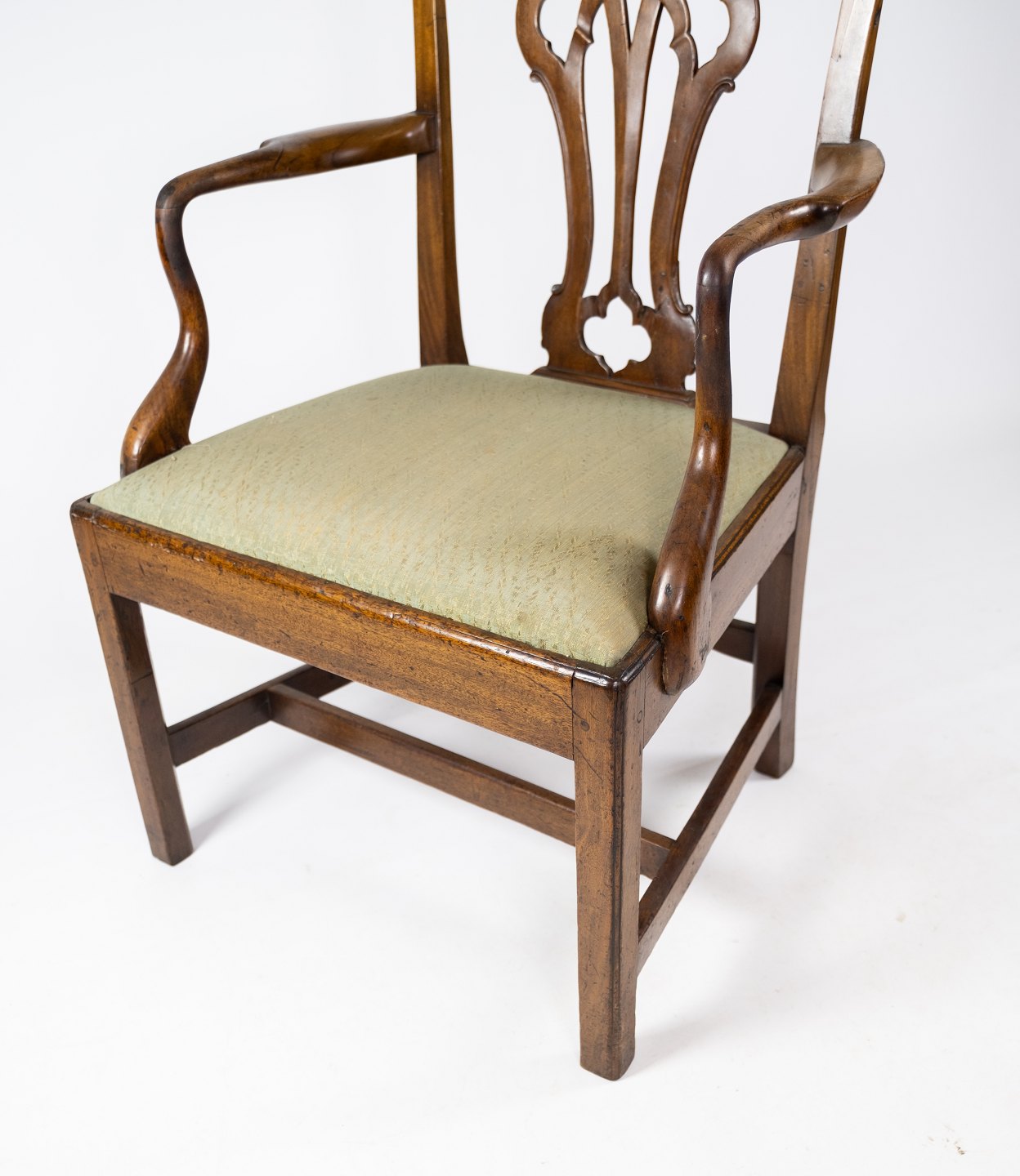 Antik armstol af lys mahogni og polstret med grønt uld stof fra 1890erne. Stolen er i flot brugt stand.