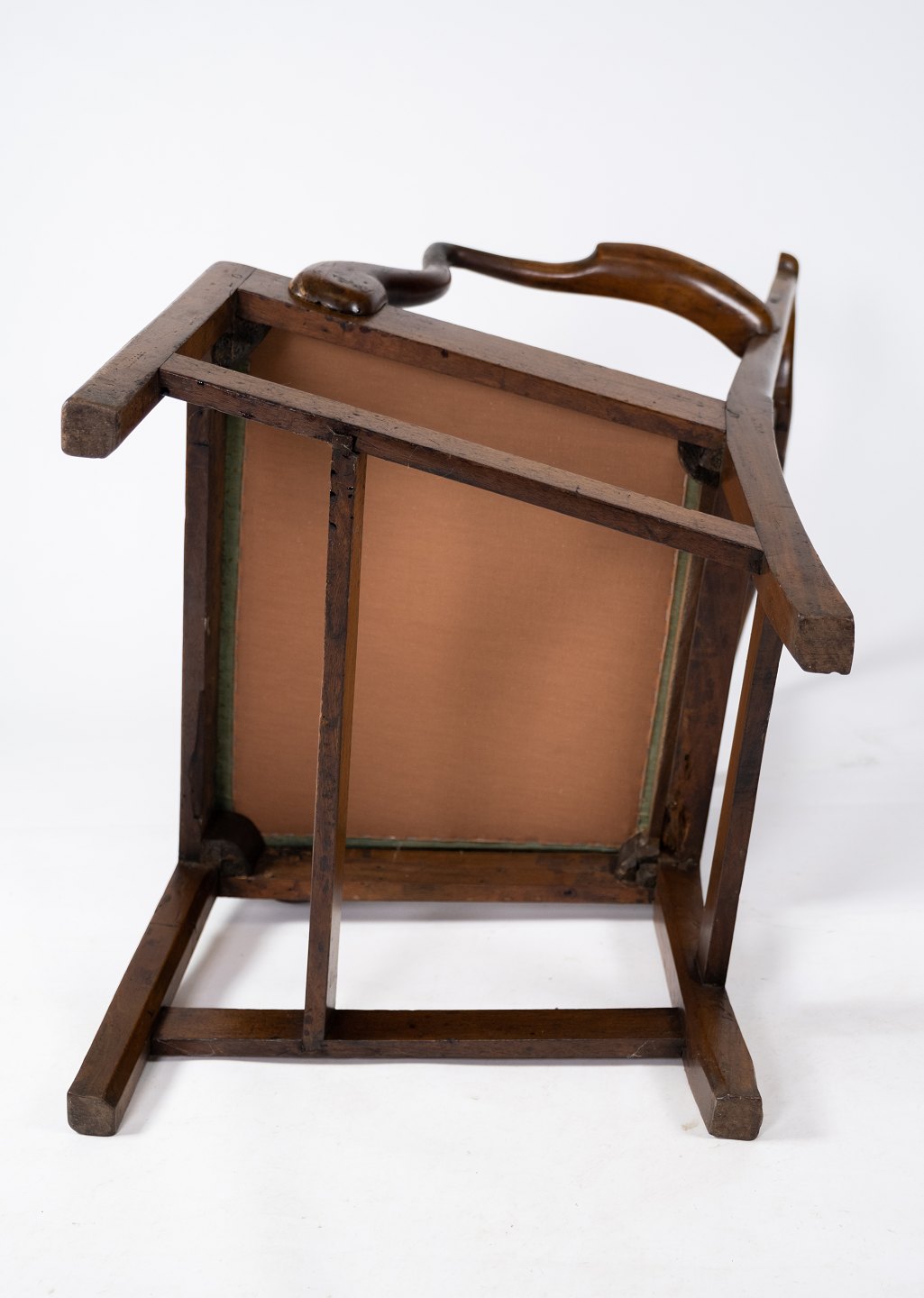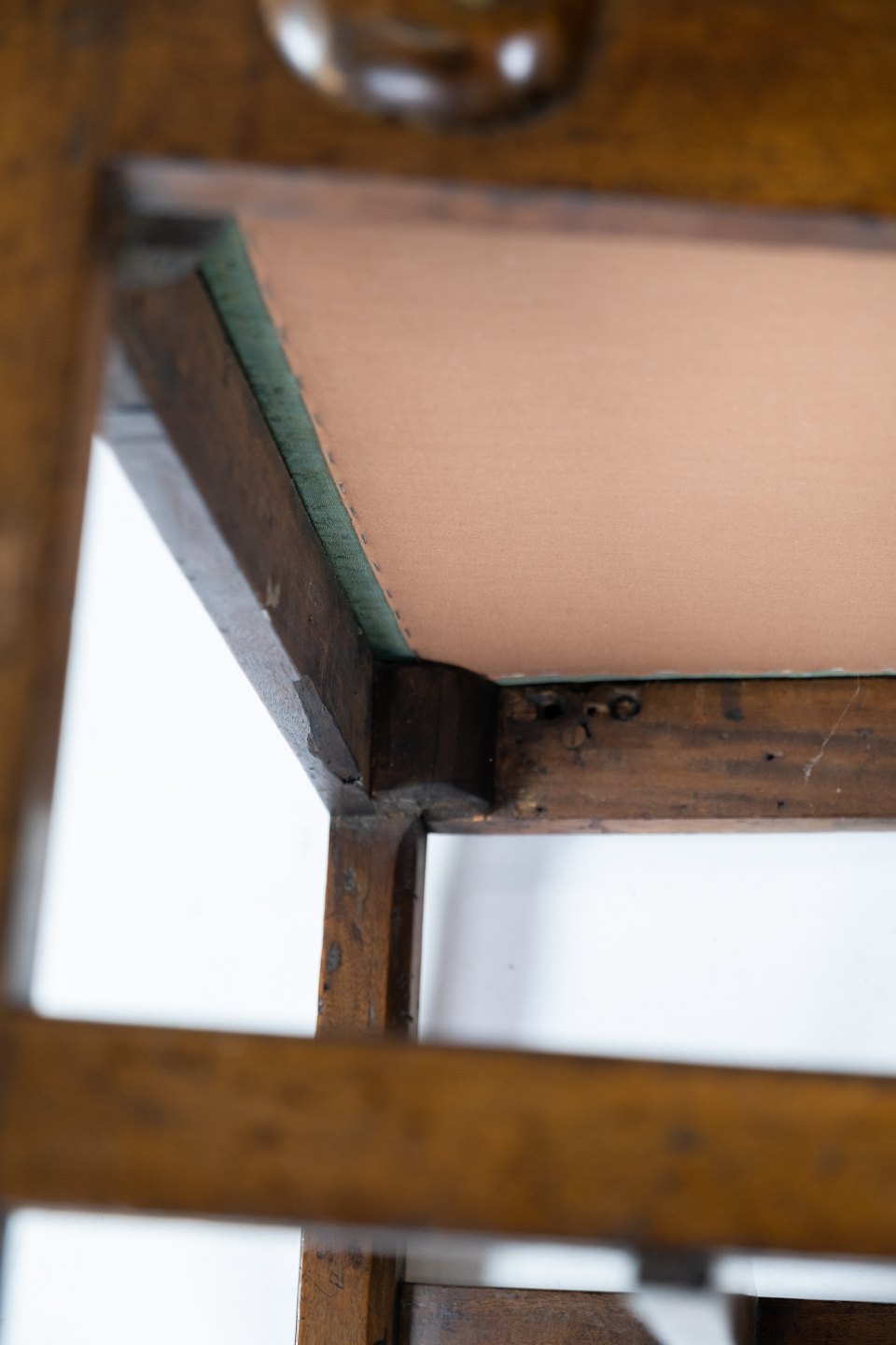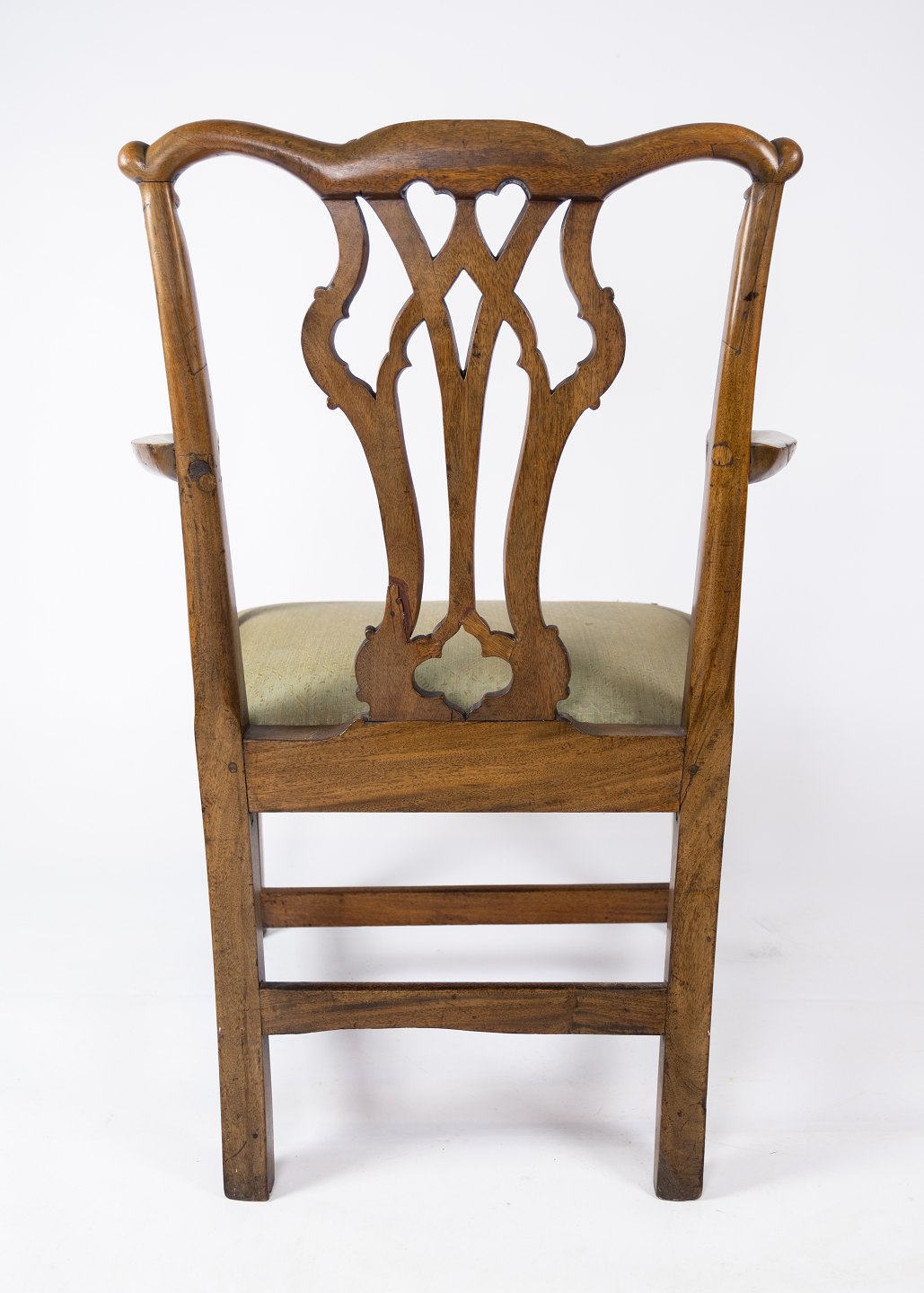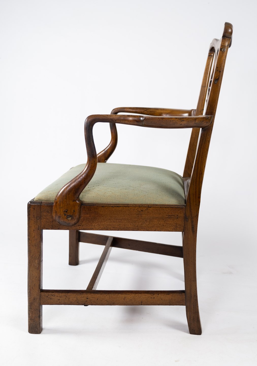 Antik armstol af lys mahogni og polstret med grønt uld stof fra 1890erne. Stolen er i flot brugt stand.