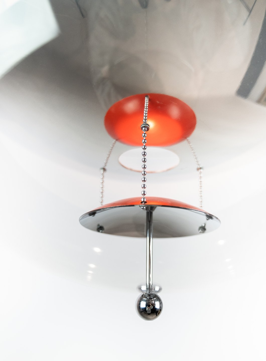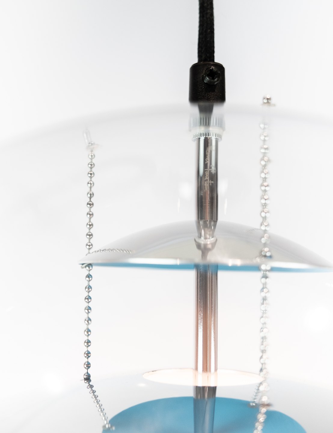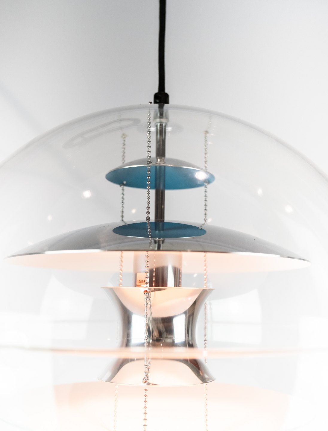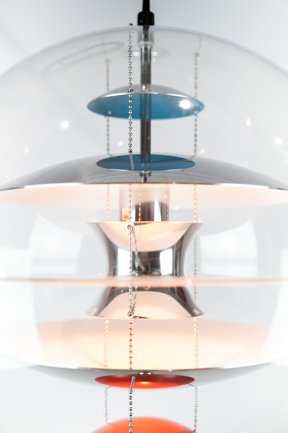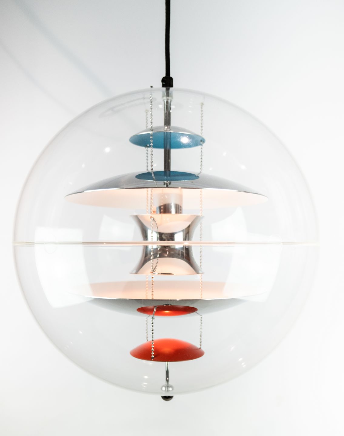 Globe, Ø40, designet af Verner Panton i 1969. Lampen er af transparent akryl med 5 ned hængte metal reflektorer, som er lakeret i hvid, rød og blå.