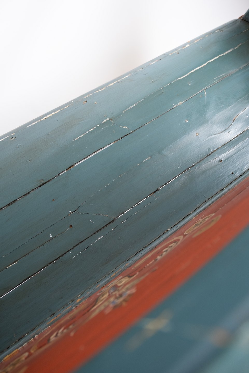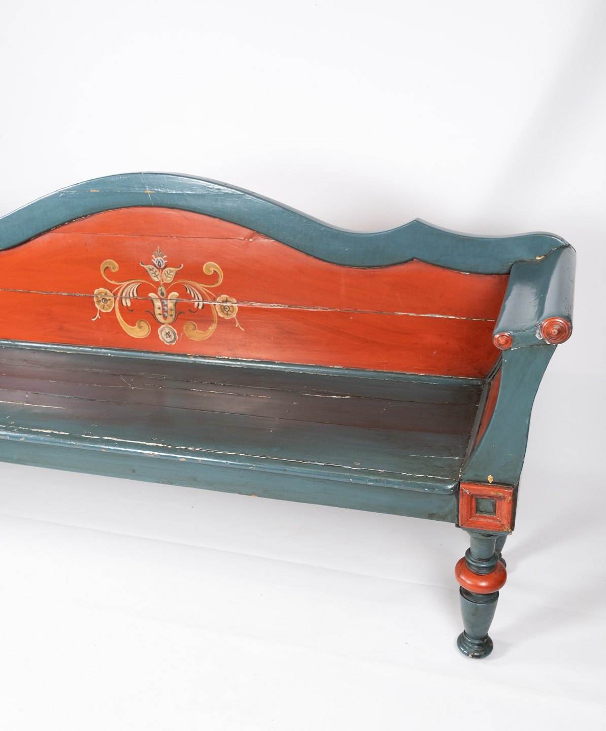 Malet slagbænk i turkise og røde farver, og i flot antik stand fra 1860erne.