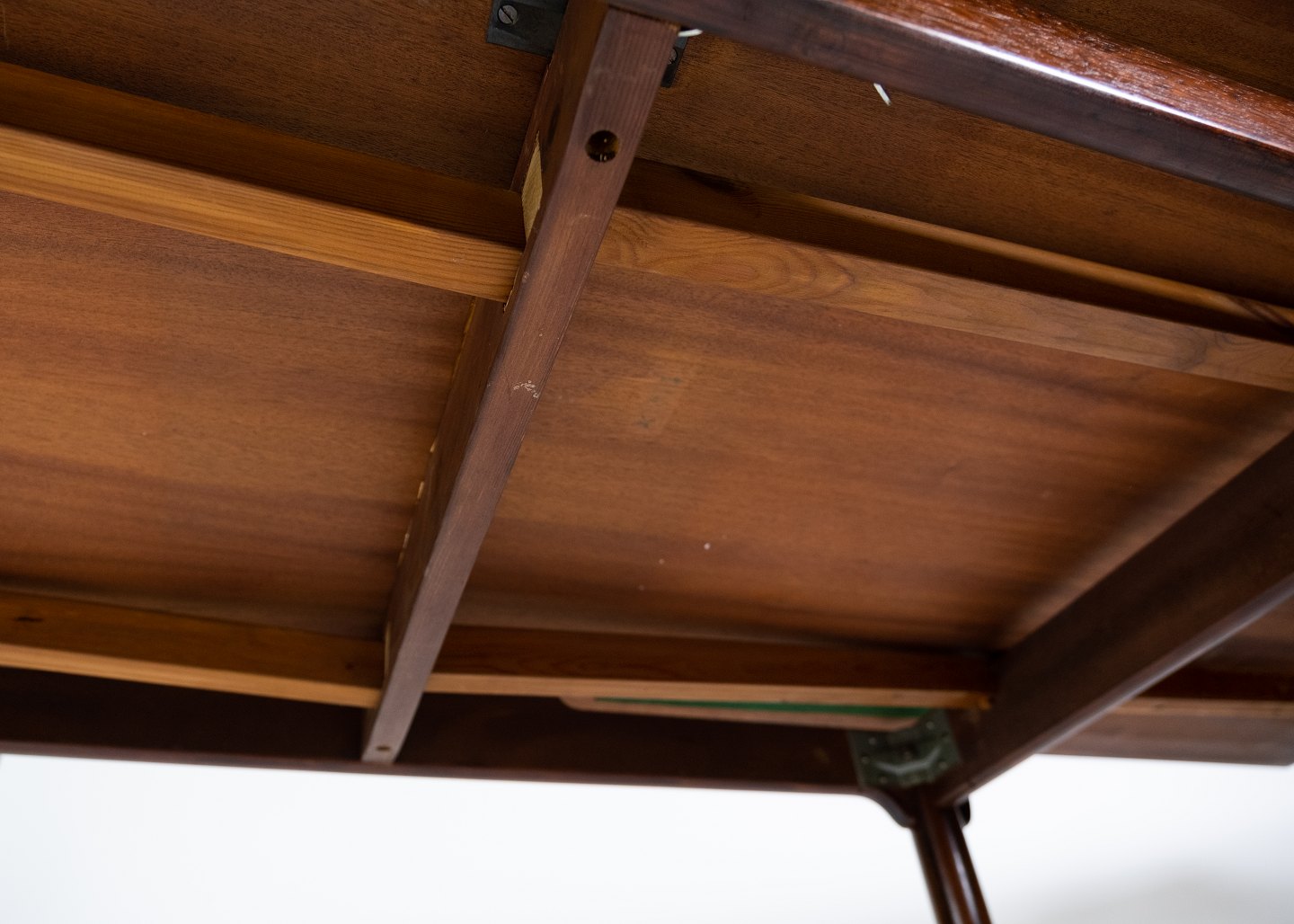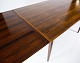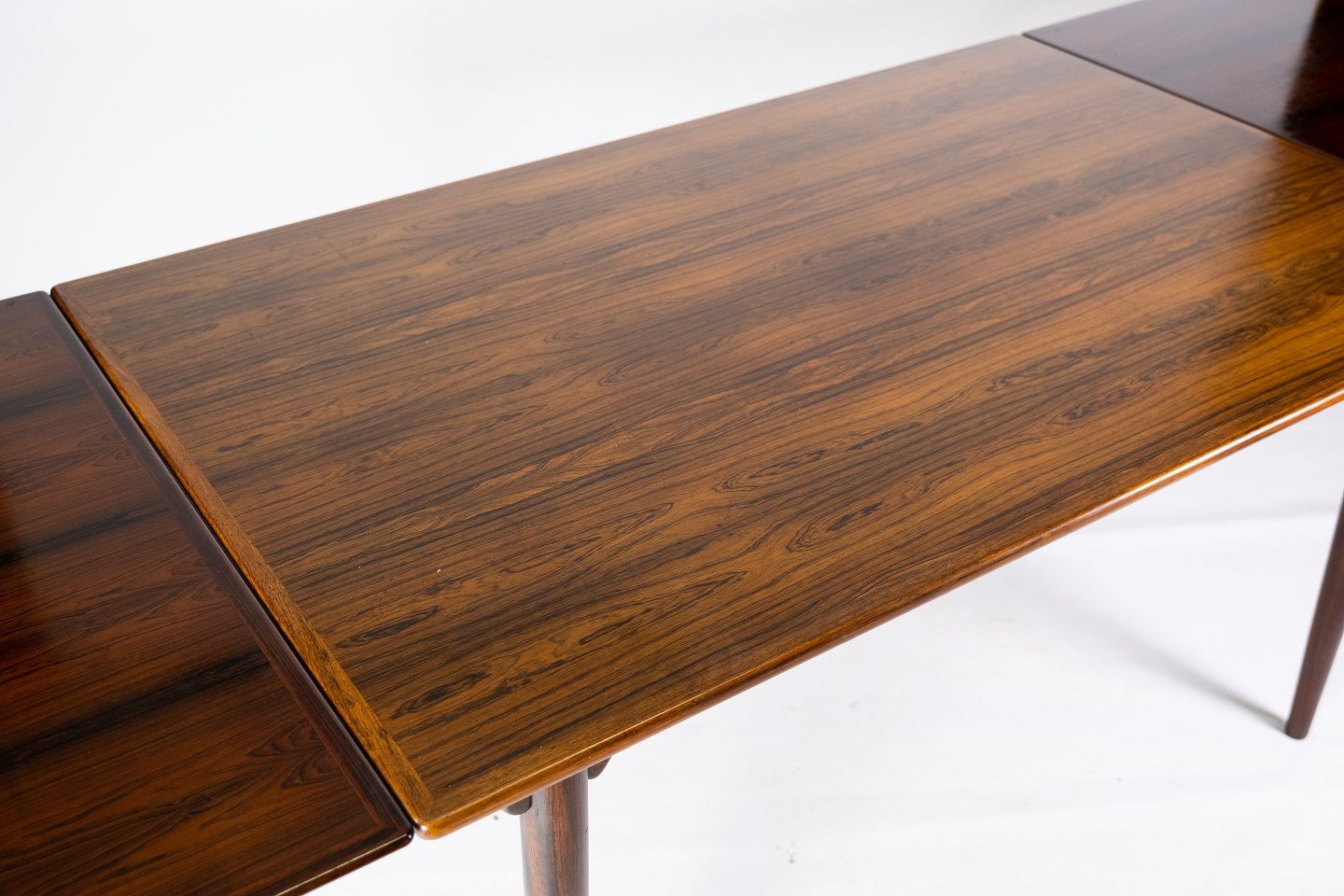 Dette spisebord i palisander, designet af Arne Vodder i 1960'erne, er et smukt eksempel på dansk møbelkunst fra midten af det 20. århundrede. Palisandertræet giver bordet en varm og naturlig glød, mens det hollandske udtræk tilføjer praktisk funktionalitet.
