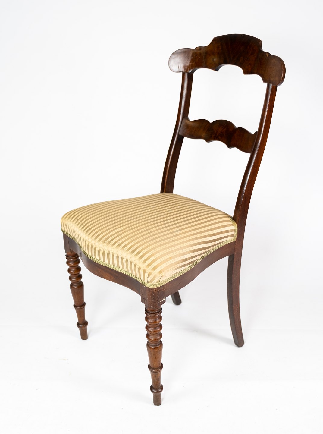 Et sæt salonstole af mahogni og polstret med stribet stof fra 1860erne. Stolene er i flot brugt stand.