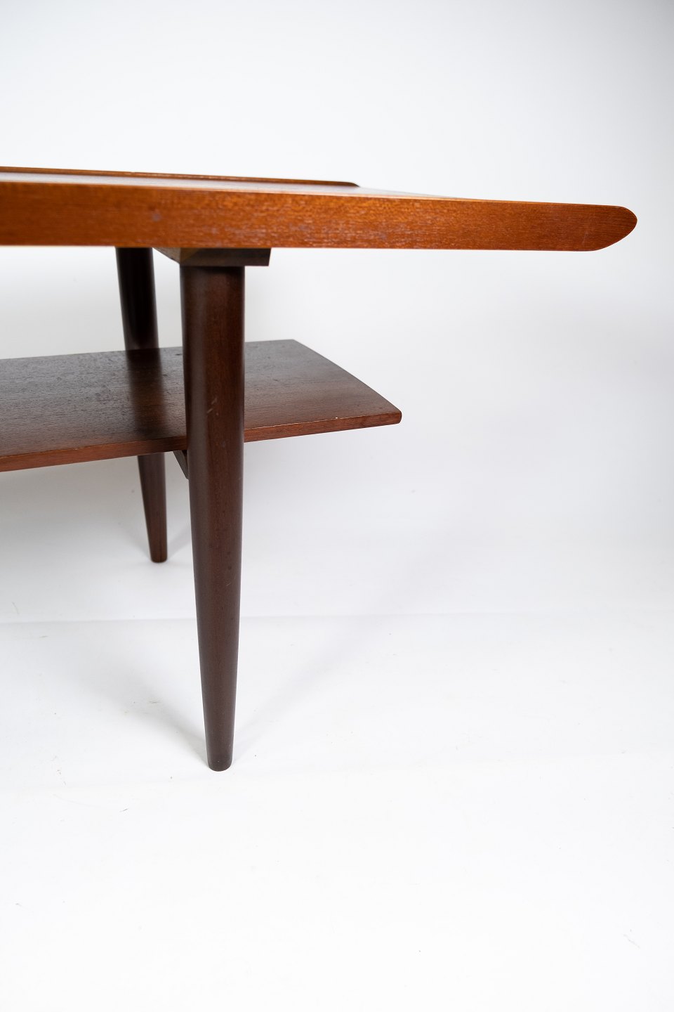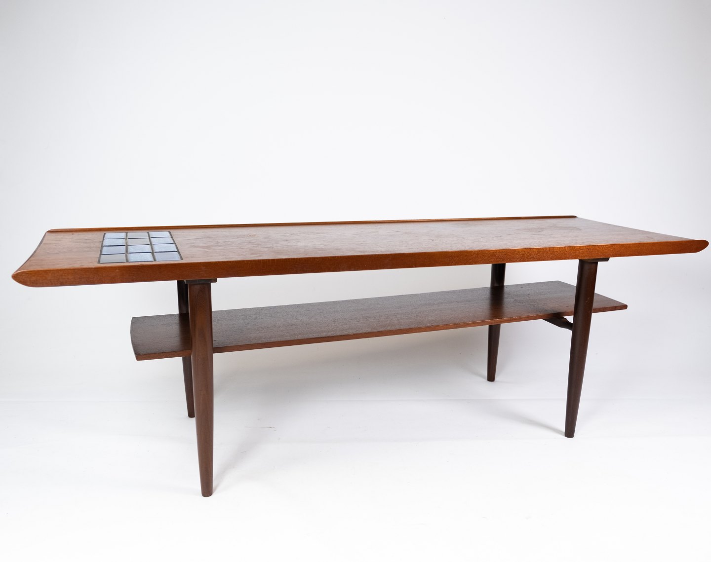 Sofabord i teak med blå klinker af dansk design fra 1960erne. Bordet er i flot brugt stand.