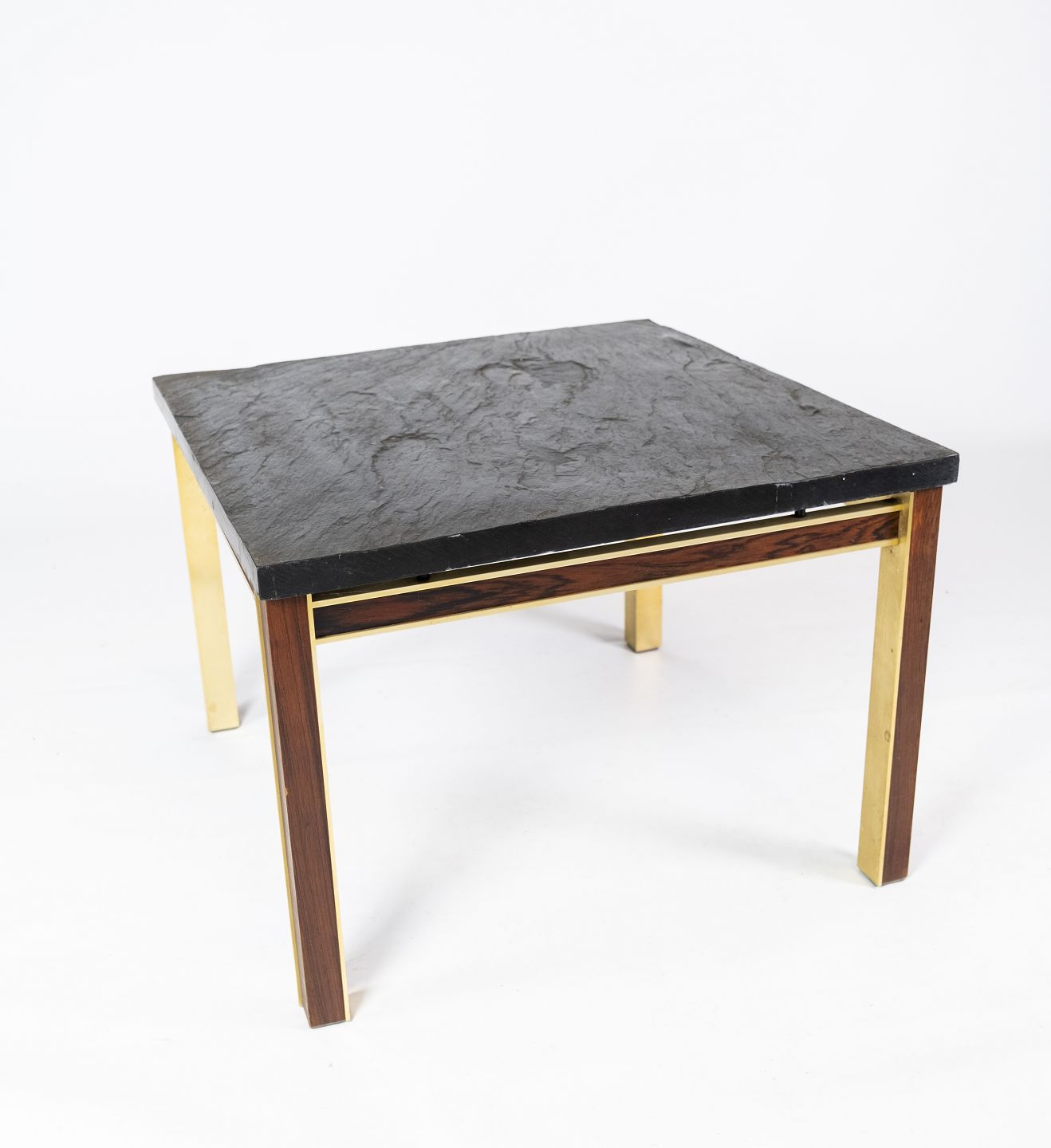 Sofabord med skifer plade og stel i forgyldt metal samt palisander af Bendixen design fra 1970erne. Bordet er i flot brugt stand.
