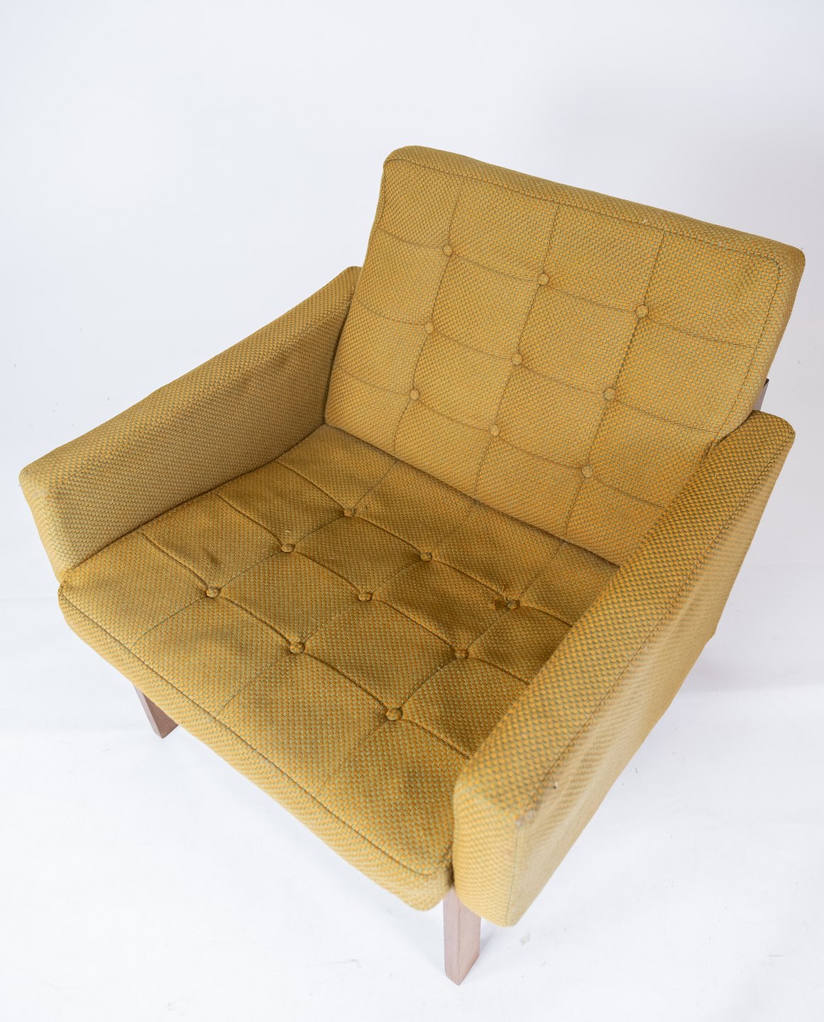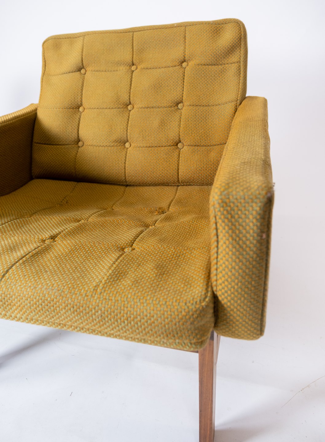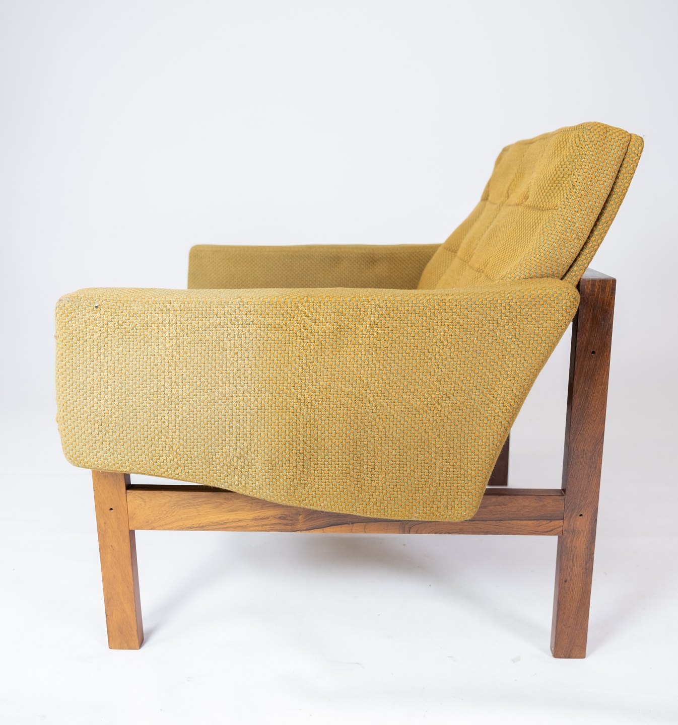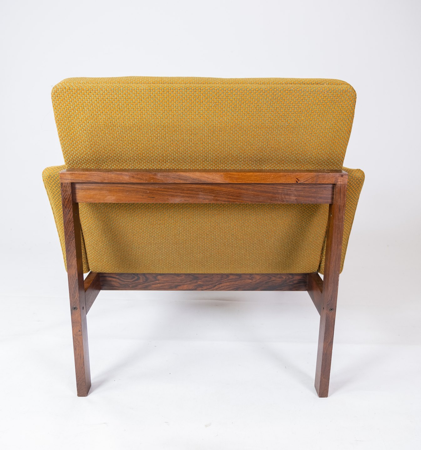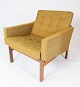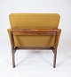 Fremstillet af France & Søn, en anerkendt dansk møbelproducent, er disse stole i flot brugt stand, hvilket vidner om deres holdbarhed og tidløse design. Med deres smukke palisandertræ og det dybe mørkegrønne stof vil disse stole være et elegant og stilfuldt tilføjelse til enhver stue eller læsehjørne.