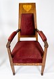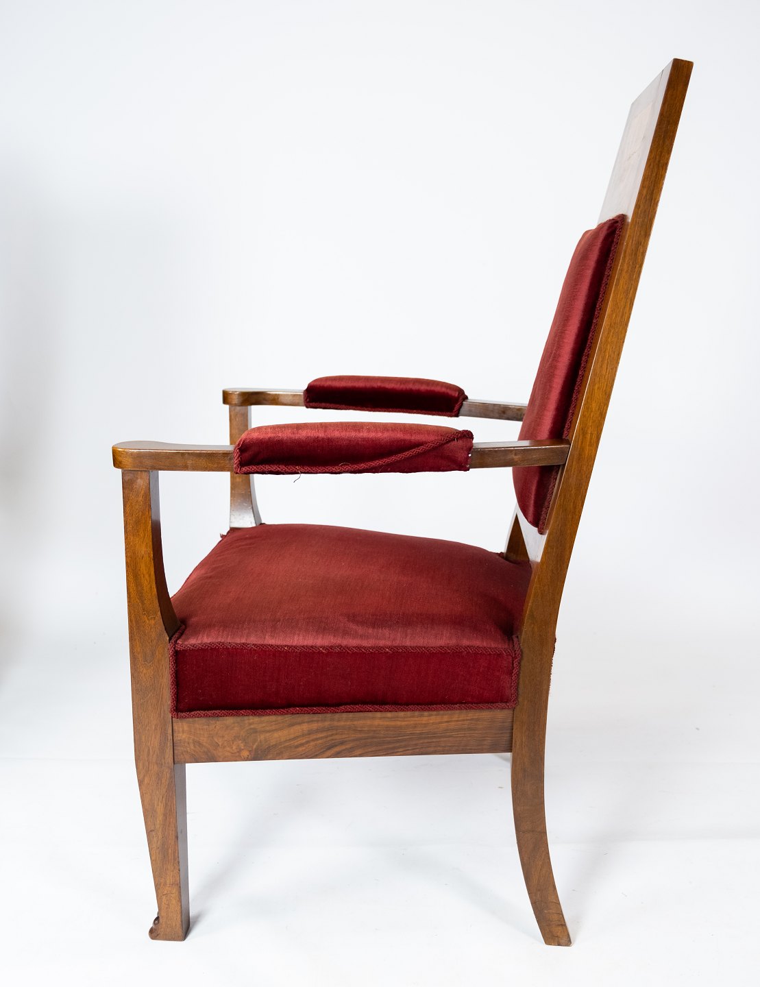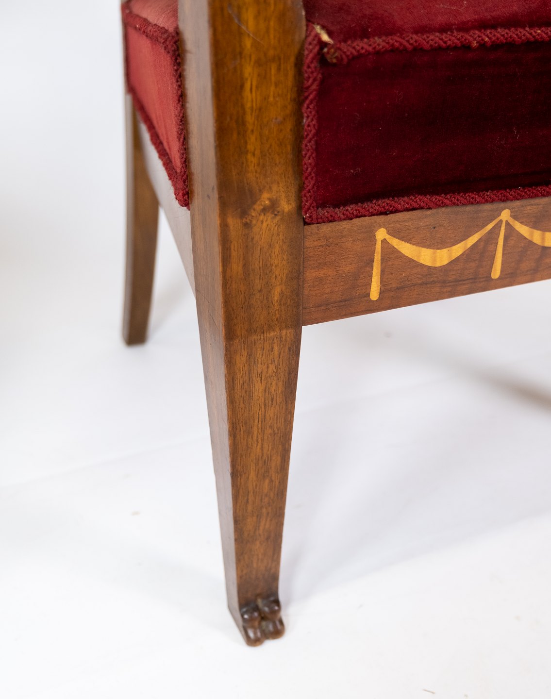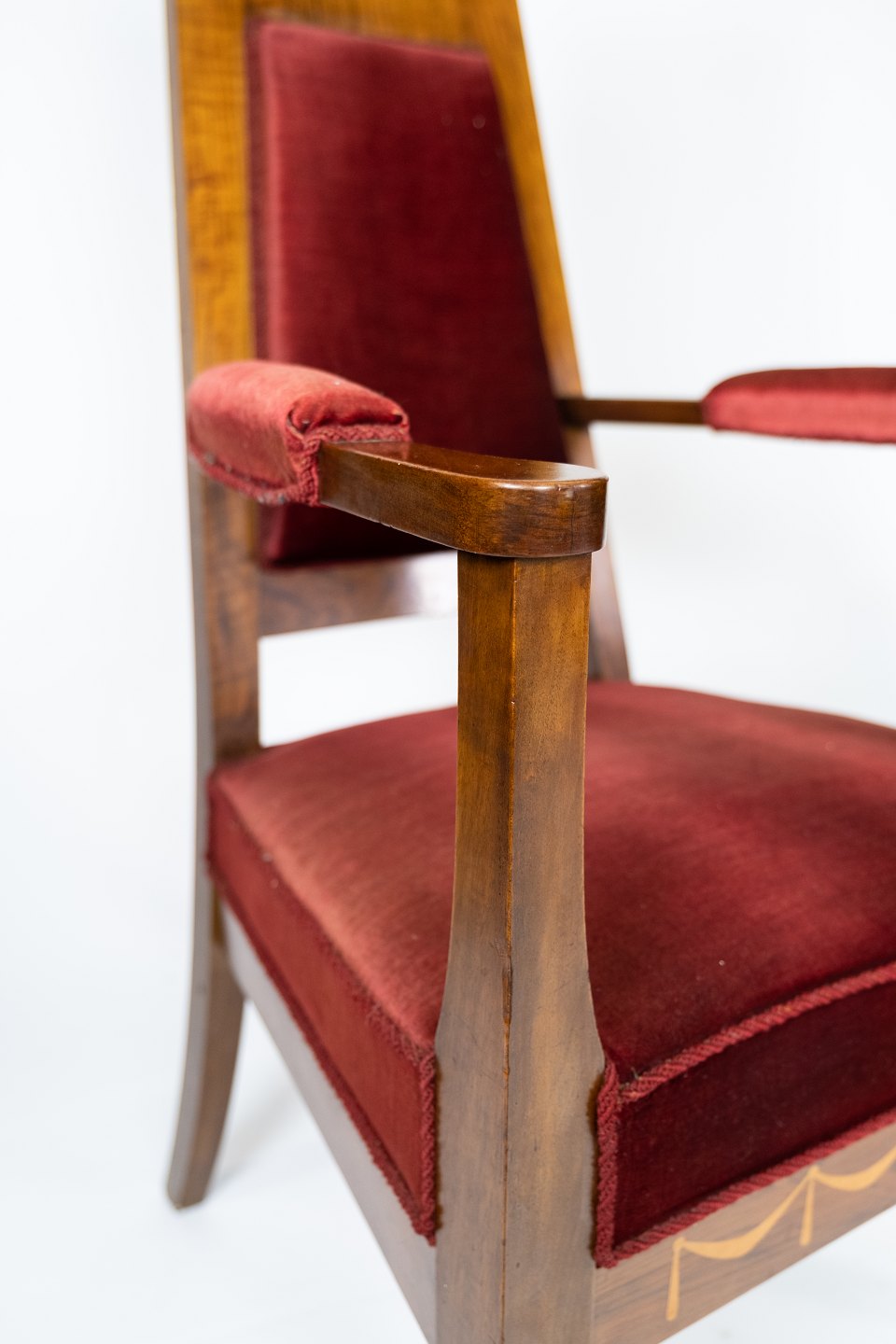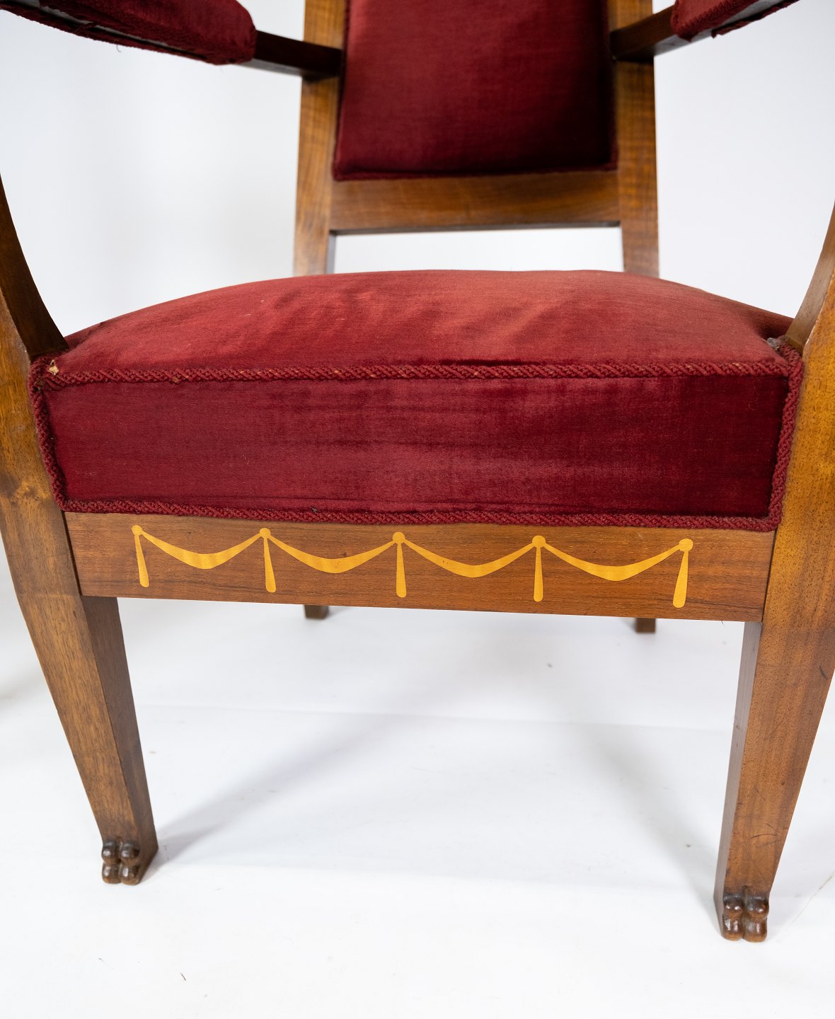 Sæt af to armstole af valnød med intarsia og polstret med rød velour fra omkring 1910. Stolene er i flot brugt stand.