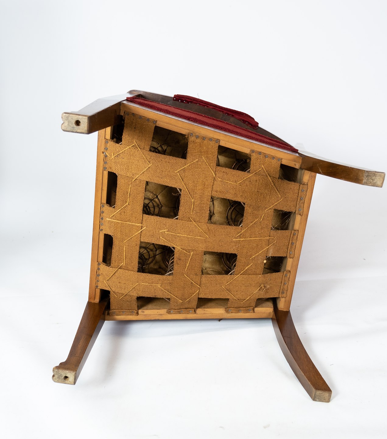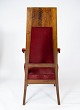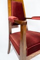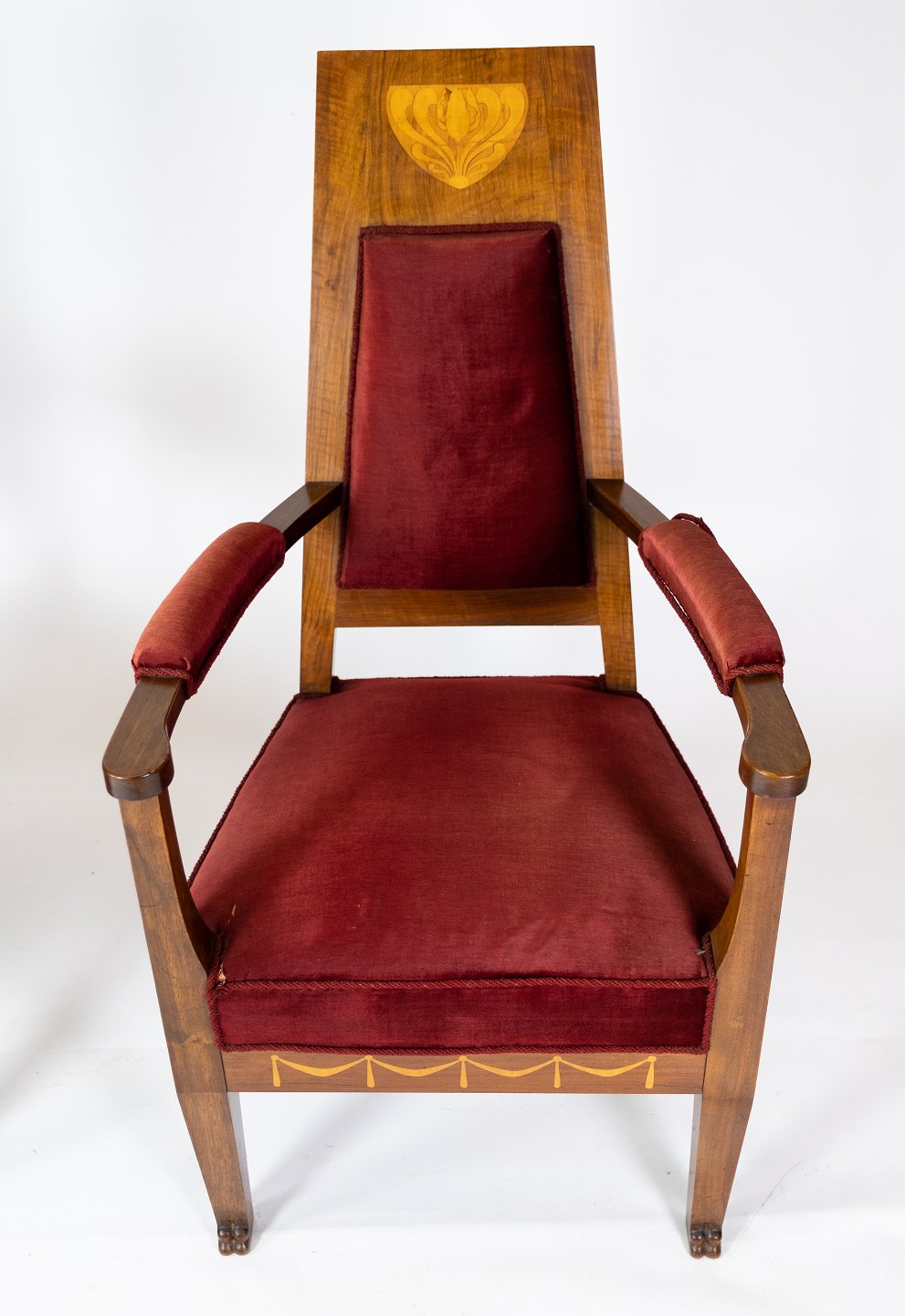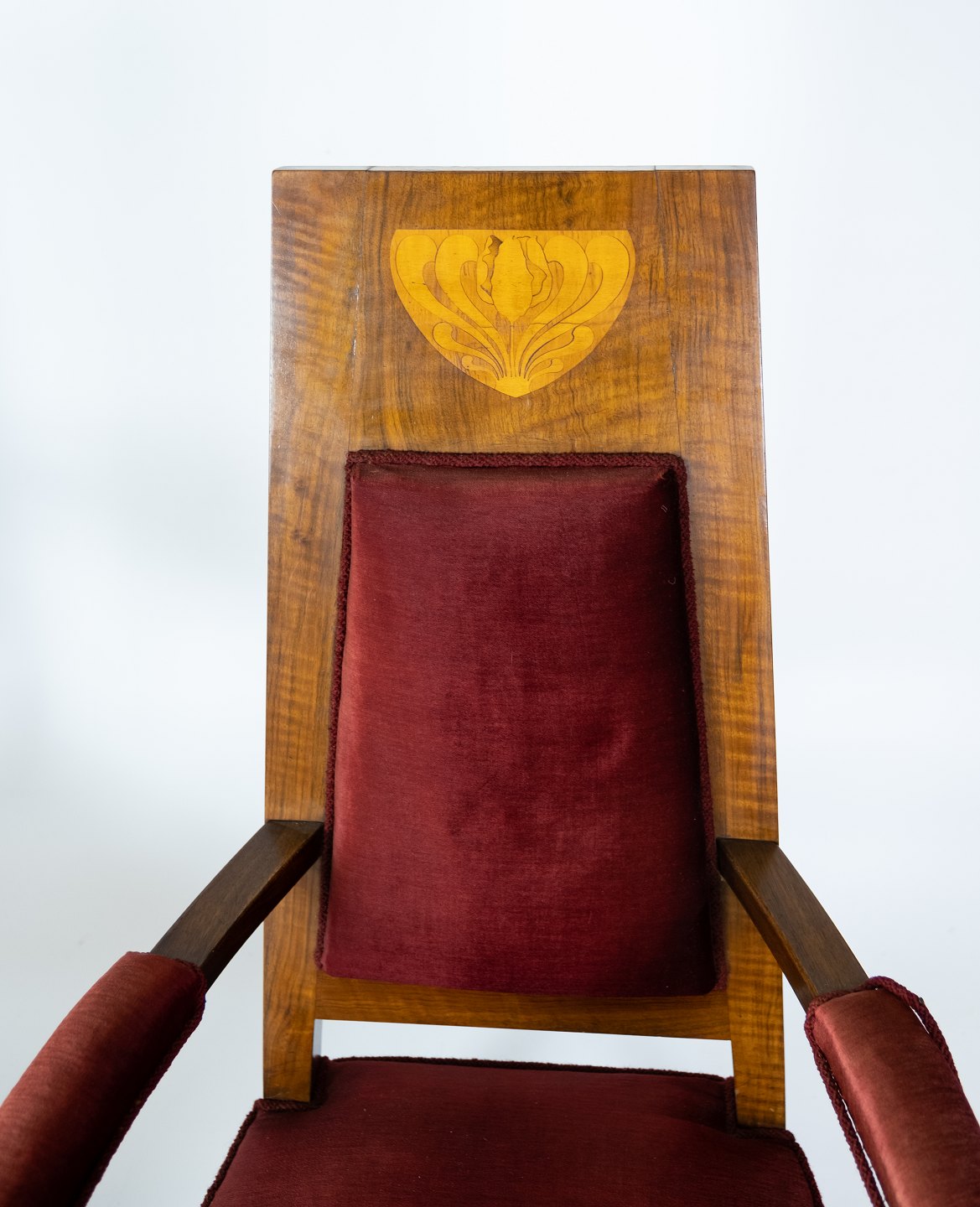 Sæt af to armstole af valnød med intarsia og polstret med rød velour fra omkring 1910.