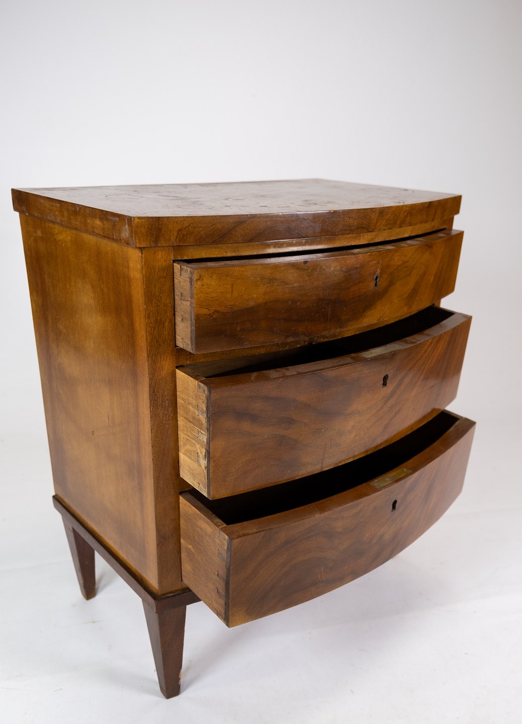 Buet kommode af mahogni og tre skuffer, i flot antik stand fra 1890erne.