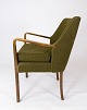 En armstol i birketræ med originalt mørkegrønt stof, af dansk design fra 1950'erne, fremviser en tidløs elegance og enkelhed, der karakteriserer den skandinaviske designtradition fra denne æra.