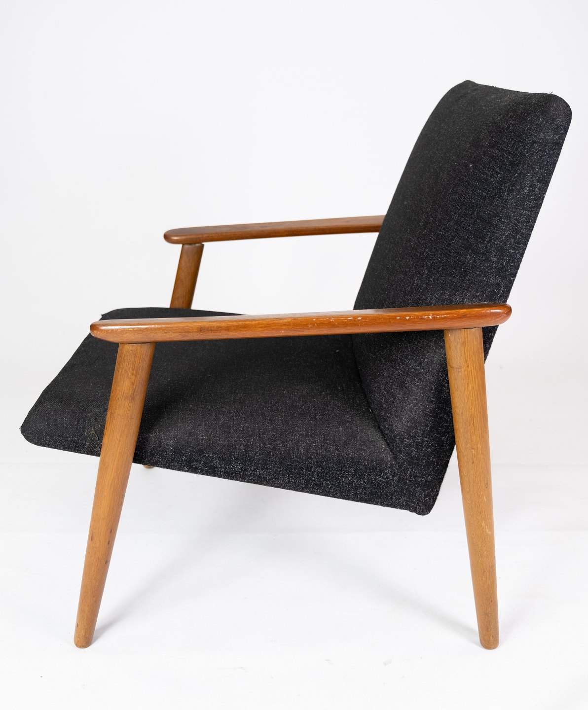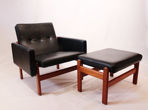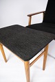 Lænestol med skammel i teak og mørkt uldstof af dansk design fra 1960erne. Sættet er i flot brugt stand.