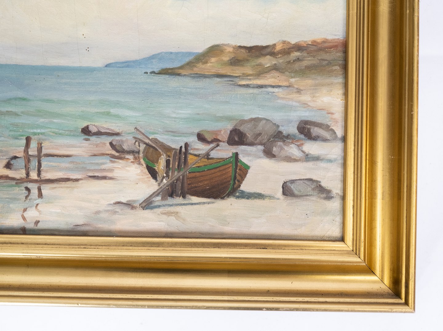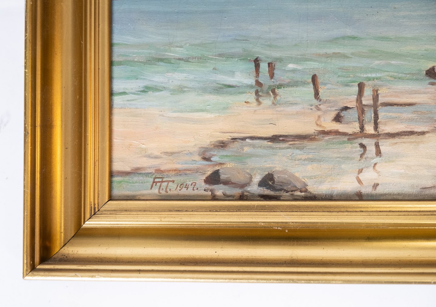 Oliemaleri med strandmotiv og forgyldt ramme, signeret A.T. 1947.