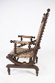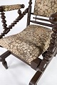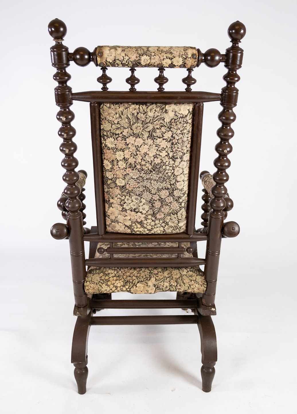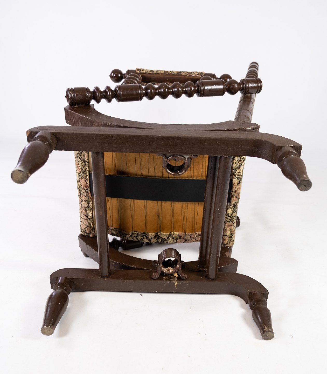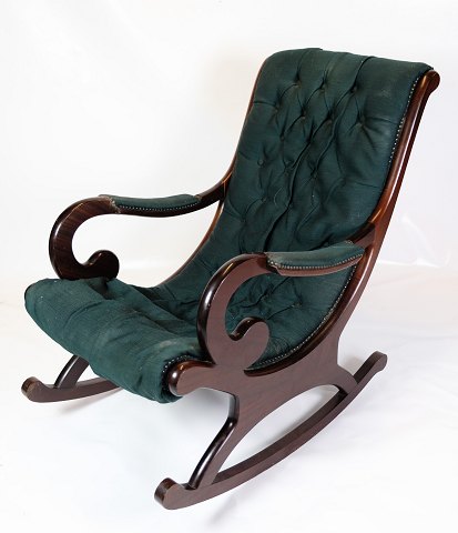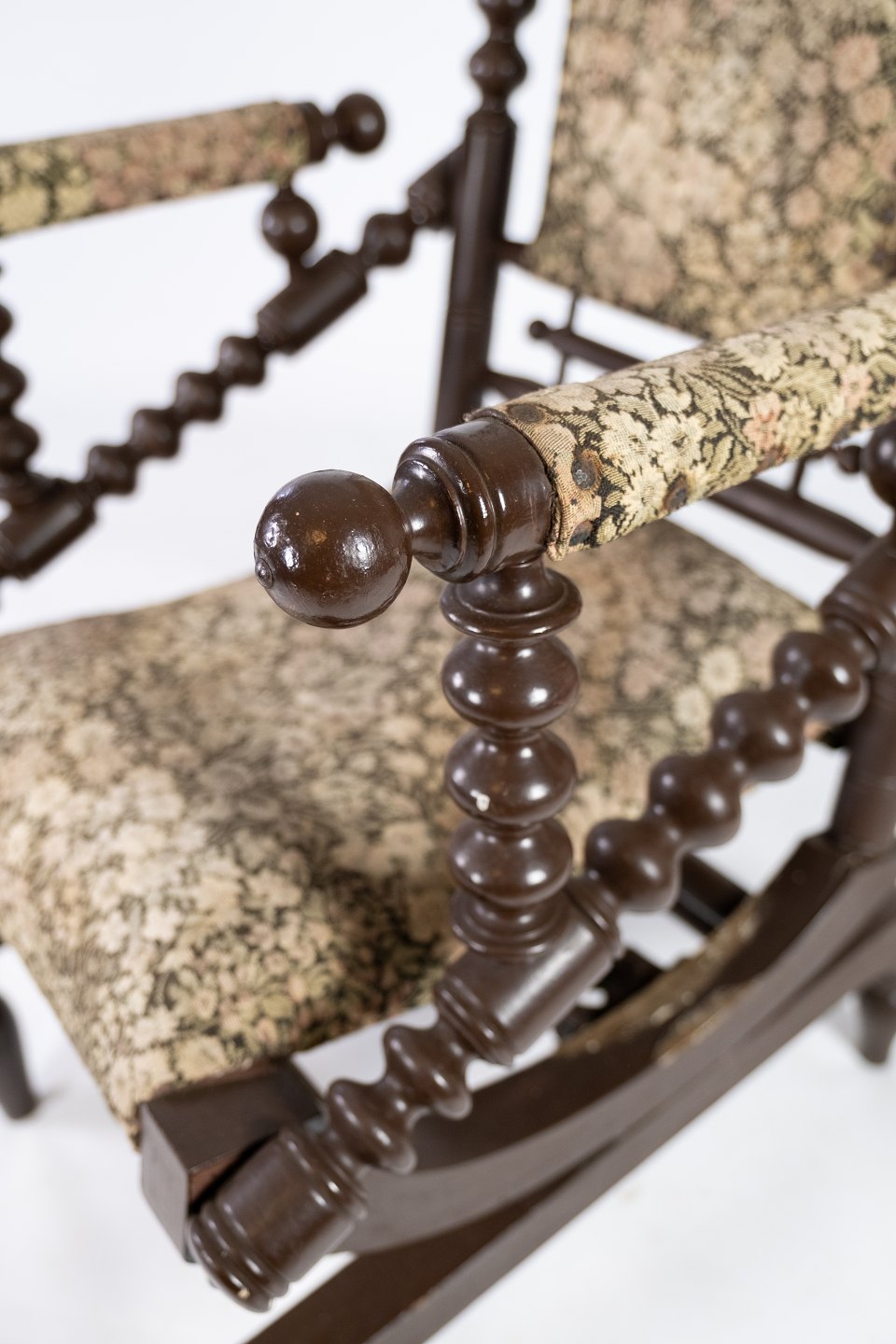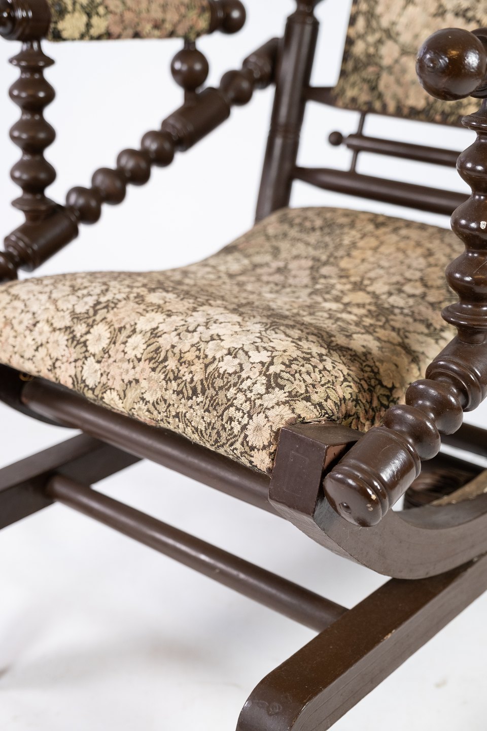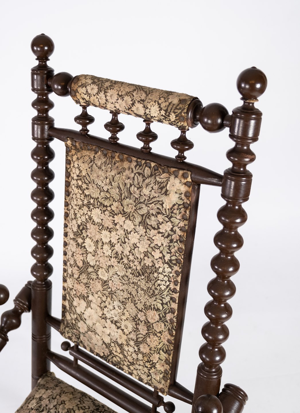 Antik gyngestol af bemalet træ med udskæringer og polstret med originalt blomstret stof fra 1880erne. Stolen er i flot antik stand.