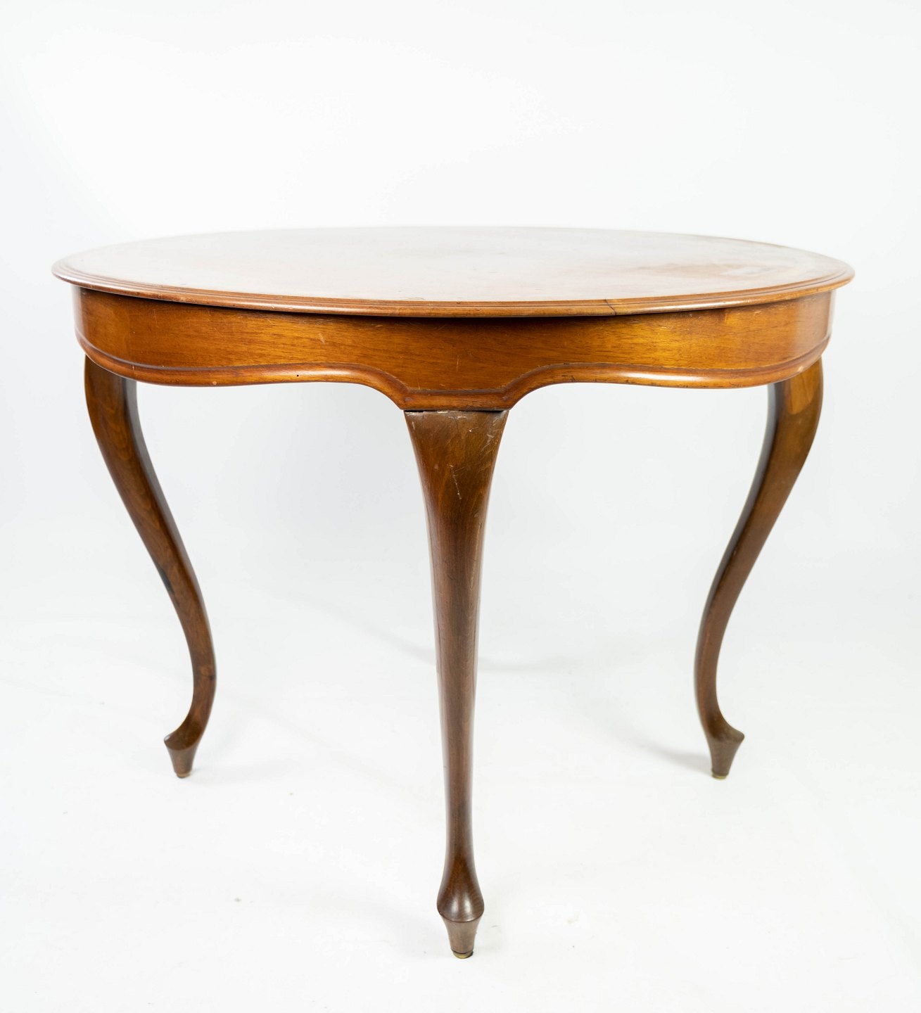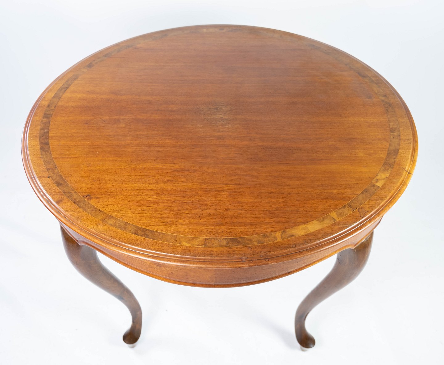 Rundt spisebord af mahogni med intarsia af valnød, i flot brugt stand fra 1880.
