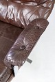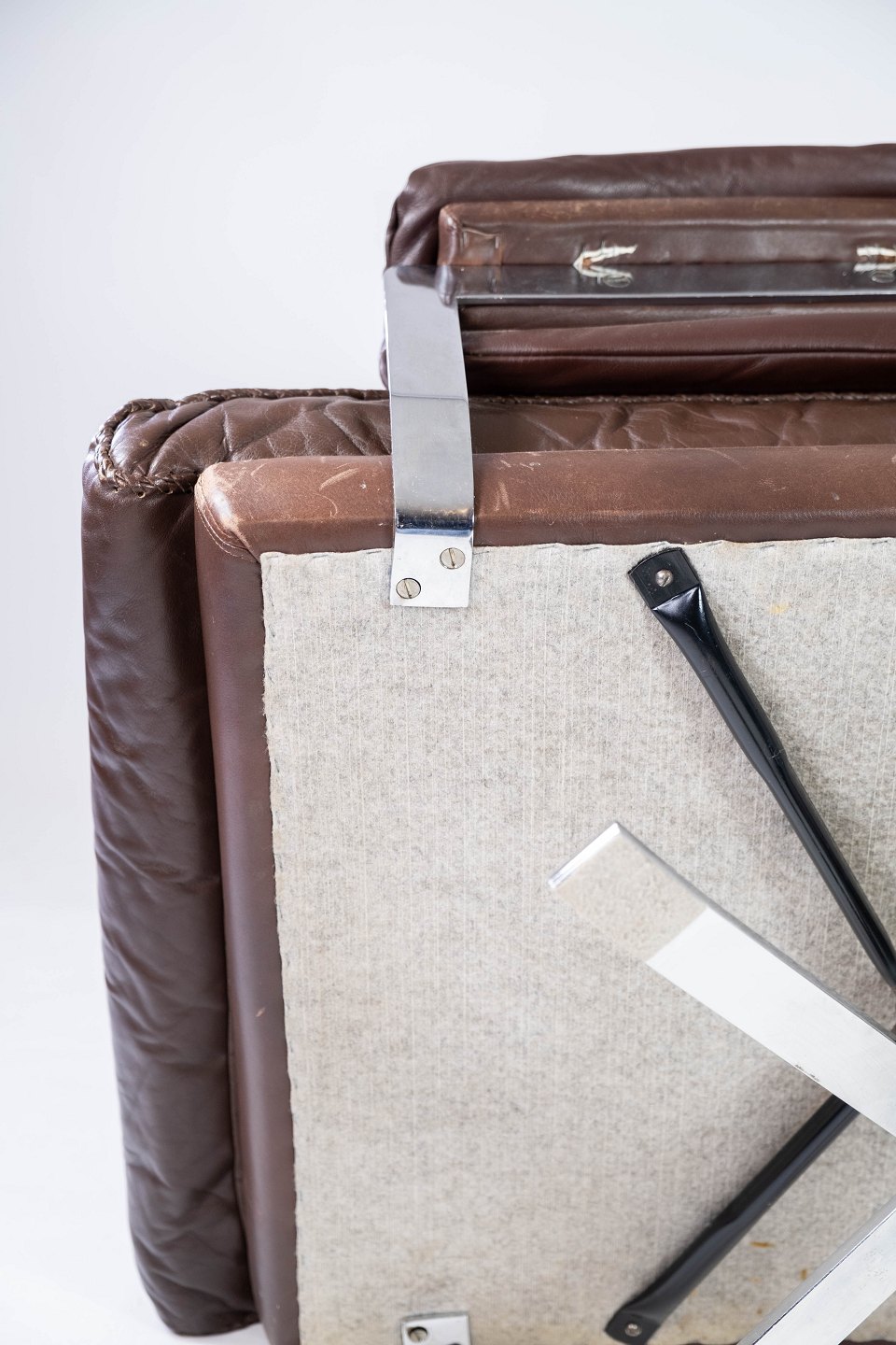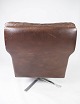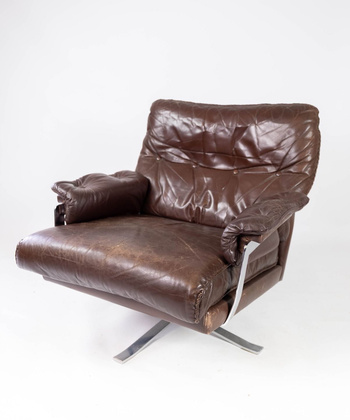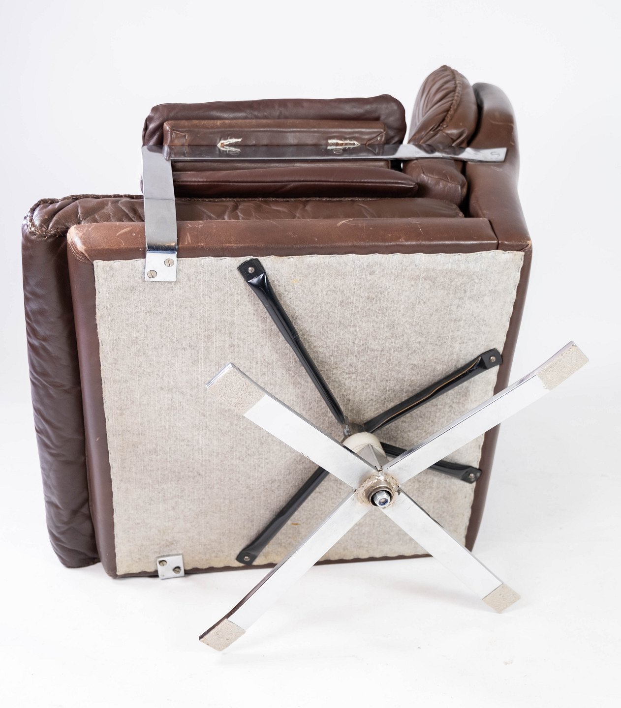 Denne lænestol i patineret brunt læder og stel i metal er et tidløst møbelstykke designet af den anerkendte svenske designer Arne Norell og fremstillet af Vatne Møbler i 1970'erne.