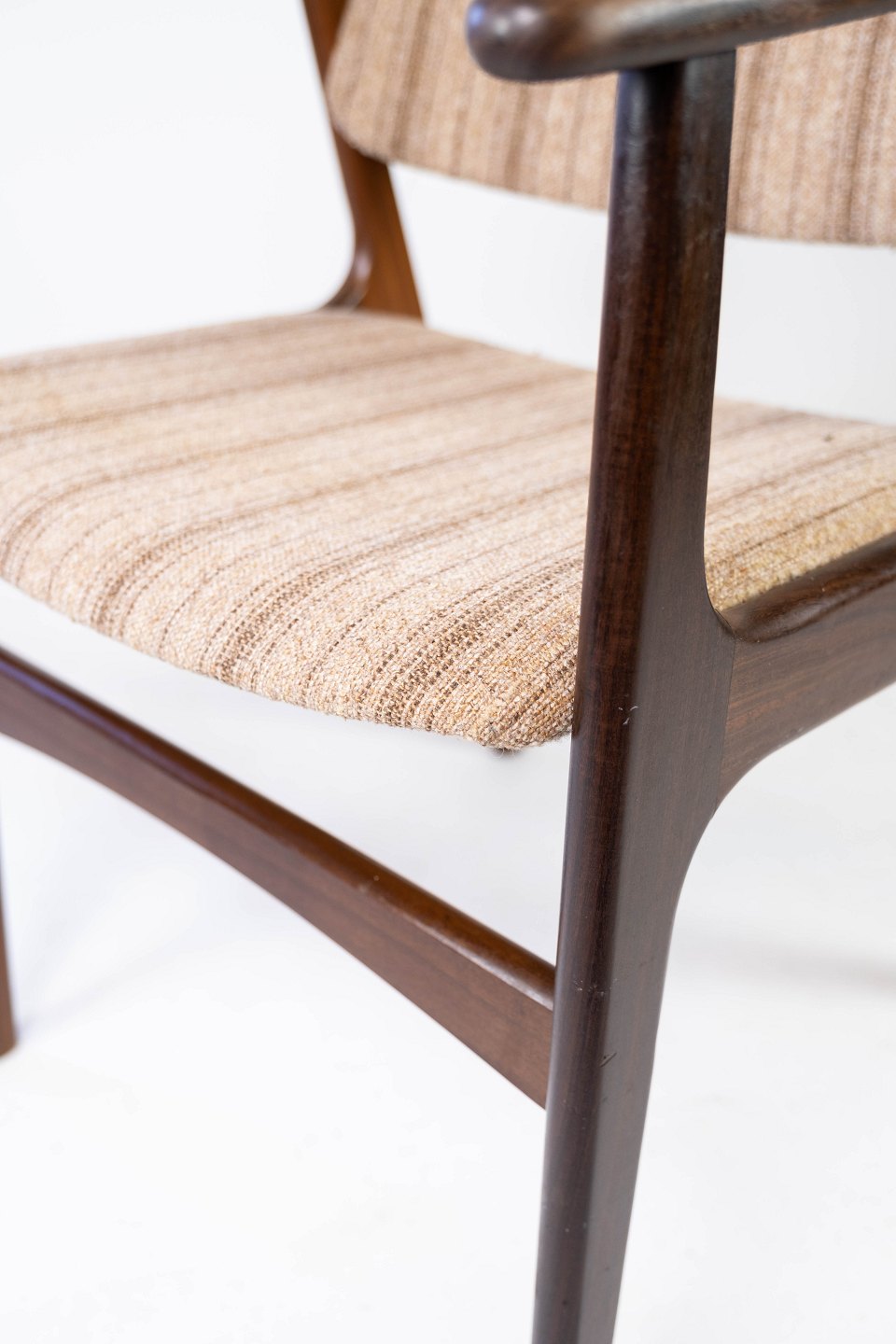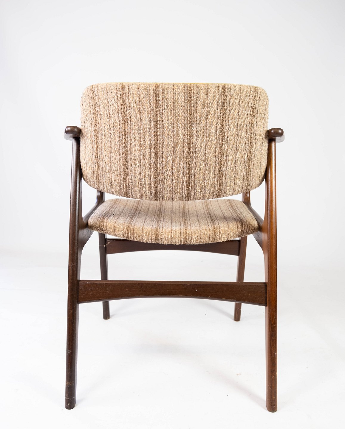 Denne spisestuestol i teak, kendt som model "Lene", er et smukt eksempel på dansk møbeldesign fra 1960'erne. Stolen er polstret med et elegant stribet stof, der tilføjer både komfort og æstetik til enhver spiseplads.