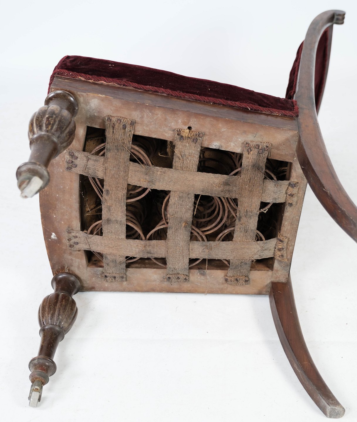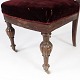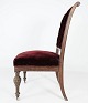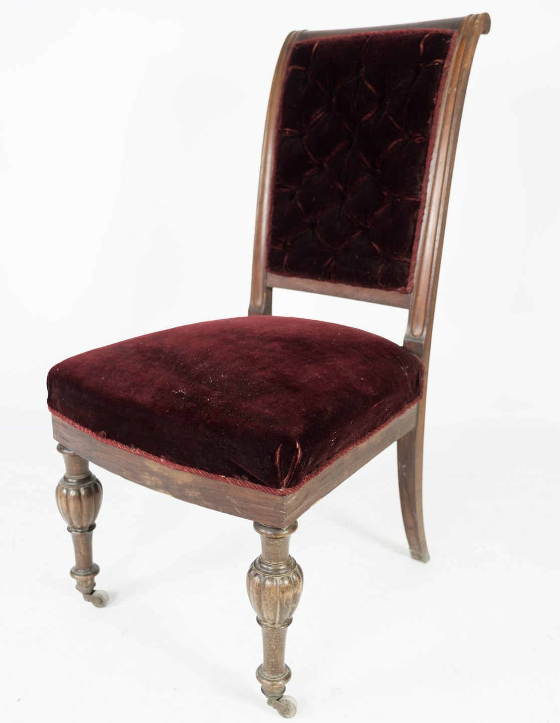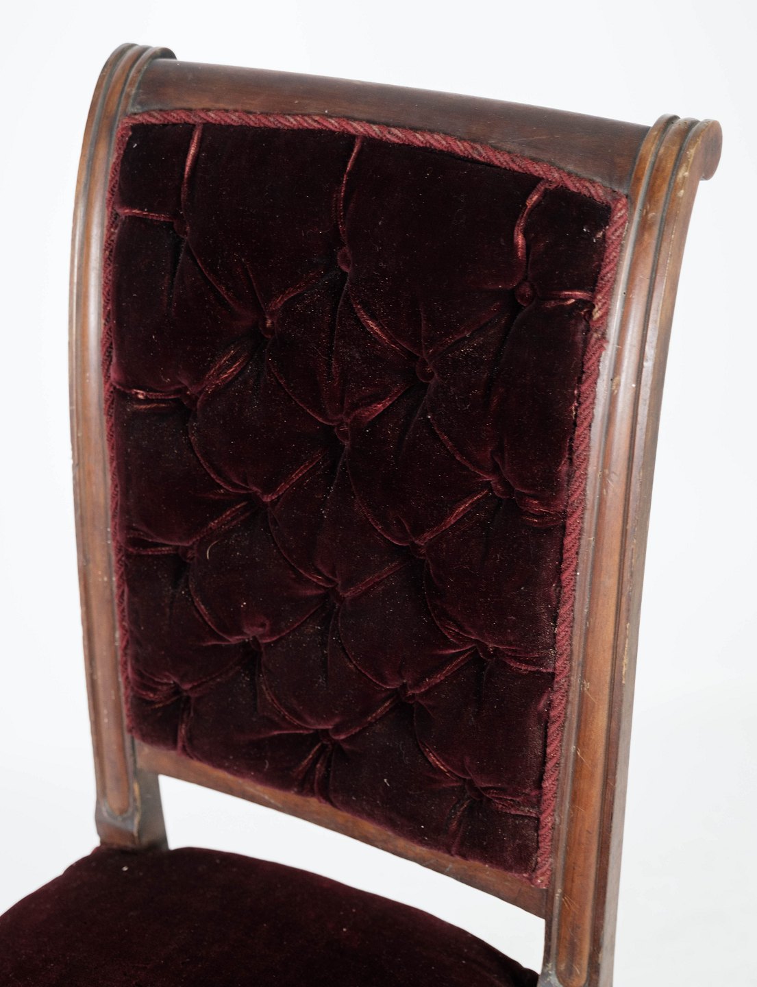 Sæt af fire spisestuestole af mahogni og polstret med bordeaux velour fra 1920erne. Stolene er urestaureret.