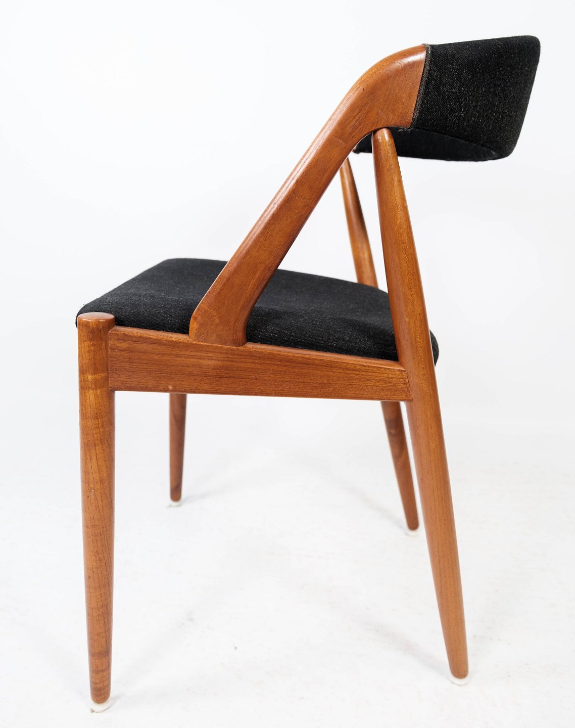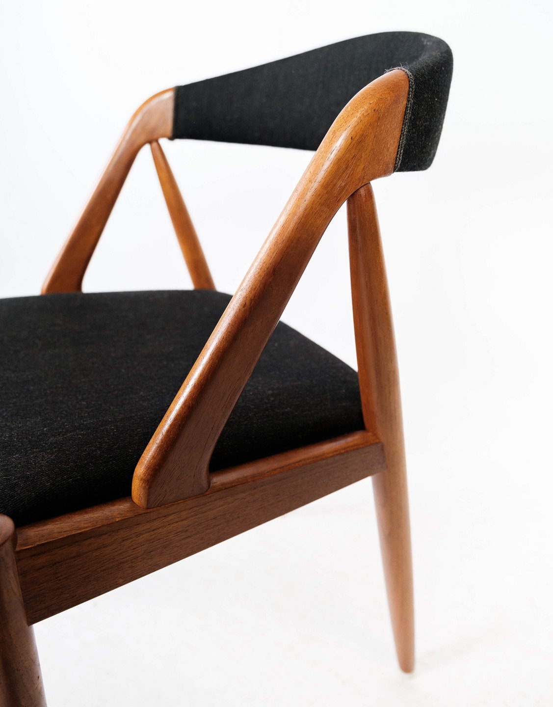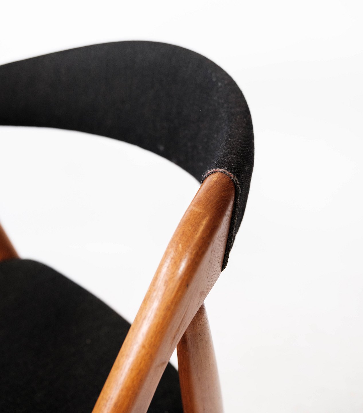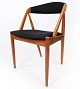 SolgtSpisestuestol, model 31, designet af Kai Kristiansen i 1956 og fremstillet hos Schou Andersen i 1960erne. Stolen er i teak og polstret med sort stof.