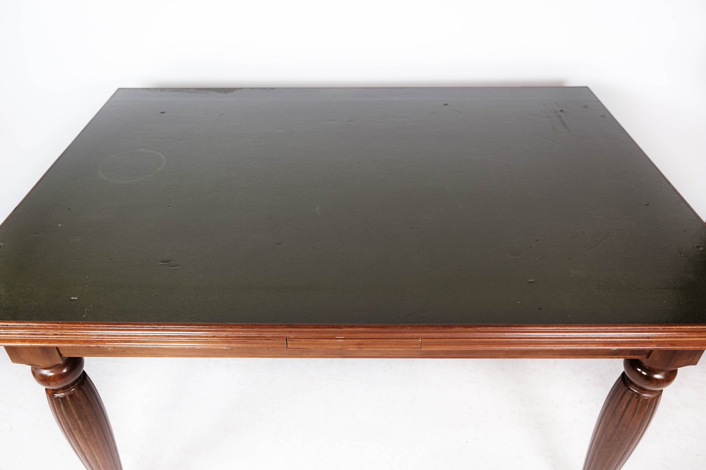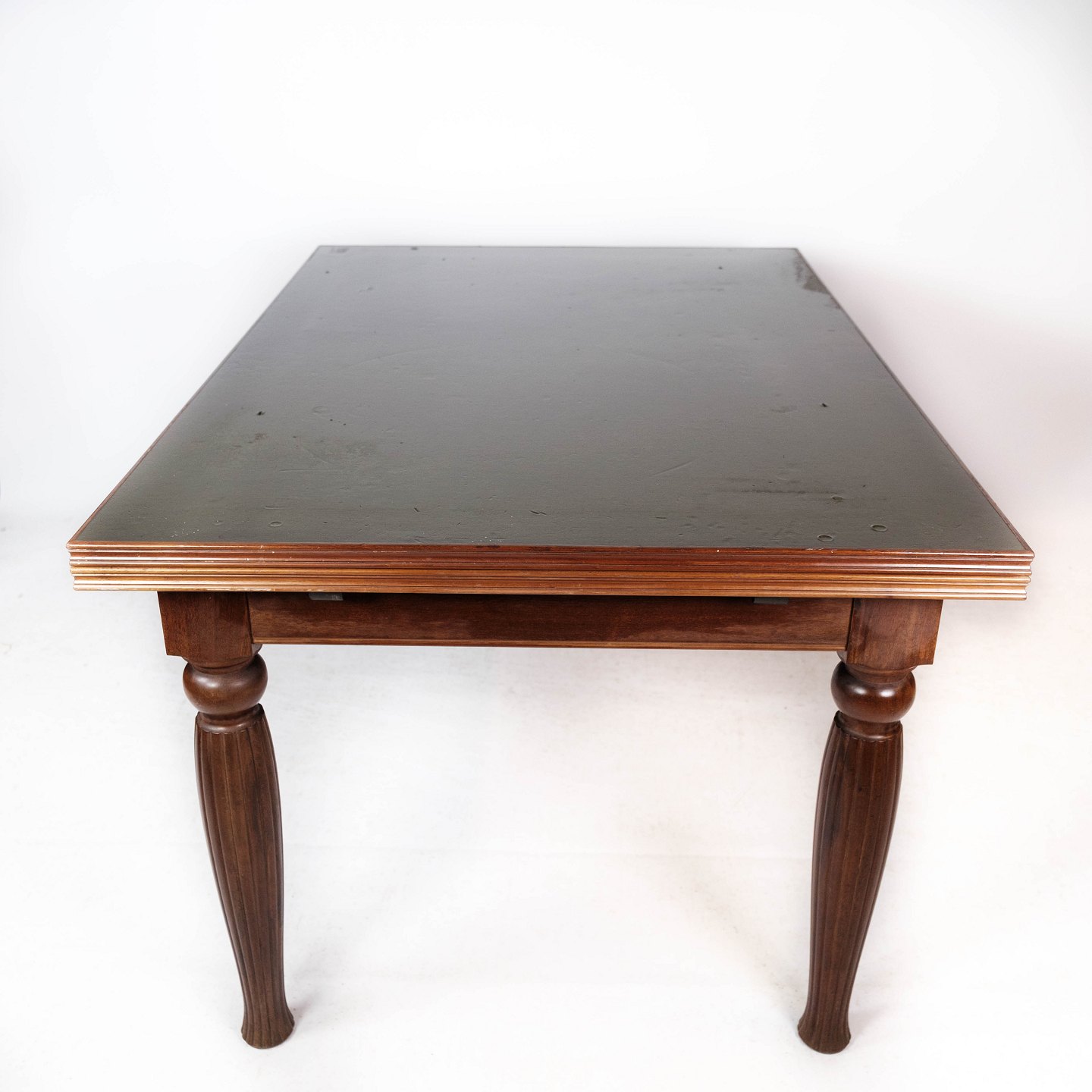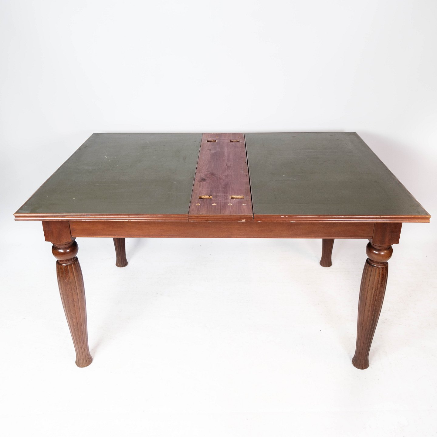 SolgtSpisebord i mahogni med mørk linoleum plade og udtræk, i flot antik stand fra omkring 1930.